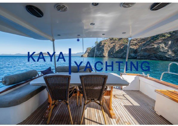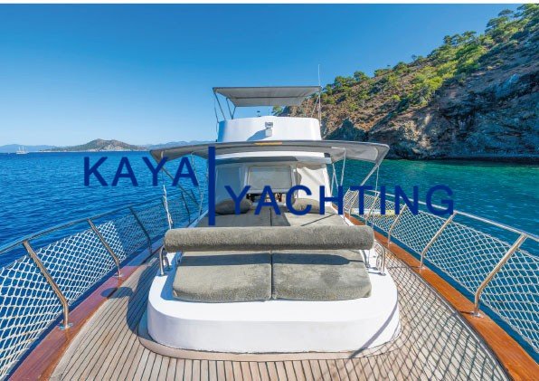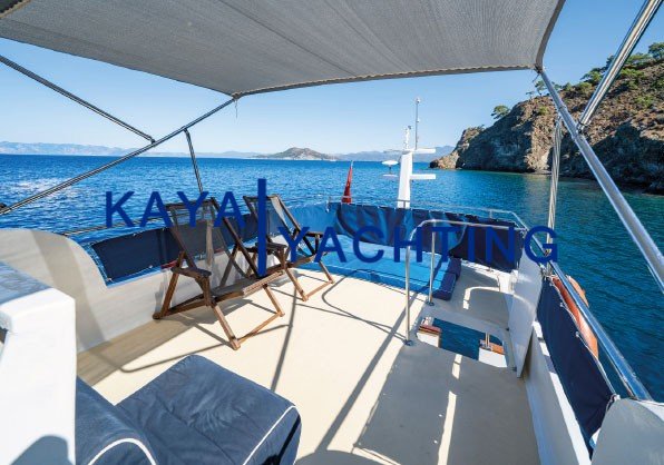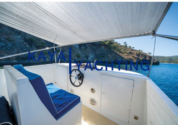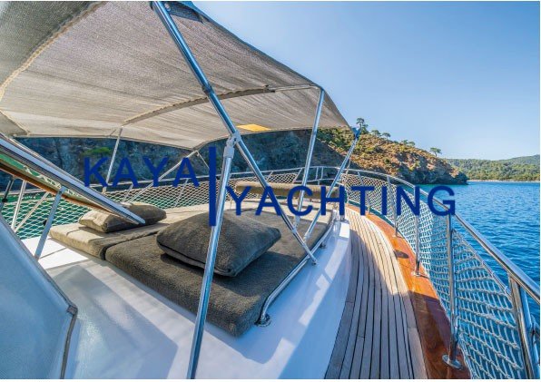 Spacious Sunbathing Areas: On the forward deck and the upper level of the yacht, there are spacious areas equipped with comfortable cushions for you to relax under the Fethiye sun , , . The blue and white cushions perfectly match the sea view.