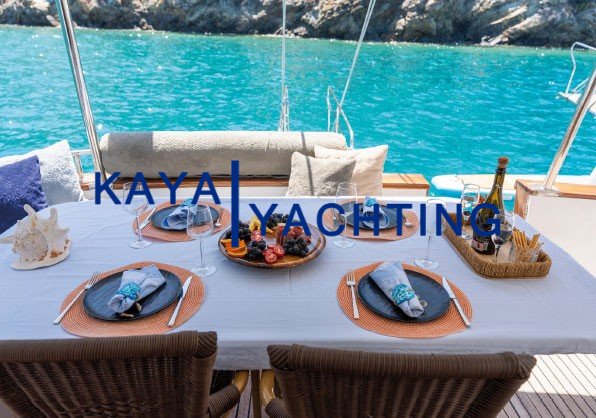 Outdoor Dining Area: A stylish table setting is arranged on the aft deck overlooking the sea , . You can enjoy unforgettable moments here with the complimentary special lunch and treats served. High-quality tableware and wine bottle/glass details emphasize the quality of the service offered , .