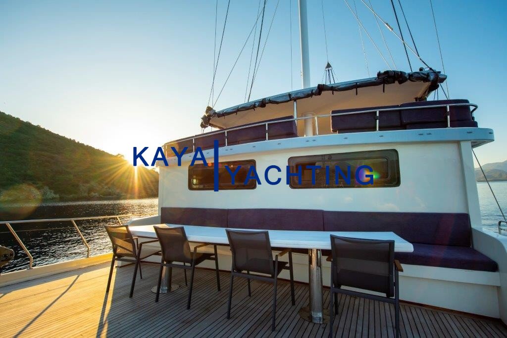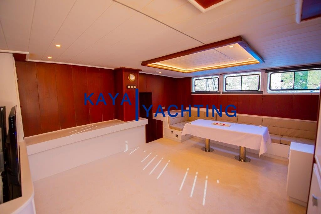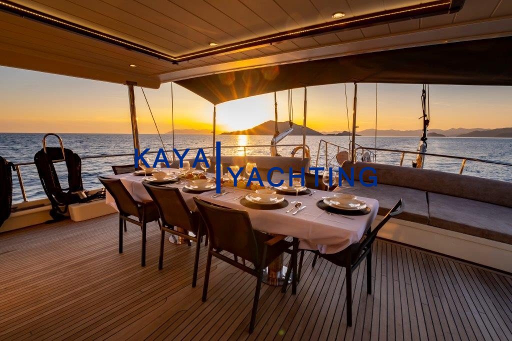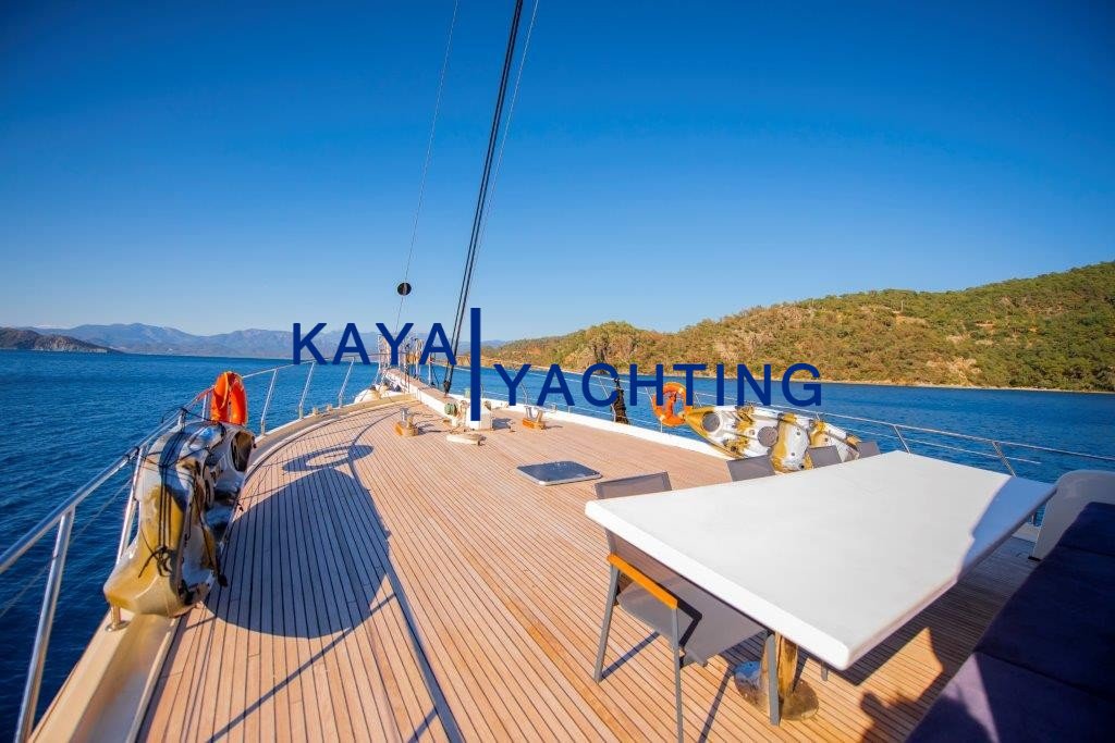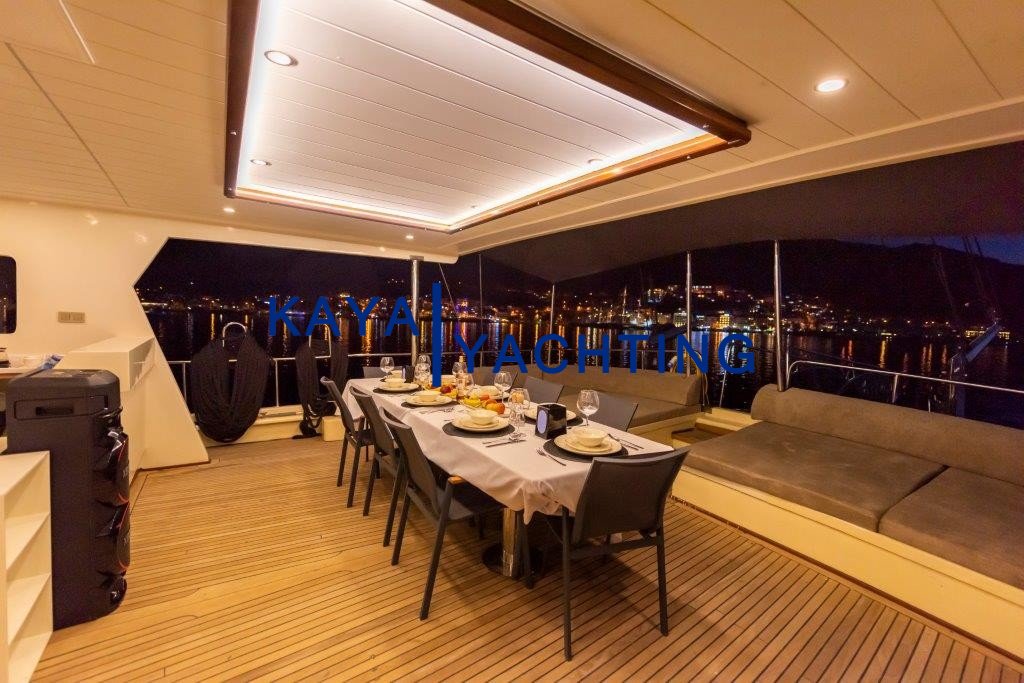 Fore and Aft Decks: The elegant dining table located in the spacious aft cockpit is designed for you to taste the unique flavors of Mediterranean cuisine. The large sunbathing cushions and seating groups on the foredeck create a private space for you to enjoy the sun and wind all day long.