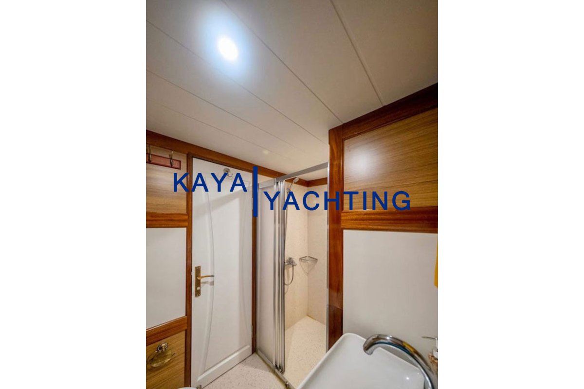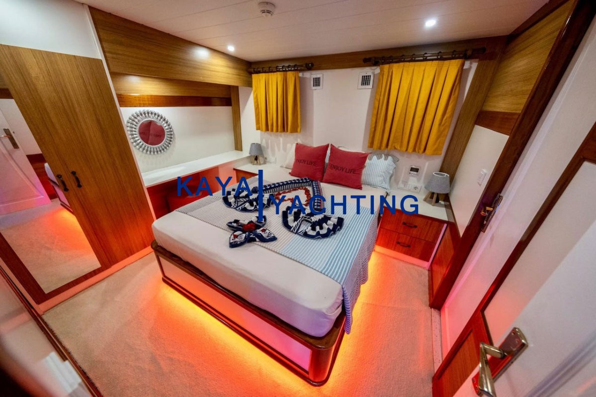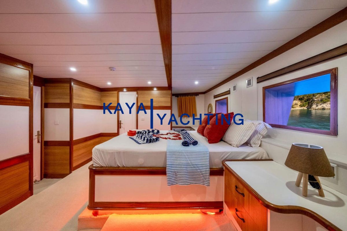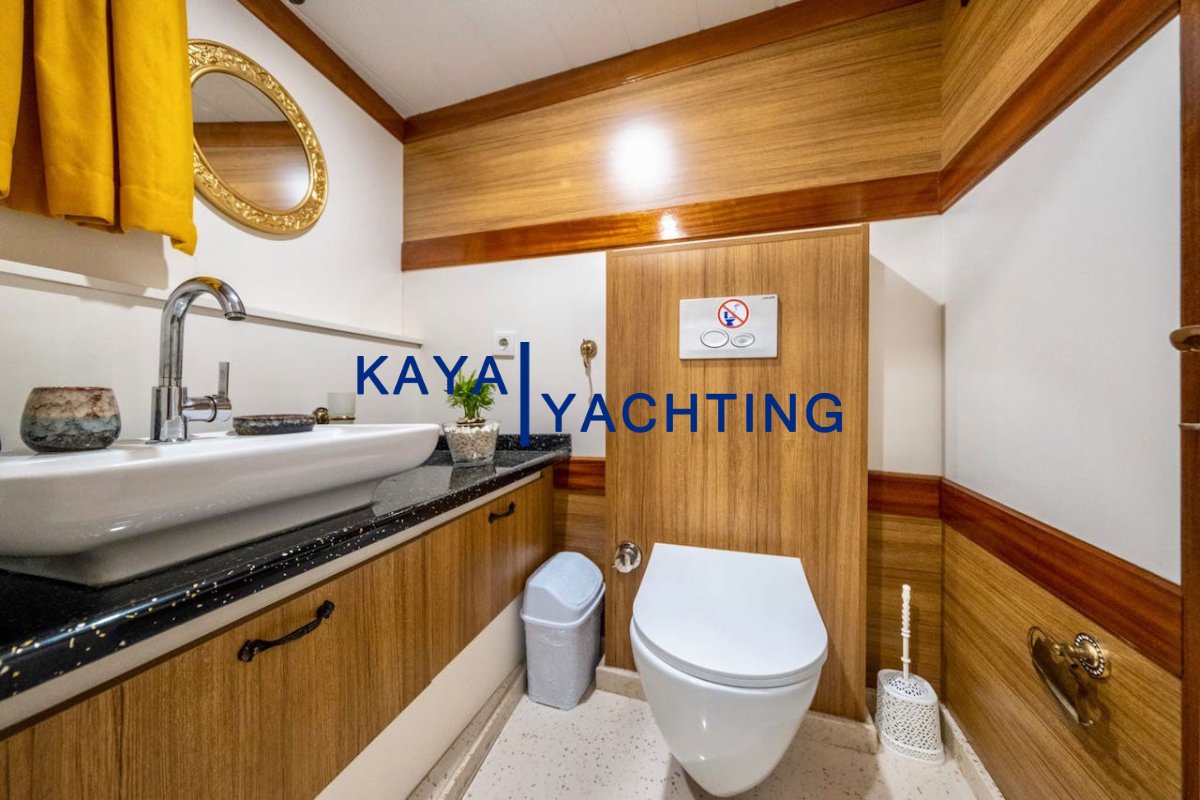 2 Master Cabins: This feature, rare on a 24-meter gulet, allows two couples or two families to experience the highest level of comfort. They are spacious, bright, and equipped with luxurious details.