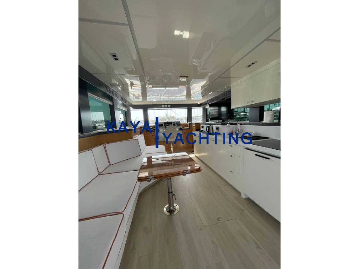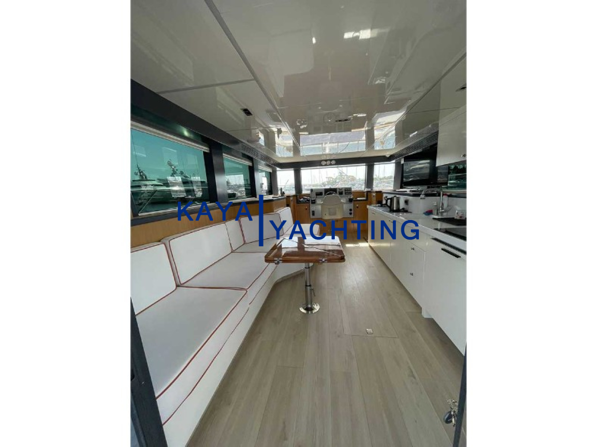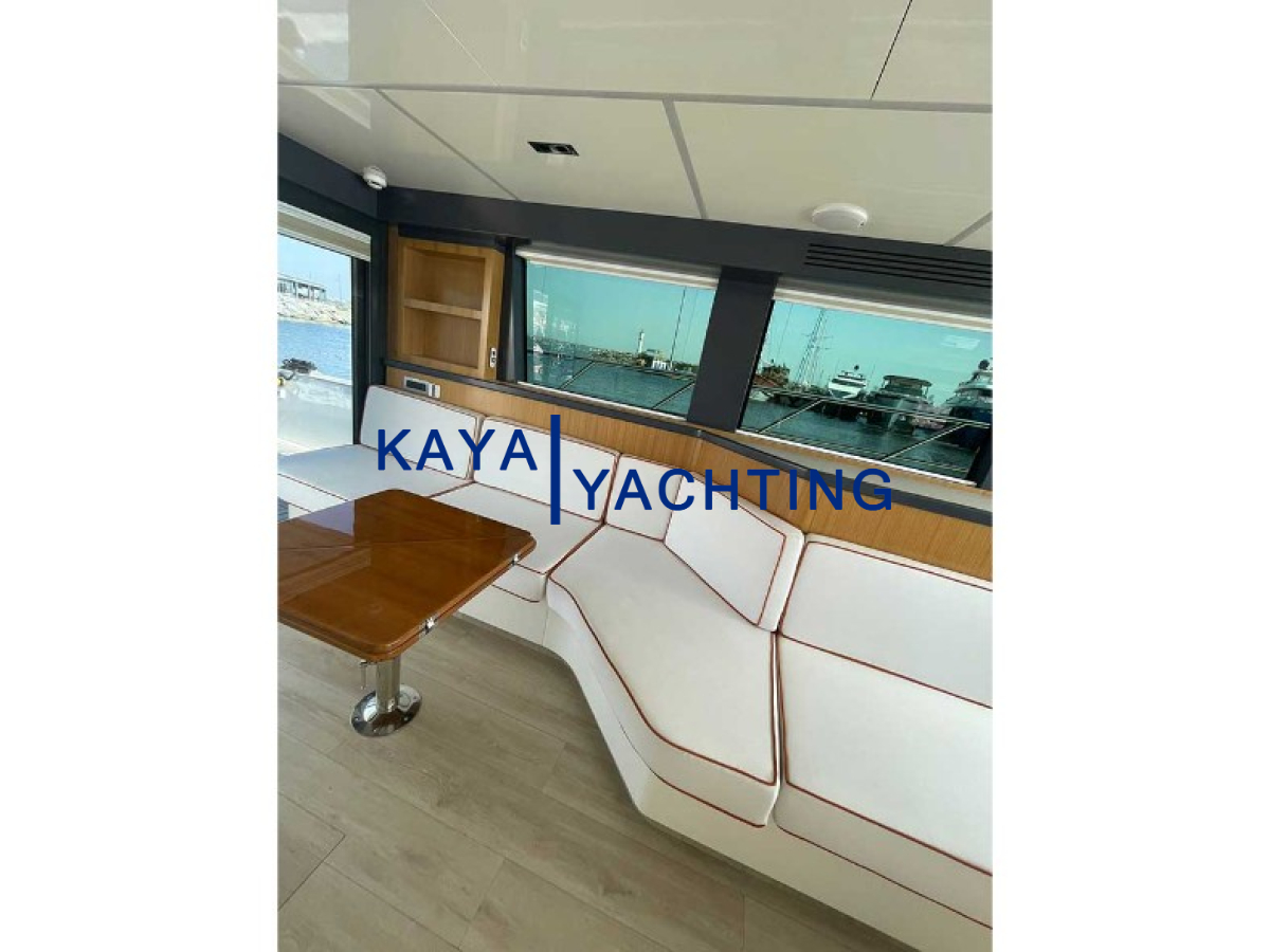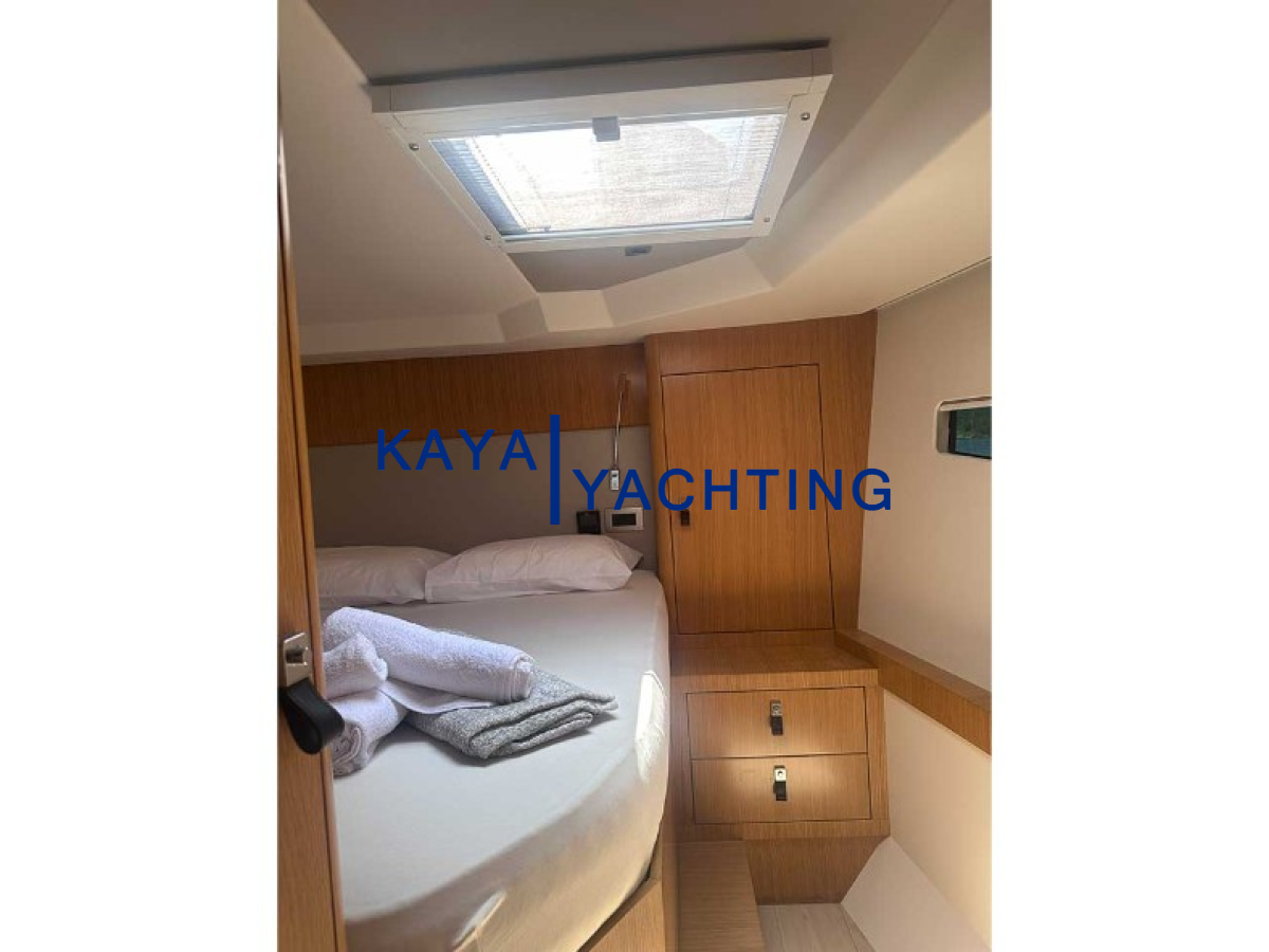 DG Power Katamaran Fly43, seyir kolaylığı ve güvenliği konusunda beklentileri fazlasıyla karşılar. Yüksek konumlandırılmış dümen istasyonu, kaptana geniş ve engelsiz bir görüş alanı sunar; bu sayede seyir sırasında çevrenizi rahatlıkla kontrol edebilir ve manevralarınızı güvenle gerçekleştirebilirsiniz. Dümen istasyonu, modern bir direksiyon simidi ve hassas motor kontrolleri ile donatılmıştır, bu da teknenin kolay ve sezgisel bir şekilde yönetilmesini sağlar. Konaklama alanlarından ayrı konumlandırılmış motor daireleri, teknenin içindeki gürültü seviyesini minimuma indirirken, Yanmar dizel motorlar güçlü ve güvenilir bir performans sunar. Fly43, hem deneyimli denizciler hem de yeni başlayanlar için güvenli ve keyifli bir seyir deneyimi vaat eder.