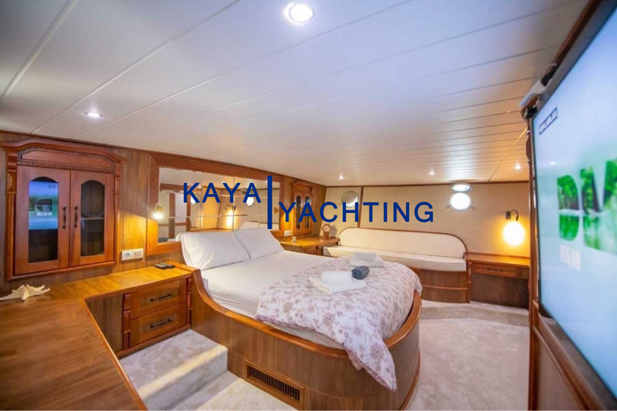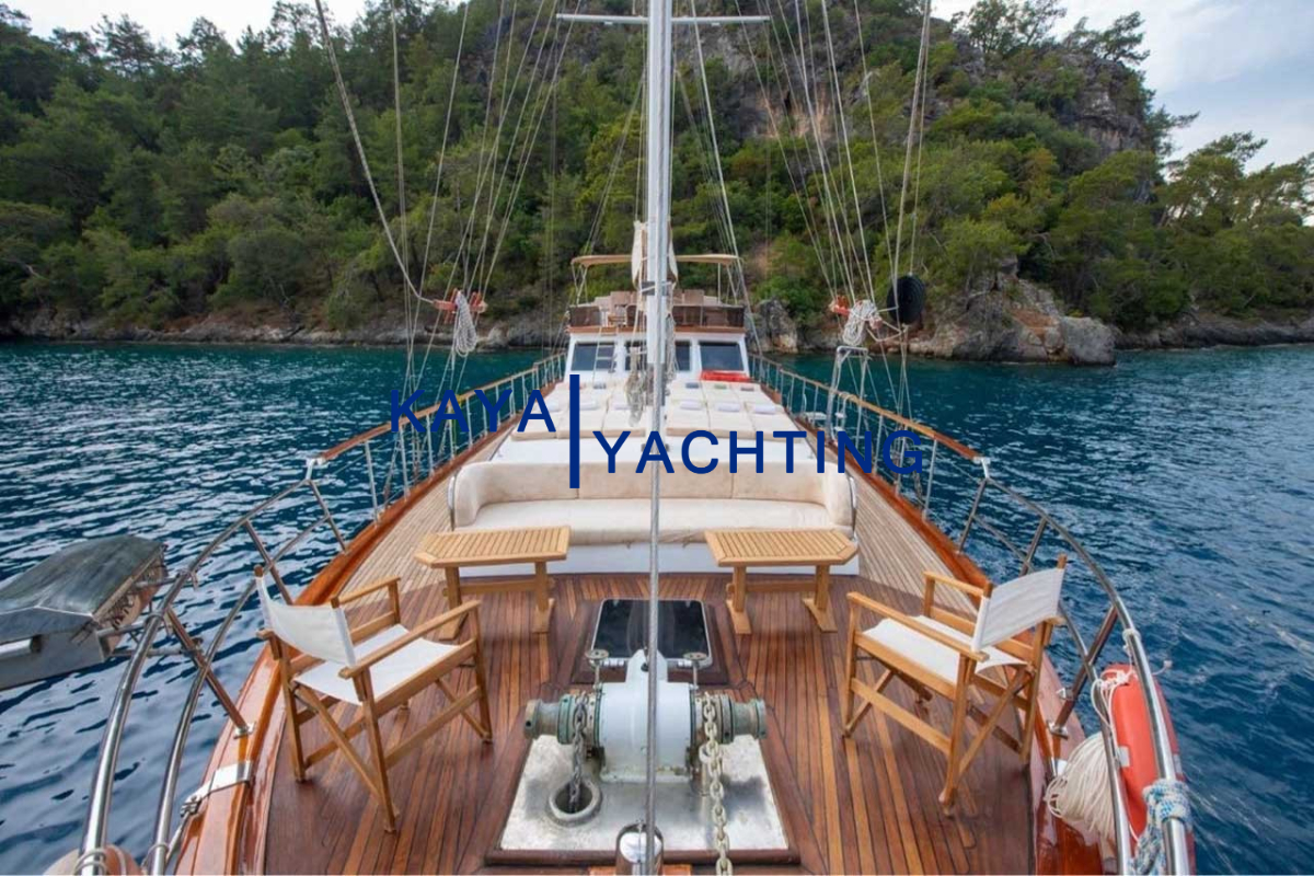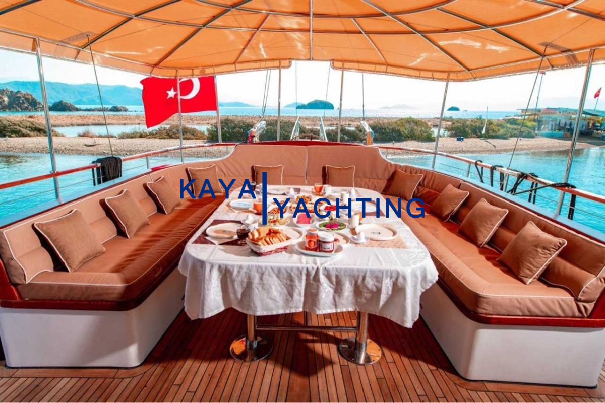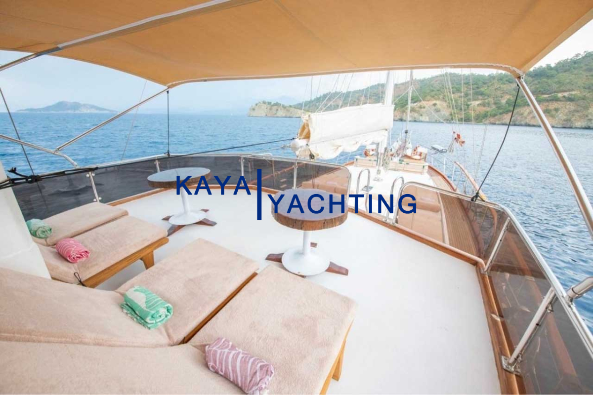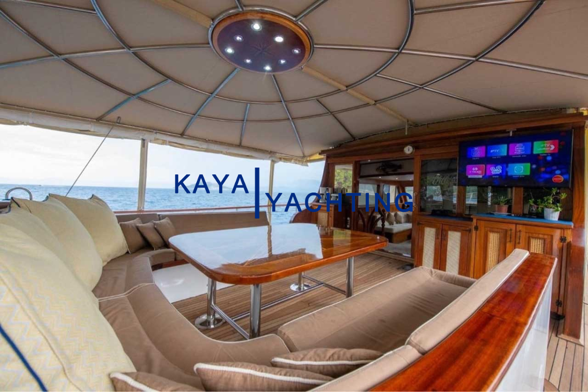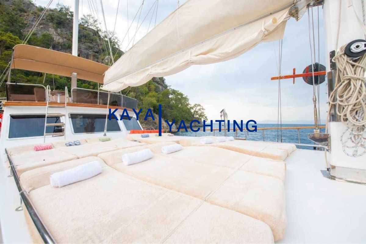 Afilli'nin en dikkat çekici özelliklerinden biri, teknenin kıç kısmında yer alan geniş oturma alanı ve güneşlenme teraslarıdır. Burada, gün batımını izlerken veya yıldızların altında keyifli sohbetler ederken eşsiz bir atmosferin tadını çıkarabilirsiniz. Geniş minderli alanlar, güneşlenmek isteyenler için ideal bir ortam sunarken, gölgelik alanlar da serinlemek isteyen misafirler düşünülerek tasarlanmıştır. Bu alanlar, özellikle akşam yemekleri ve özel kutlamalar için mükemmel bir buluşma noktasıdır. Misafirlerimiz, burada lezzetli yemeklerin ve serinletici içeceklerin tadını çıkarırken, bir yandan da Akdeniz'in huzurlu esintisini hissedebilirler.