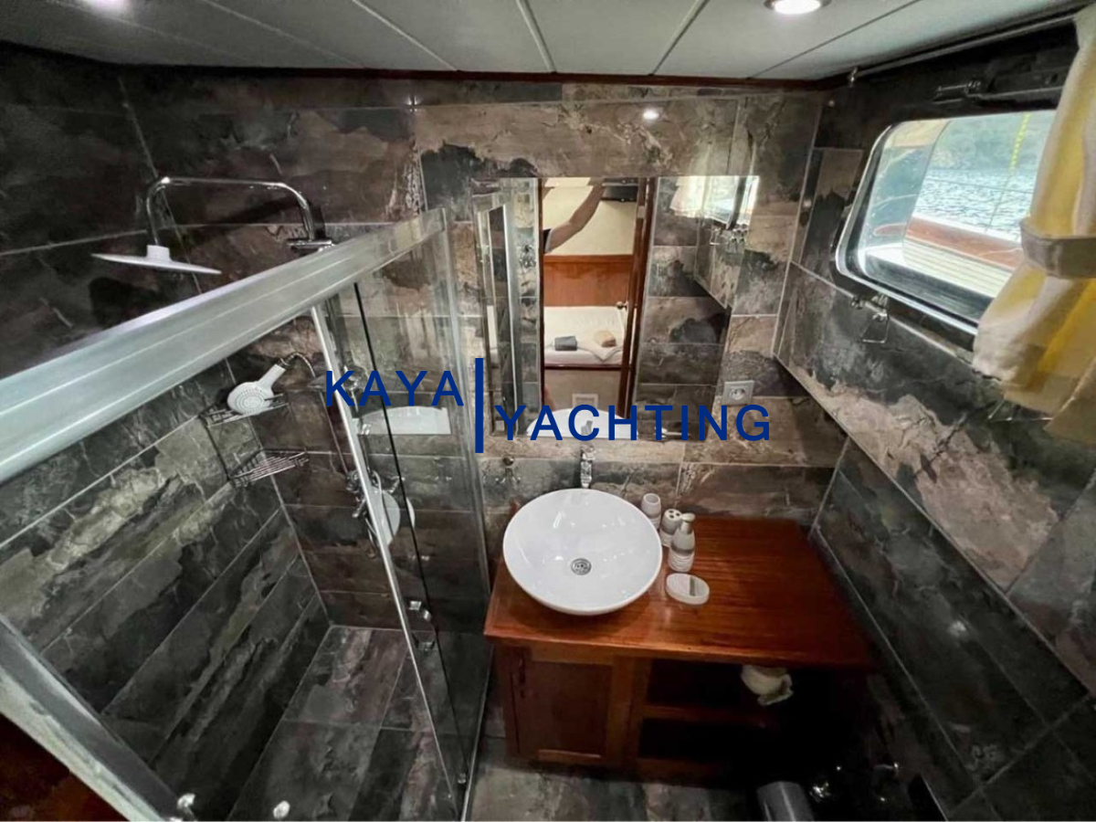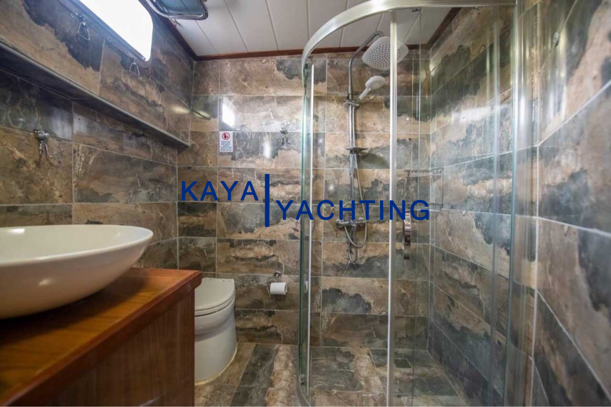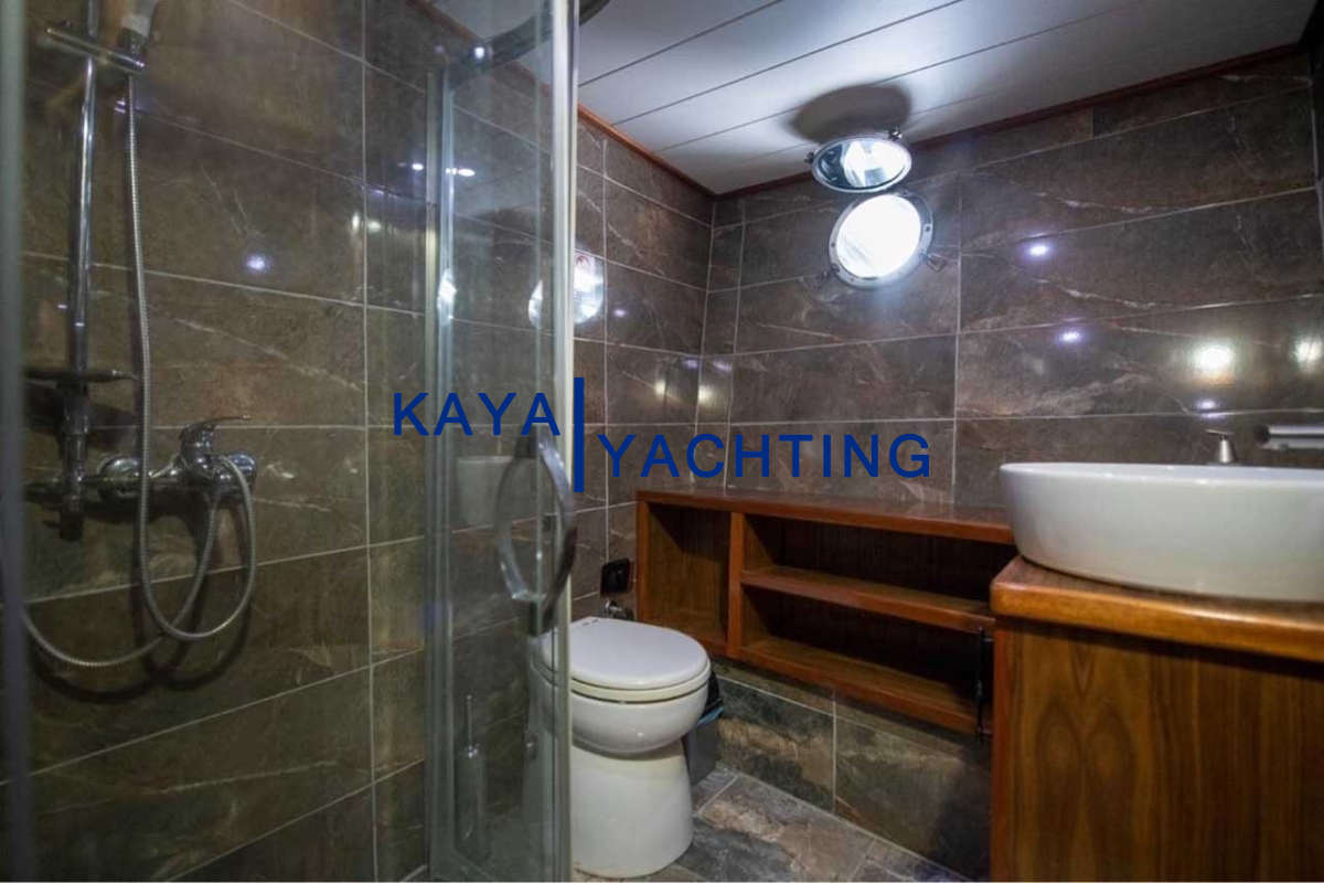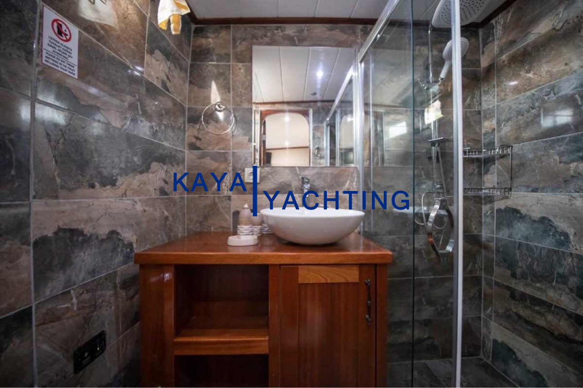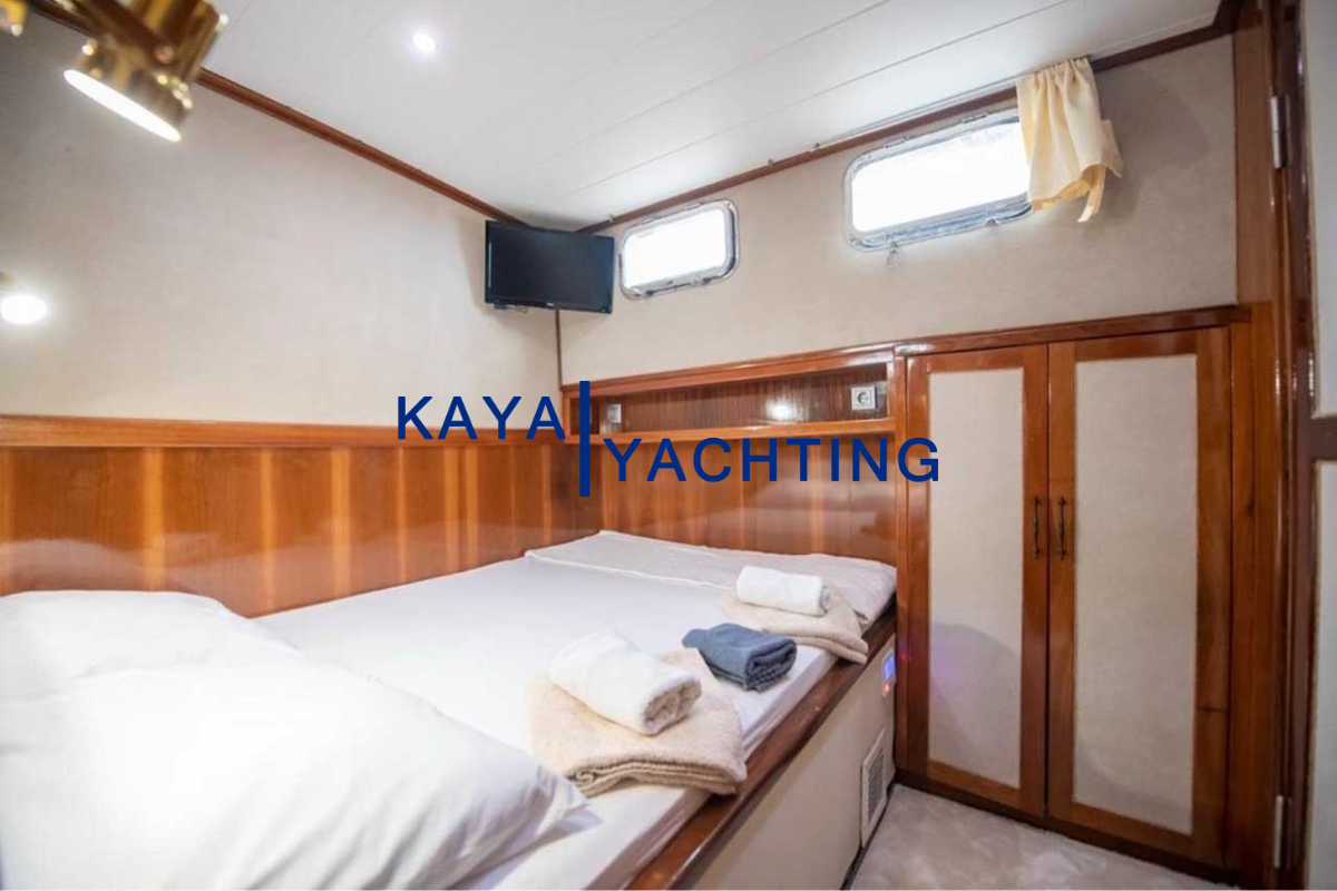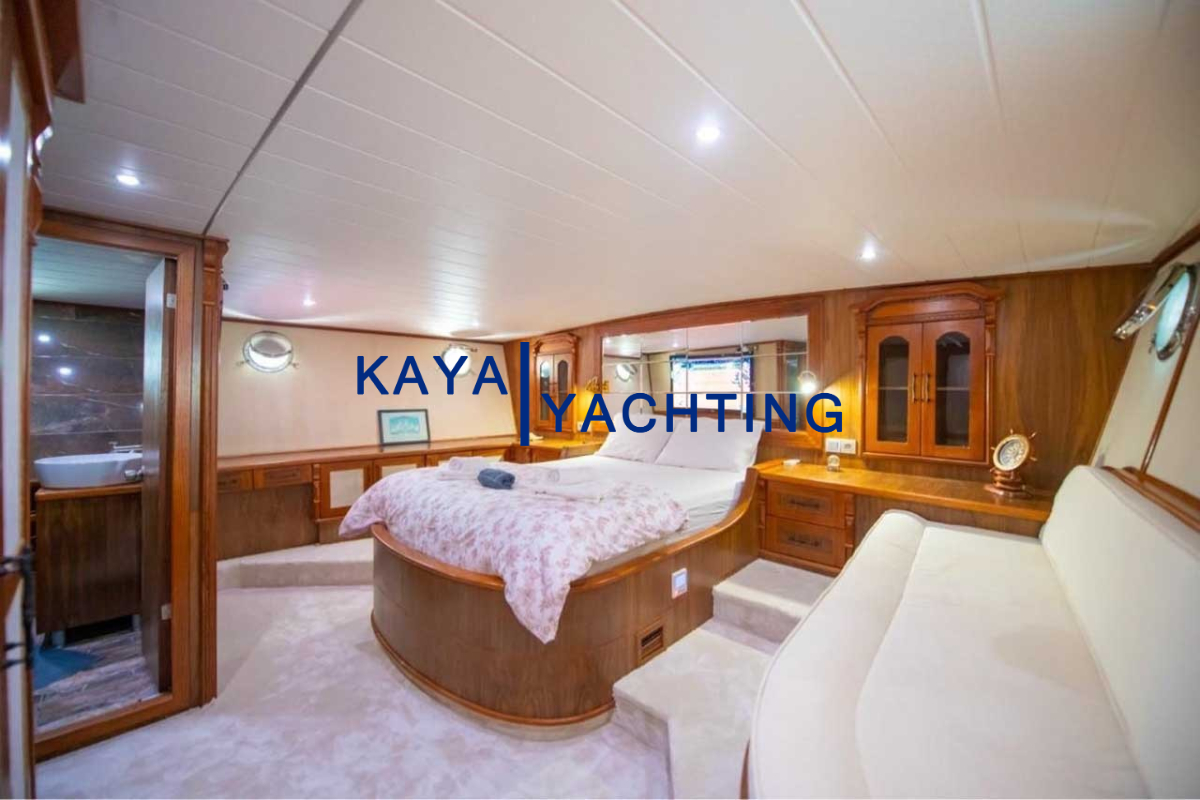 Afilli'nin en dikkat çekici özelliklerinden biri, teknenin kıç kısmında yer alan geniş oturma alanı ve güneşlenme teraslarıdır. Burada, gün batımını izlerken veya yıldızların altında keyifli sohbetler ederken eşsiz bir atmosferin tadını çıkarabilirsiniz. Geniş minderli alanlar, güneşlenmek isteyenler için ideal bir ortam sunarken, gölgelik alanlar da serinlemek isteyen misafirler düşünülerek tasarlanmıştır. Bu alanlar, özellikle akşam yemekleri ve özel kutlamalar için mükemmel bir buluşma noktasıdır. Misafirlerimiz, burada lezzetli yemeklerin ve serinletici içeceklerin tadını çıkarırken, bir yandan da Akdeniz'in huzurlu esintisini hissedebilirler.