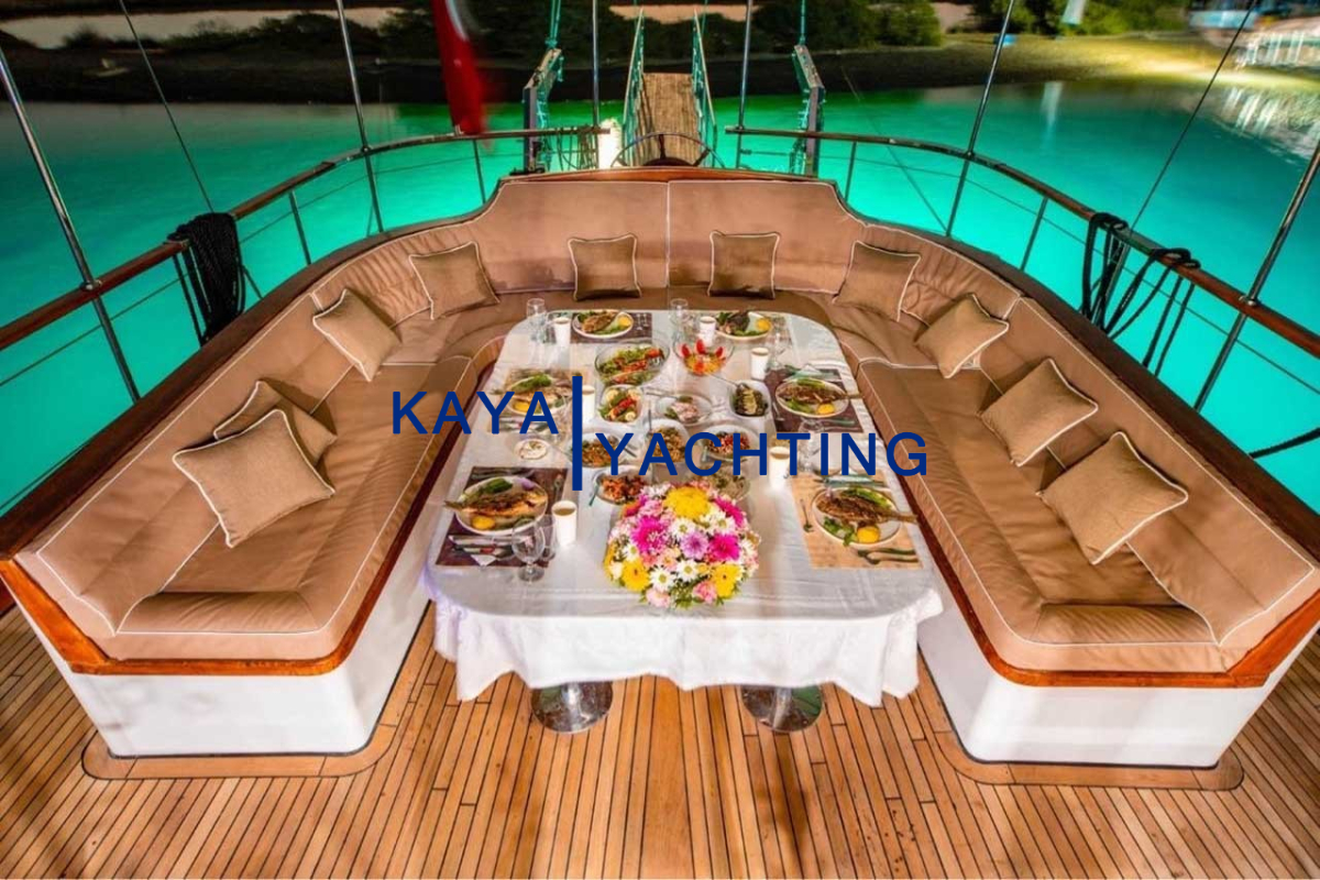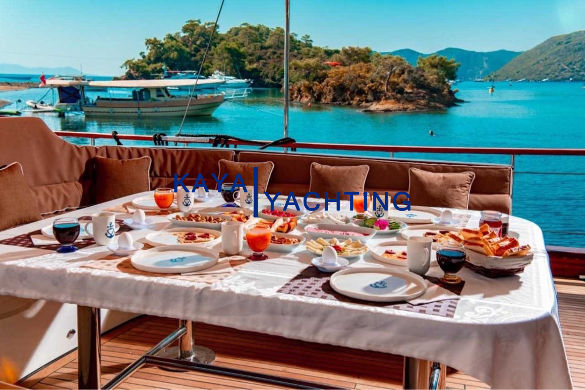 Teknemizin mutfağında, deneyimli aşçımız tarafından günlük olarak taze ve yerel ürünlerle hazırlanan Akdeniz mutfağının en seçkin lezzetlerini tatma fırsatına sahip olacaksınız. Kahvaltıdan akşam yemeğine kadar her öğün, damak zevkinize uygun olarak özenle hazırlanır. Özel diyet tercihleri veya alerjileri olan misafirlerimiz için de özel menü seçenekleri sunulmaktadır. Akşam yemeğinizi yıldızların altında, denizin ortasında yemek, Gulet Afilli deneyiminin en unutulmaz anlarından biri olacaktır.