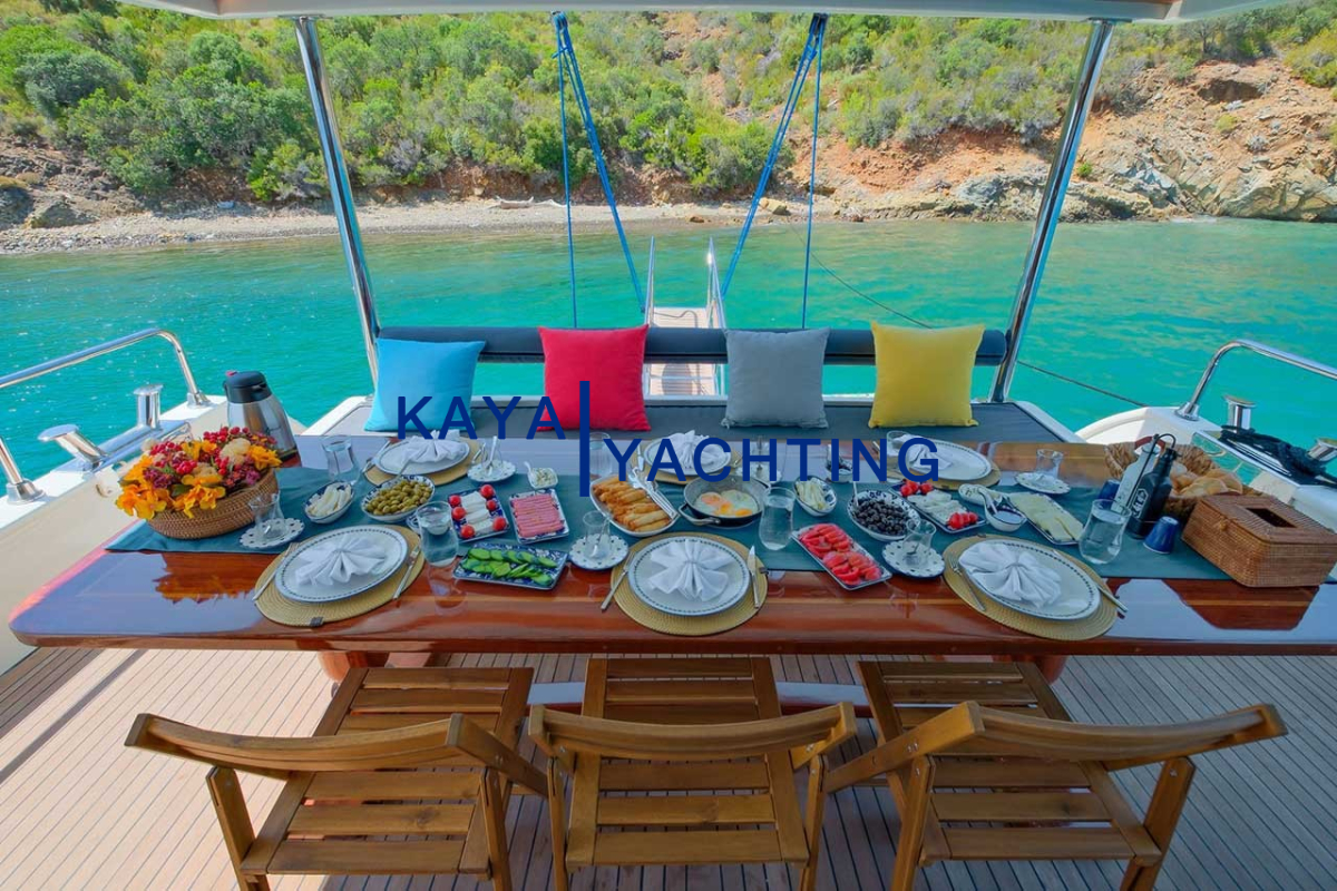 Mavi yolculuğunuz boyunca Anes Gulet'te sizlere deneyimli 2 kişilik bir mürettebat eşlik edecektir: bir kaptan ve bir aşçı/gemici. Kaptanımız, Göcek'in gizli koylarını ve en güzel demirleme noktalarını keşfetmenizi sağlarken, bölgenin eşsiz güzelliklerini en iyi şekilde deneyimlemenizi sağlar. Aşçımız ise yöresel Ege lezzetlerinden dünya mutfaklarına kadar uzanan geniş bir yelpazede lezzetli yemeklerle damaklarınızı şenlendirecek. Taze deniz ürünleri ve yöresel malzemelerle hazırlanan bu özel menüler, tatilinize gastronomi zevki katacaktır. Mürettebatımız, güler yüzlü ve profesyonel hizmet anlayışıyla tatilinizin her anında yanınızda olacak, tüm ihtiyaçlarınızı titizlikle karşılayacaktır. Size sadece denizin ve güneşin tadını çıkarmak, huzurun ve keyfin tadını çıkarmak kalacak.