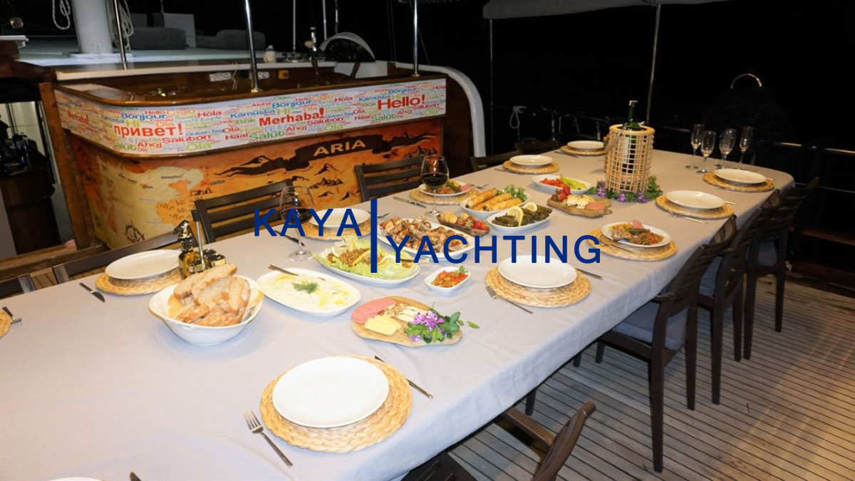 Mutfaktaki maharetleriyle de misafirlerinden tam not alan Aria Gulet, Ege ve Akdeniz mutfağının en lezzetli örneklerini sunar. Uzman şeflerimiz tarafından özenle hazırlanan taze deniz ürünleri, yöresel mezeler ve nefis ana yemeklerle damaklarınızı şenlendireceksiniz. Güne taze sıkılmış meyve suları ve zengin bir kahvaltıyla başlayıp, öğle ve akşam yemeklerinde sunulan gurme lezzetlerle tatilinizi bir lezzet şölenine dönüştürebilirsiniz. Özel diyet tercihleri veya alerjileri olan misafirlerimiz için de özel menüler hazırlanabilmektedir.