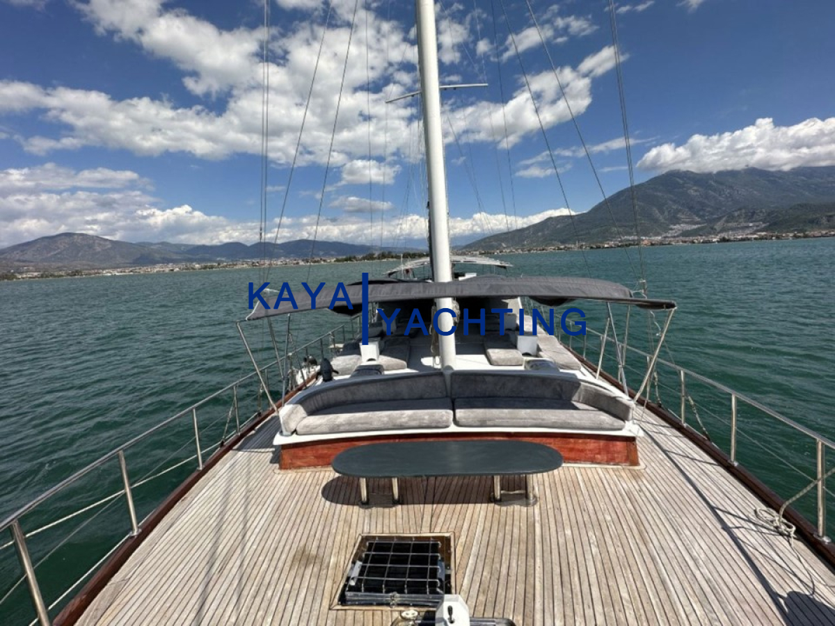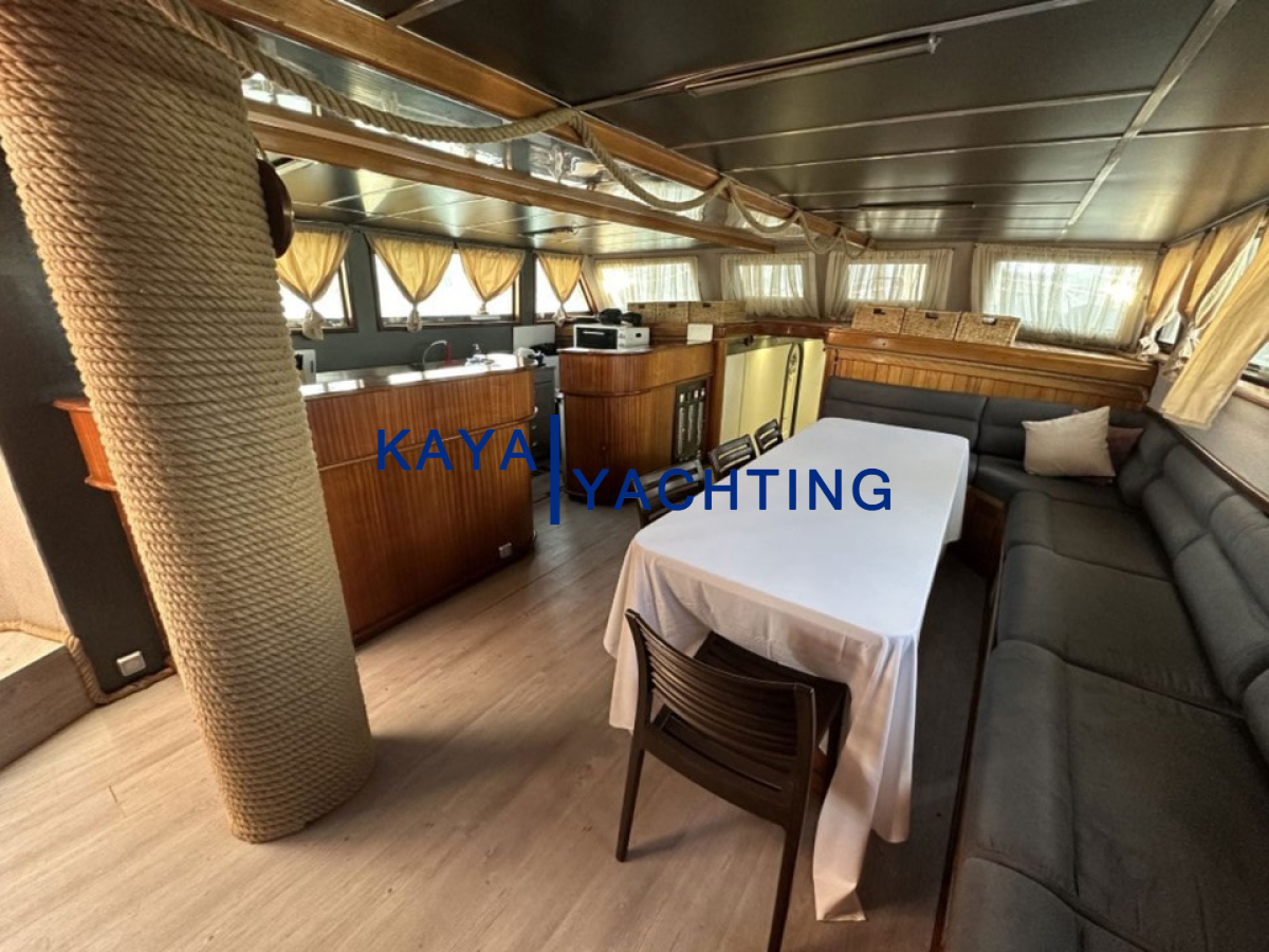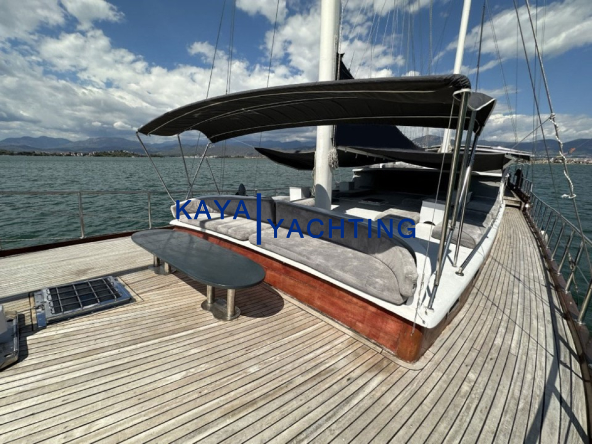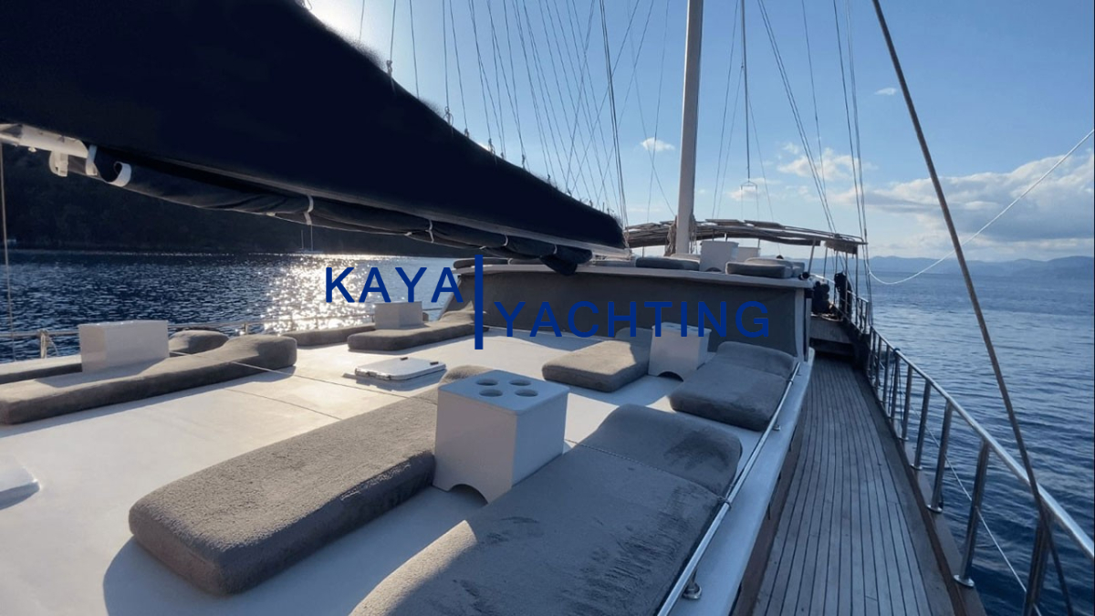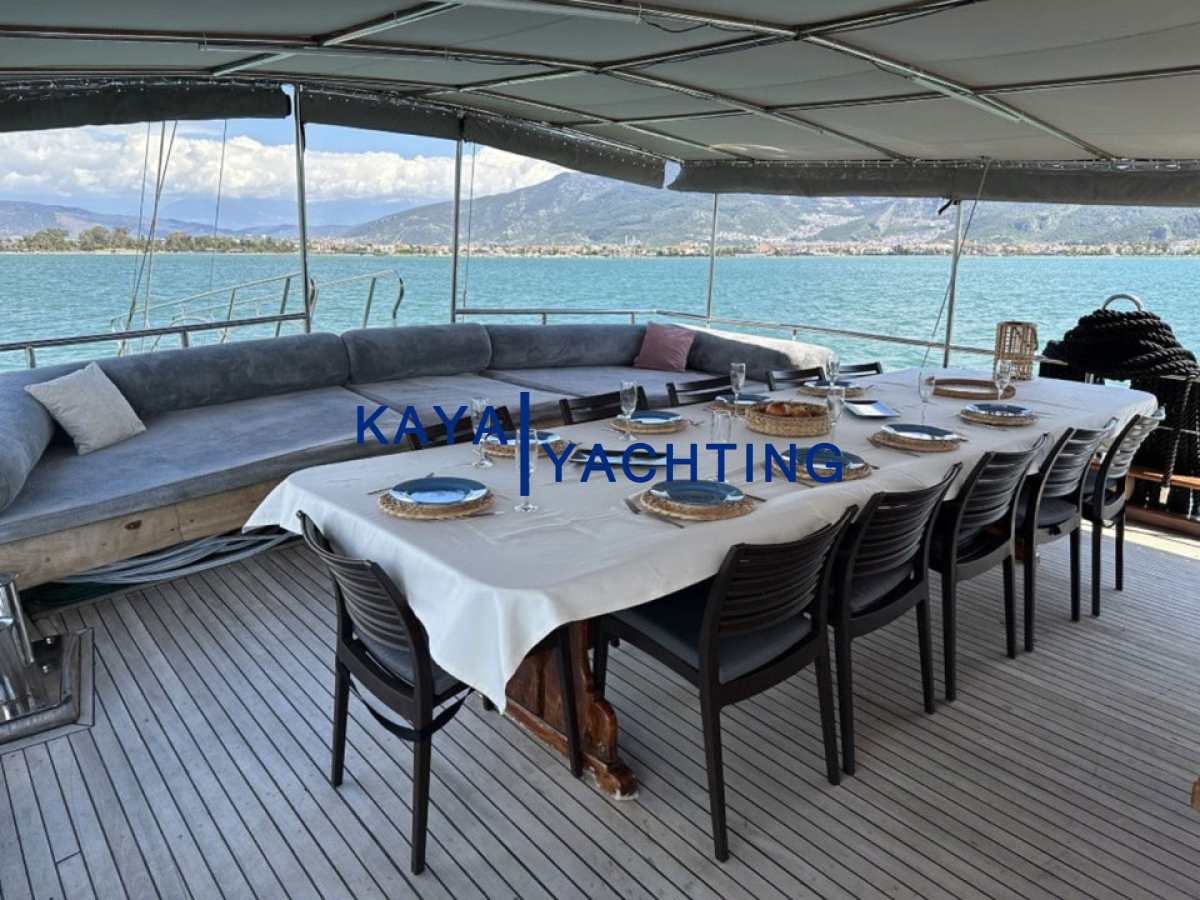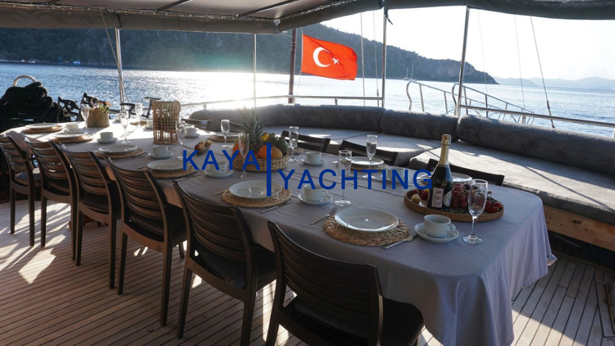 Guletin arka güvertesi ise geniş bir dinlenme alanı ve büyük bir yemek masasına ev sahipliği yapar. Burada sabah kahvaltılarınızı, öğle yemeklerinizi ve akşam yemeklerinizi Ege'nin eşsiz manzarası eşliğinde yiyebilir, sevdiklerinizle keyifli sohbetler edebilirsiniz. Açık havada yemek yemenin ve dinlenmenin tadını çıkarmak isteyenler için burası vazgeçilmez bir alandır.