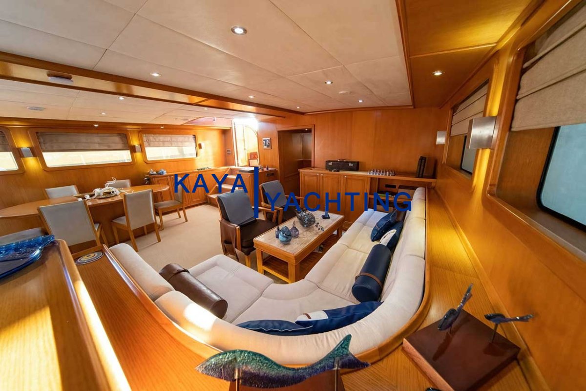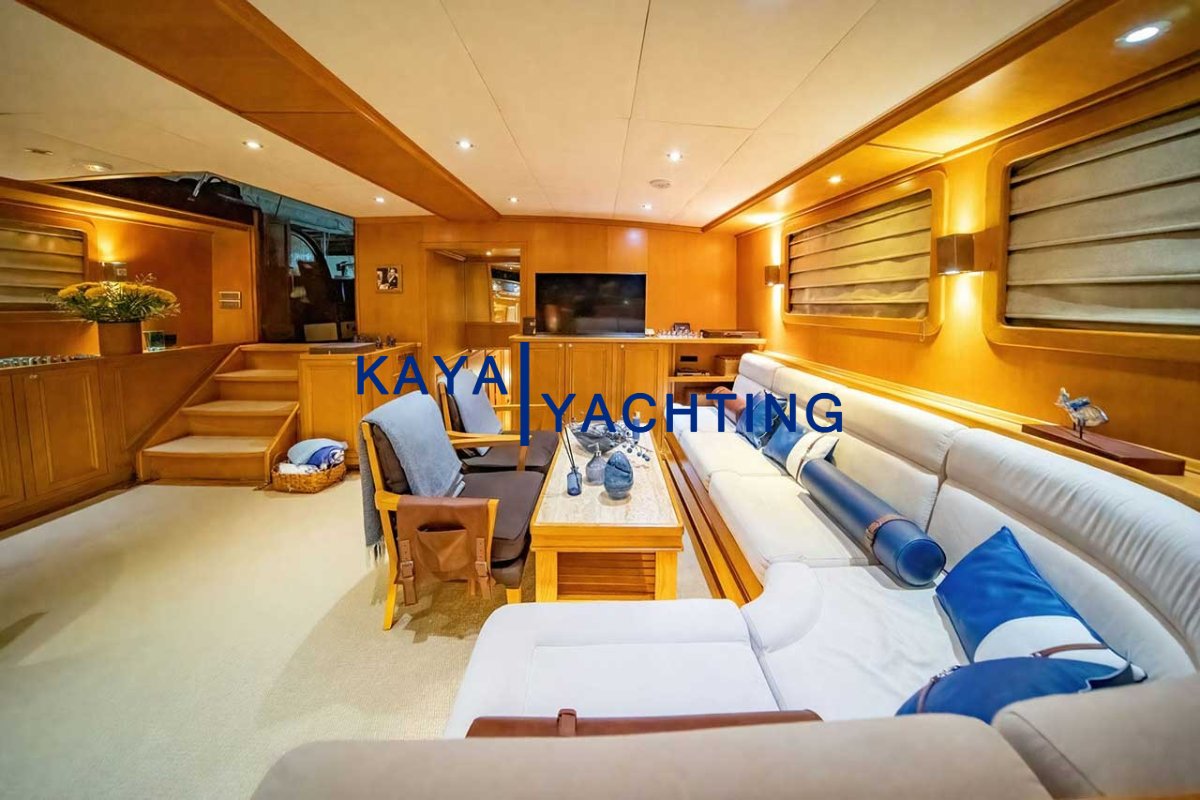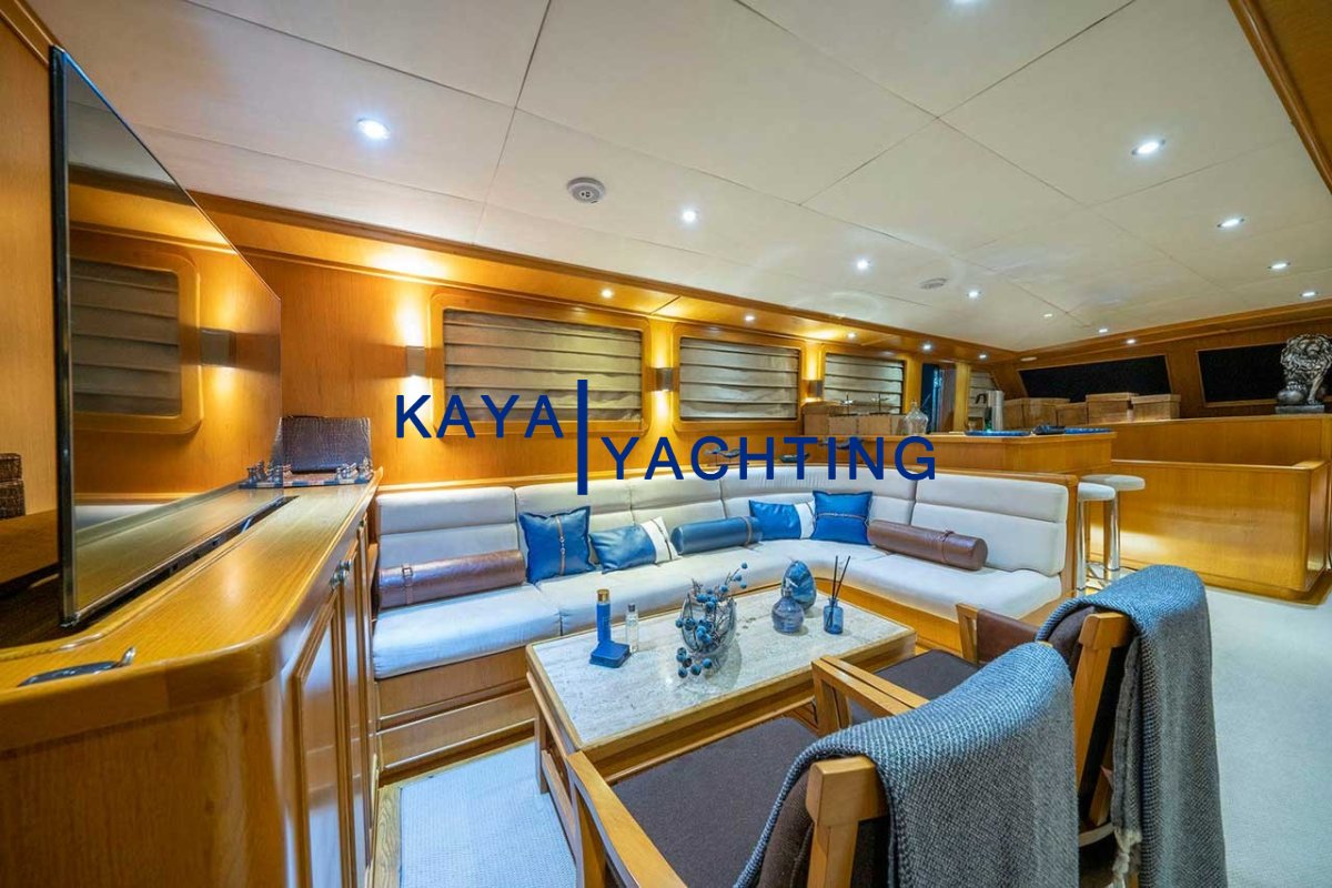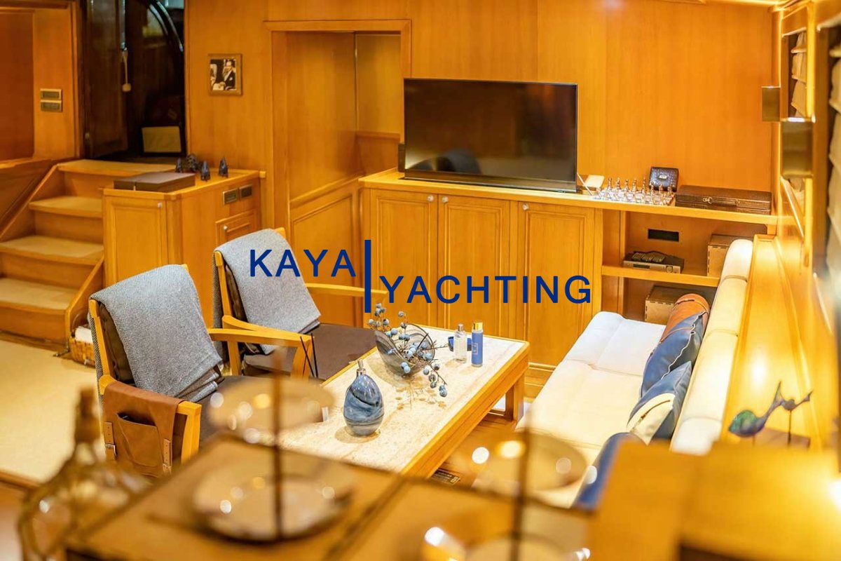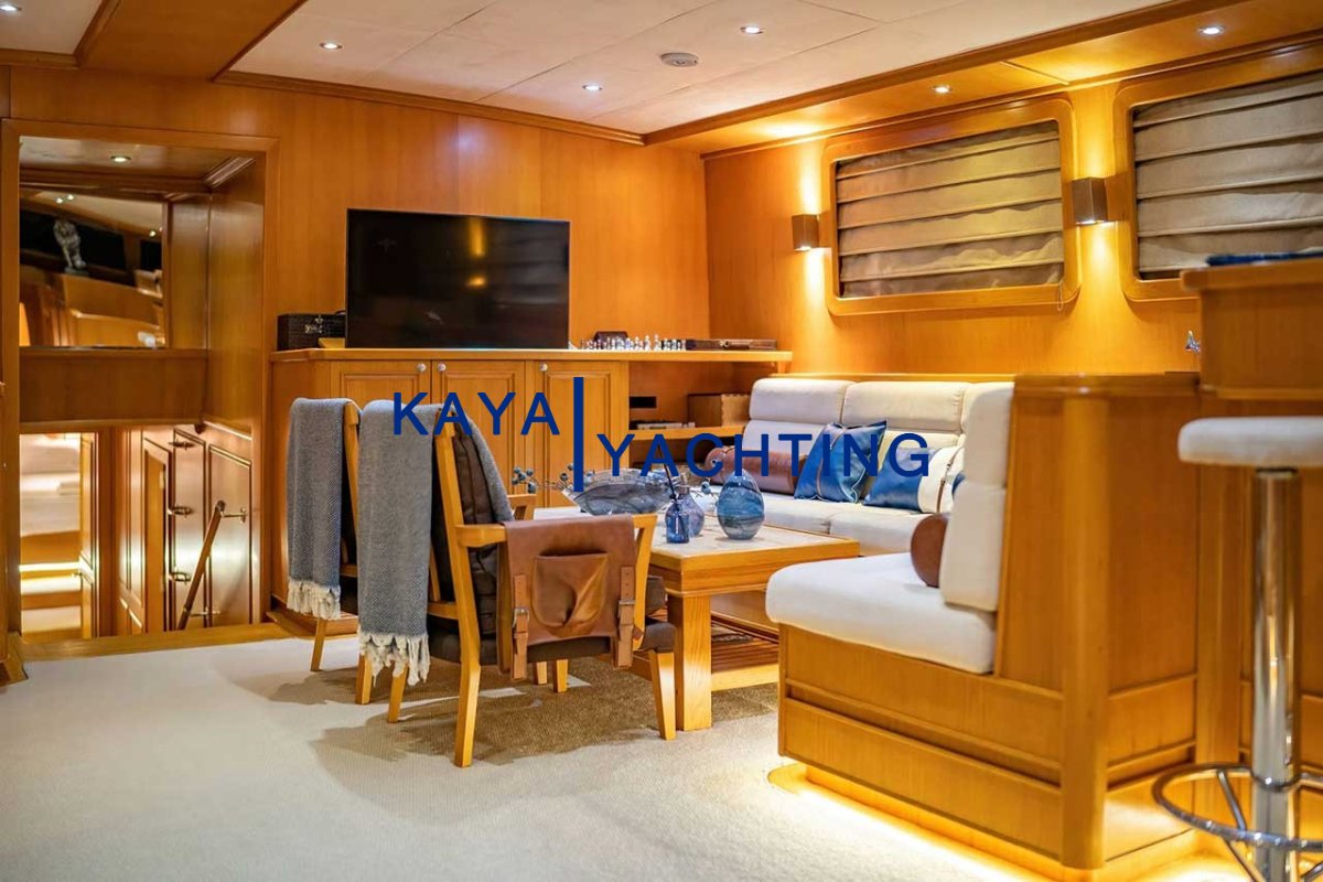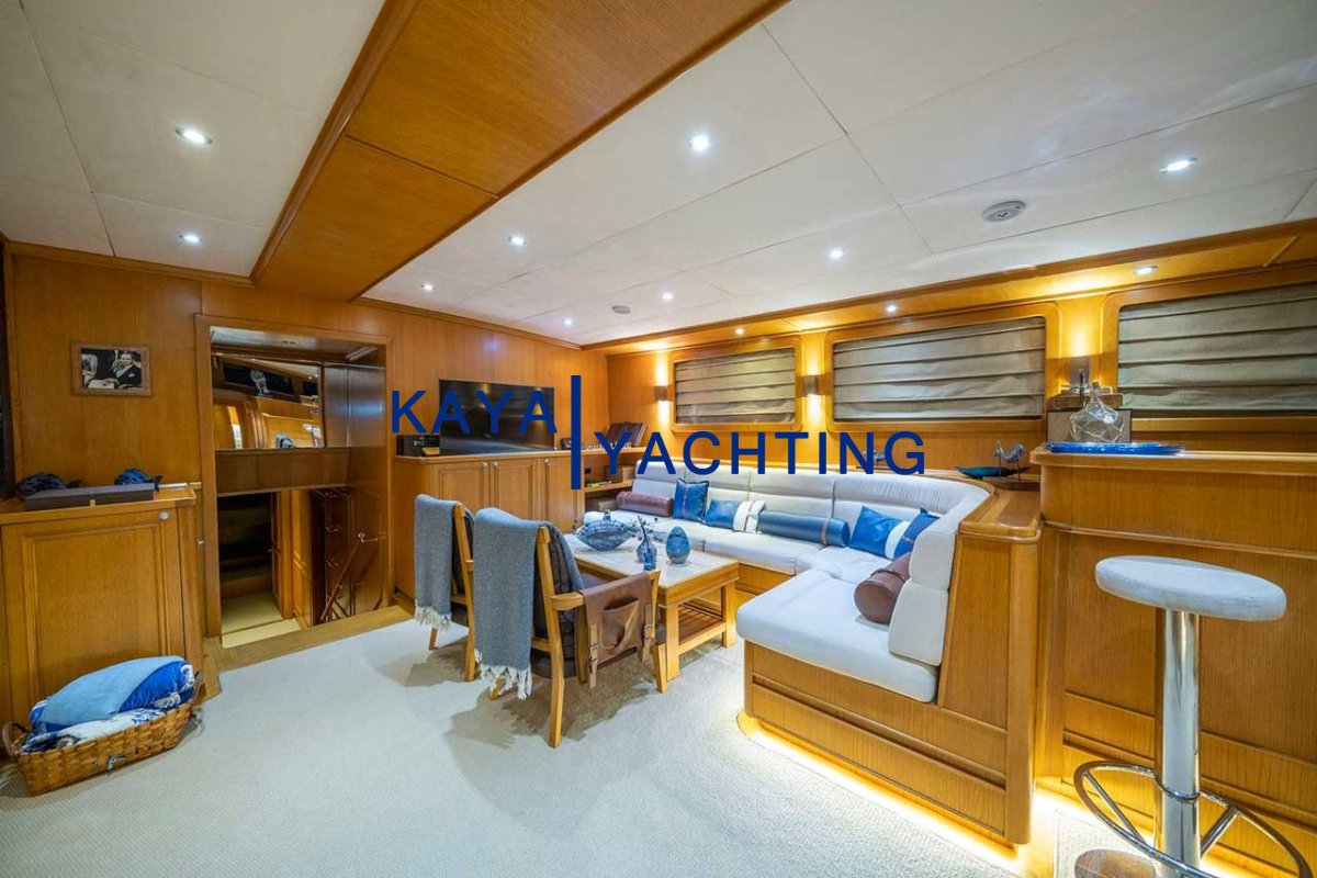 Teknenin salonu, konforlu oturma grupları, LCD TV, DVD oynatıcı ve stereo müzik sistemi ile donatılmış olup, akşamları sevdiklerinizle keyifli vakit geçirmeniz için idealdir. Ancak Babylon'un asıl cazibesi dış güvertelerindedir:
