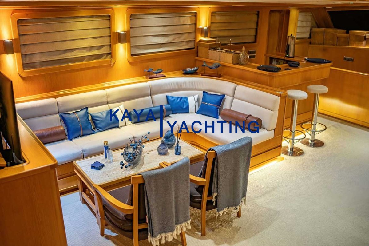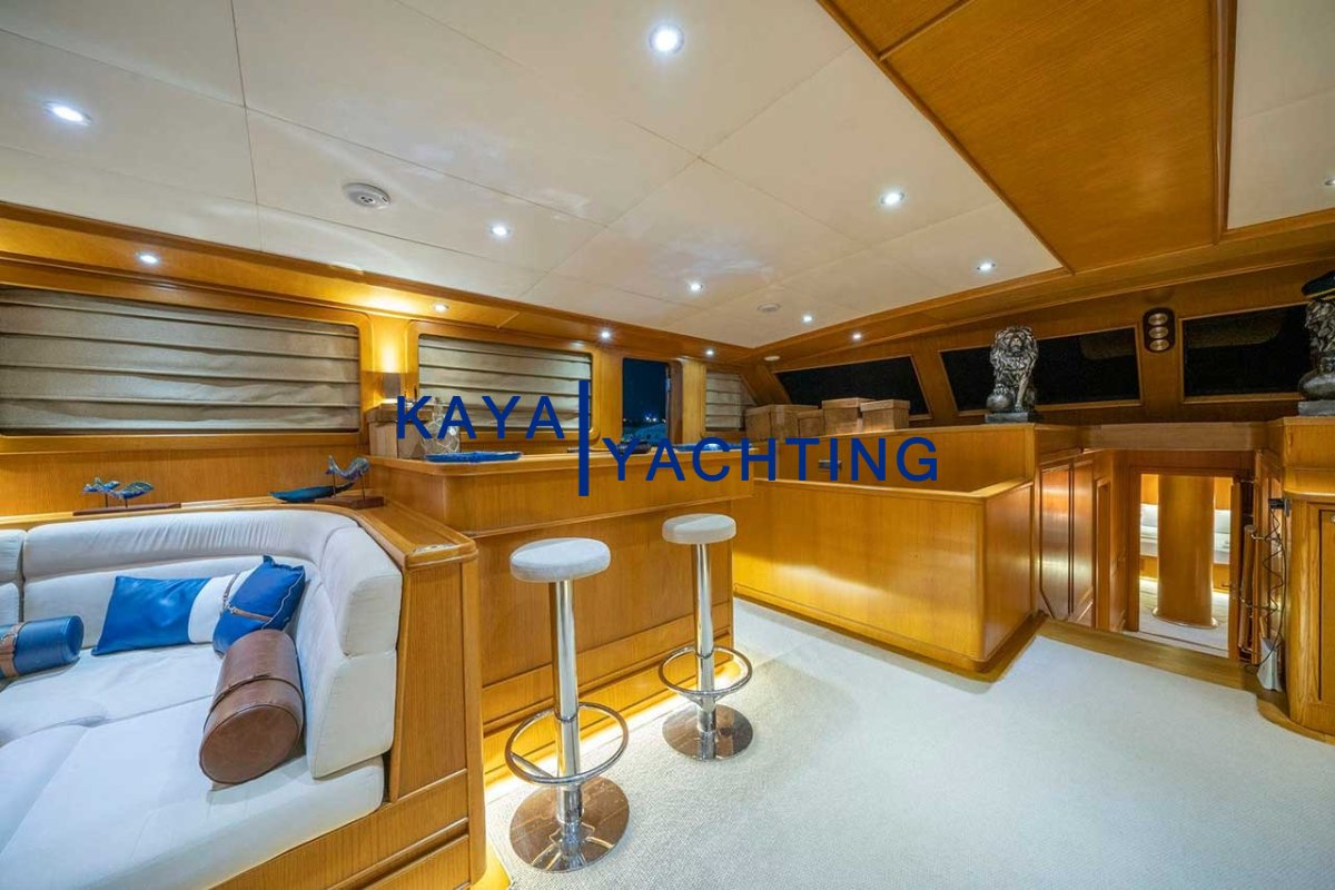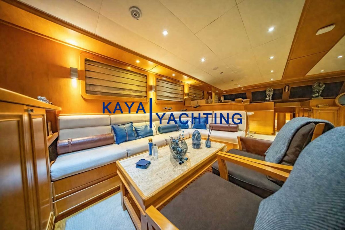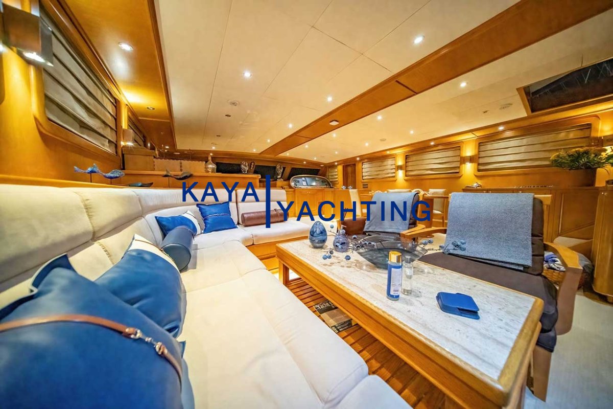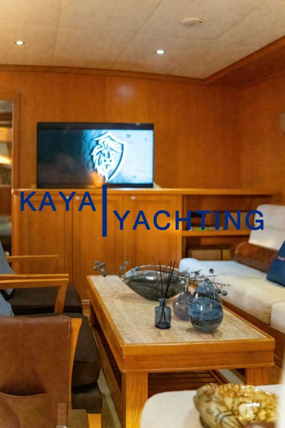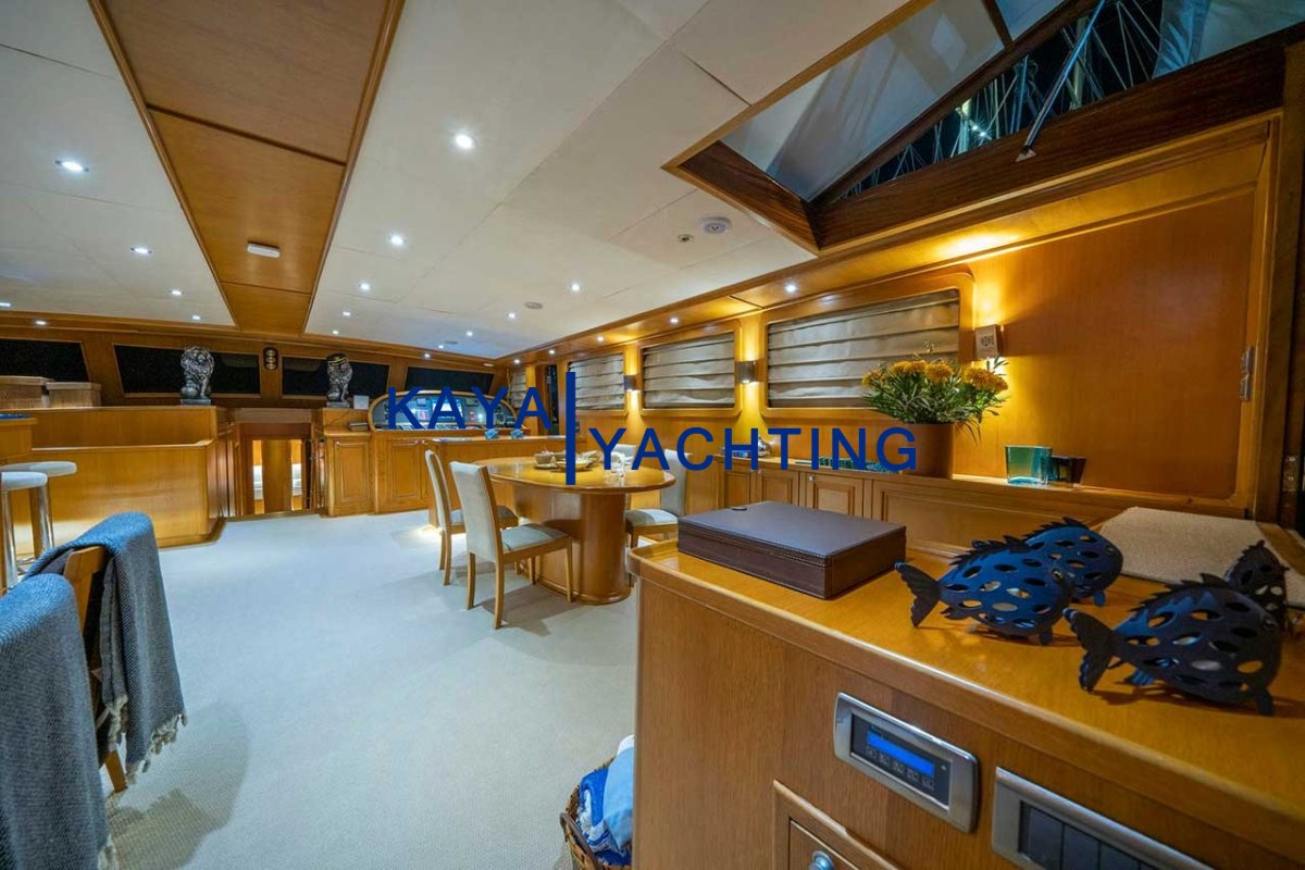 Teknenin salonu, konforlu oturma grupları, LCD TV, DVD oynatıcı ve stereo müzik sistemi ile donatılmış olup, akşamları sevdiklerinizle keyifli vakit geçirmeniz için idealdir. Ancak Babylon'un asıl cazibesi dış güvertelerindedir: