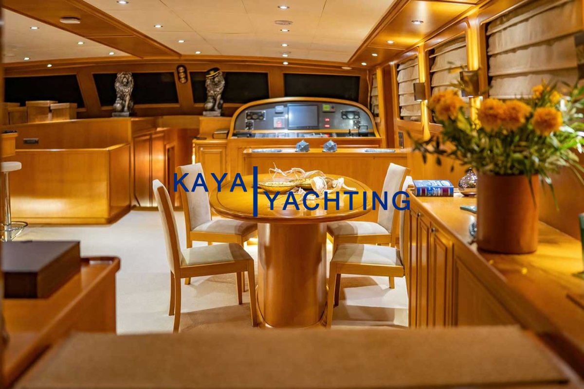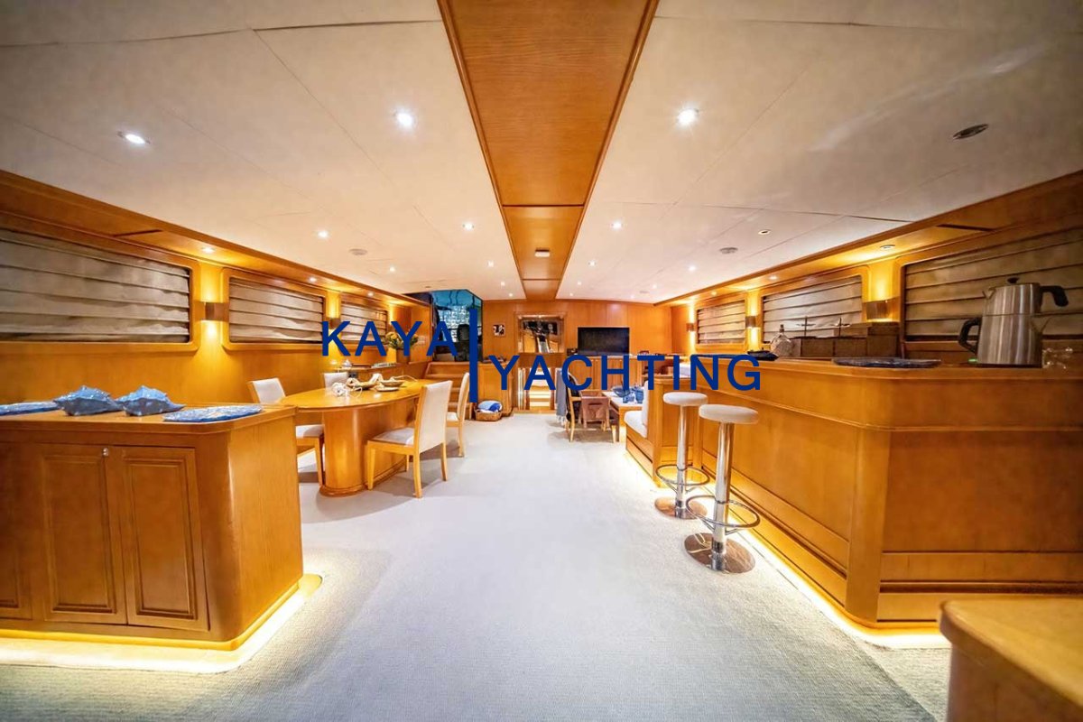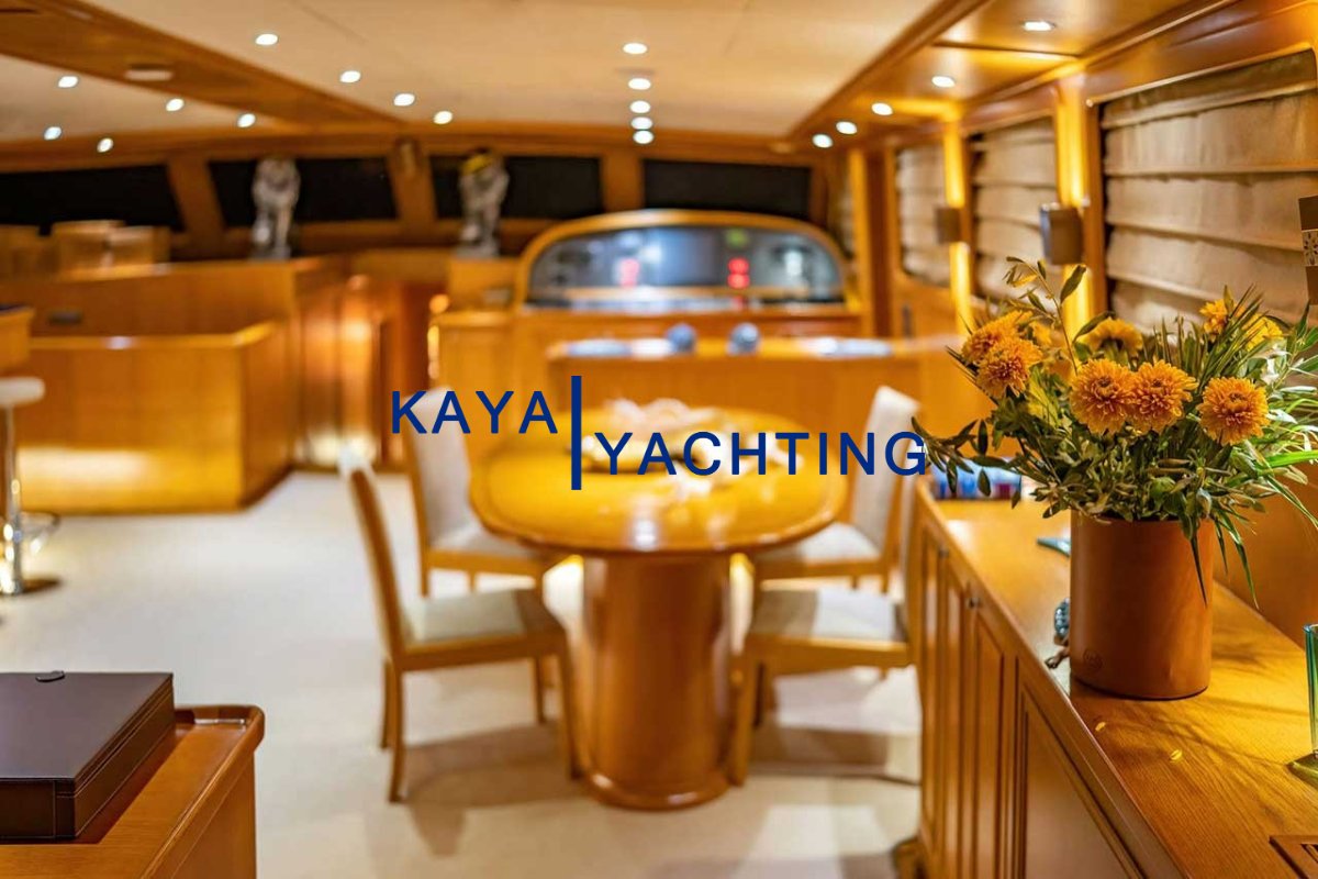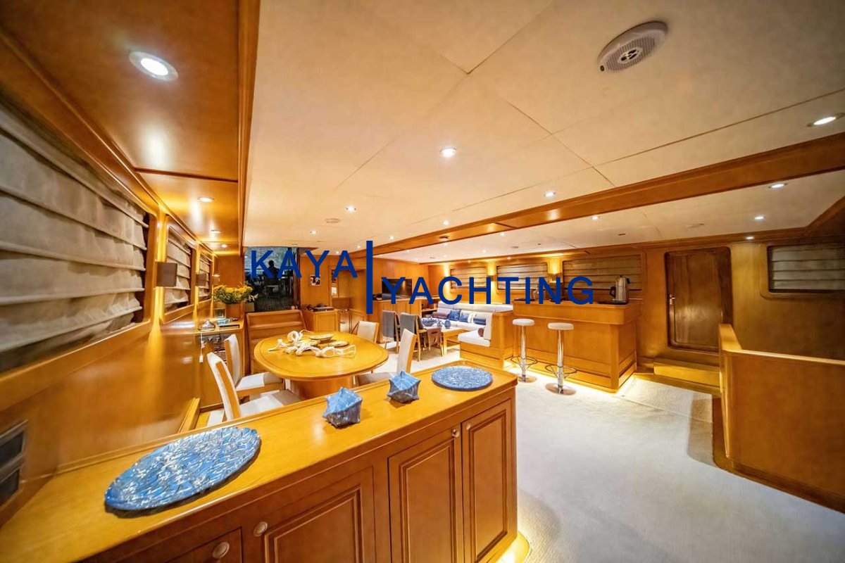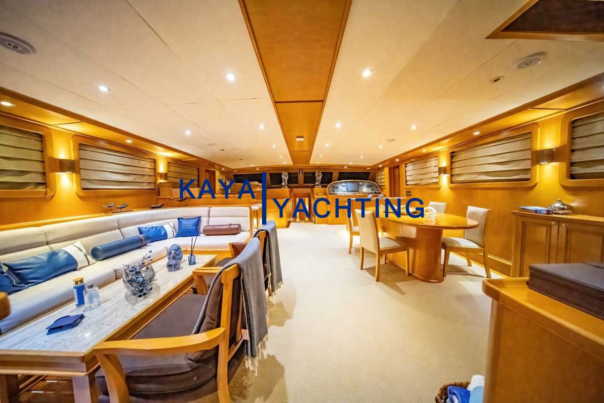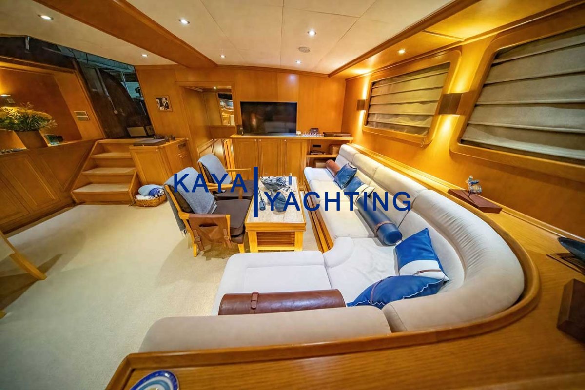 Teknenin salonu, konforlu oturma grupları, LCD TV, DVD oynatıcı ve stereo müzik sistemi ile donatılmış olup, akşamları sevdiklerinizle keyifli vakit geçirmeniz için idealdir. Ancak Babylon'un asıl cazibesi dış güvertelerindedir: