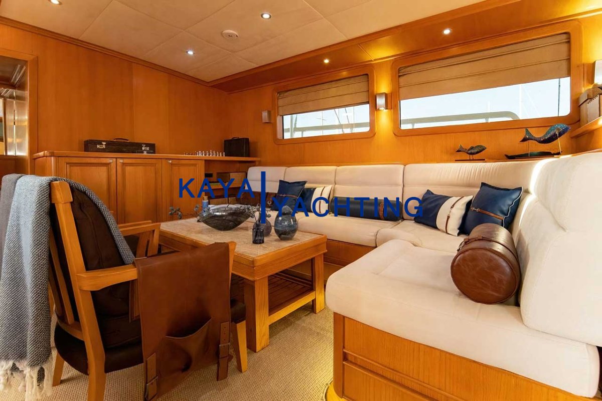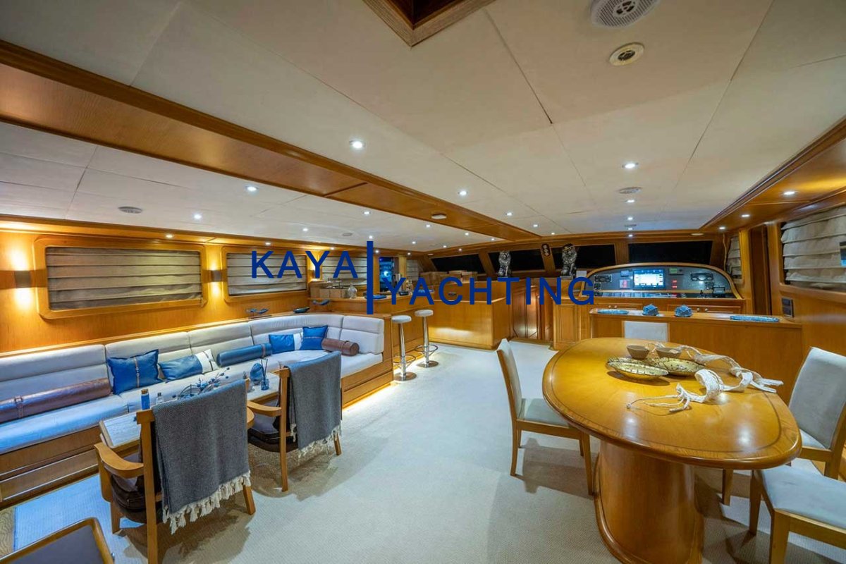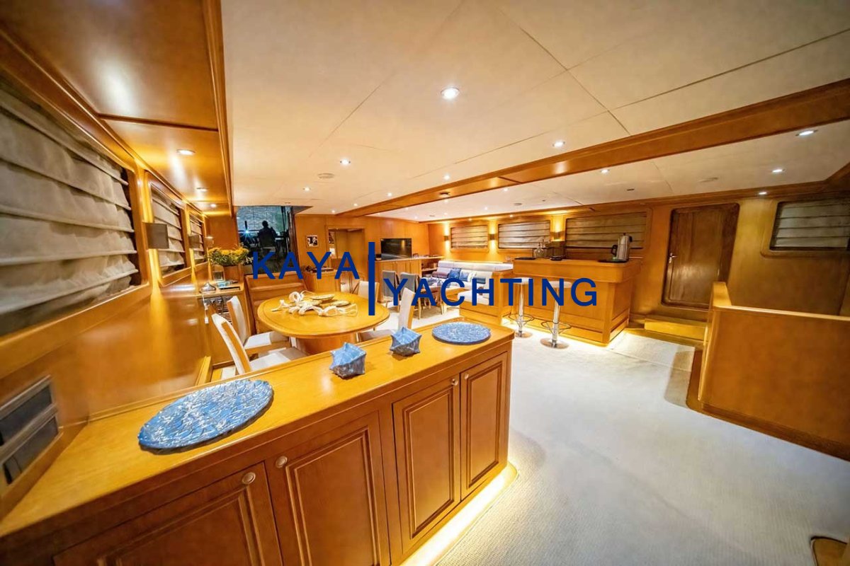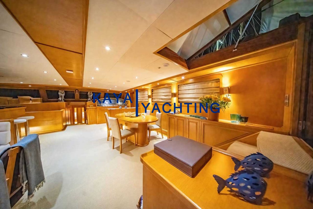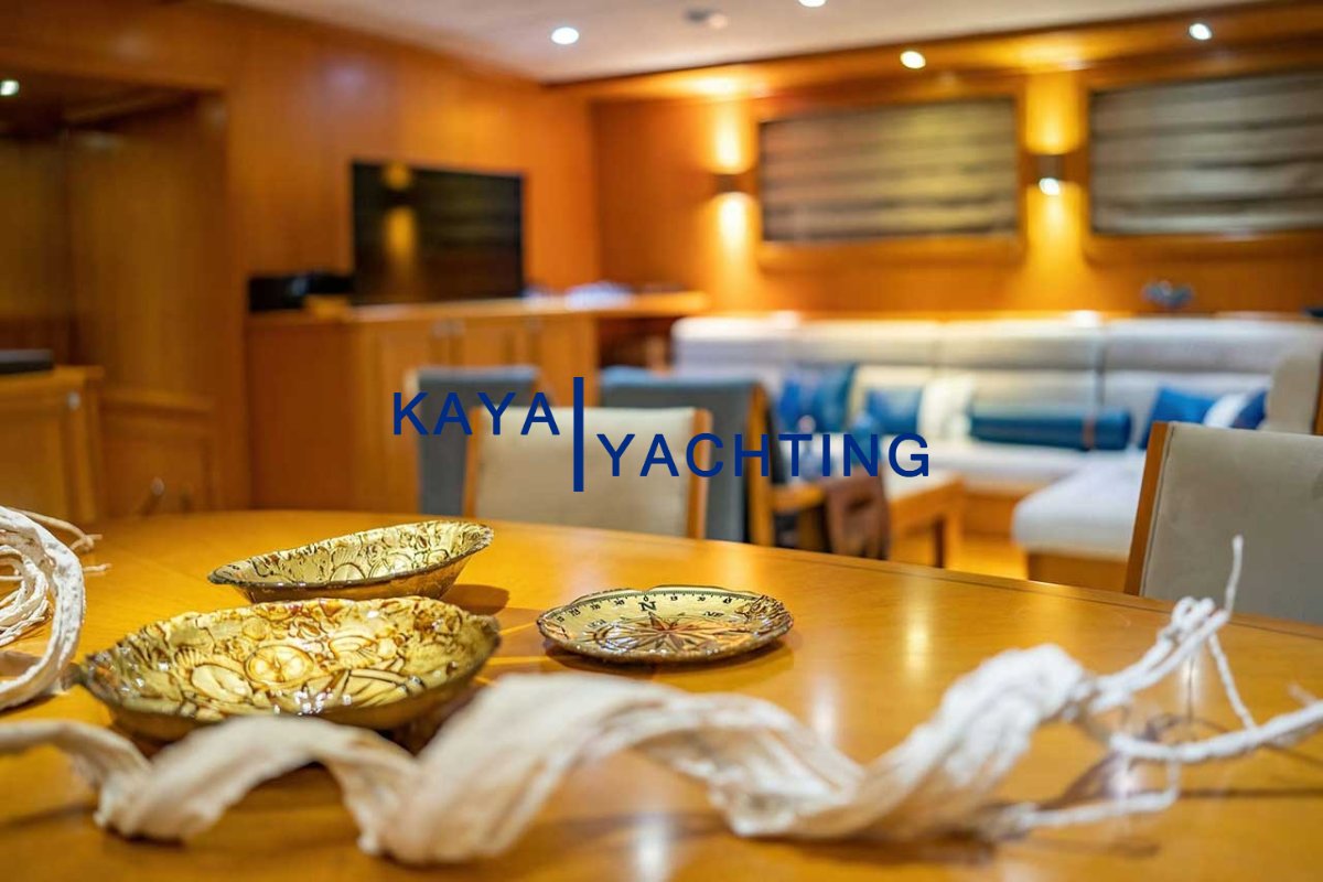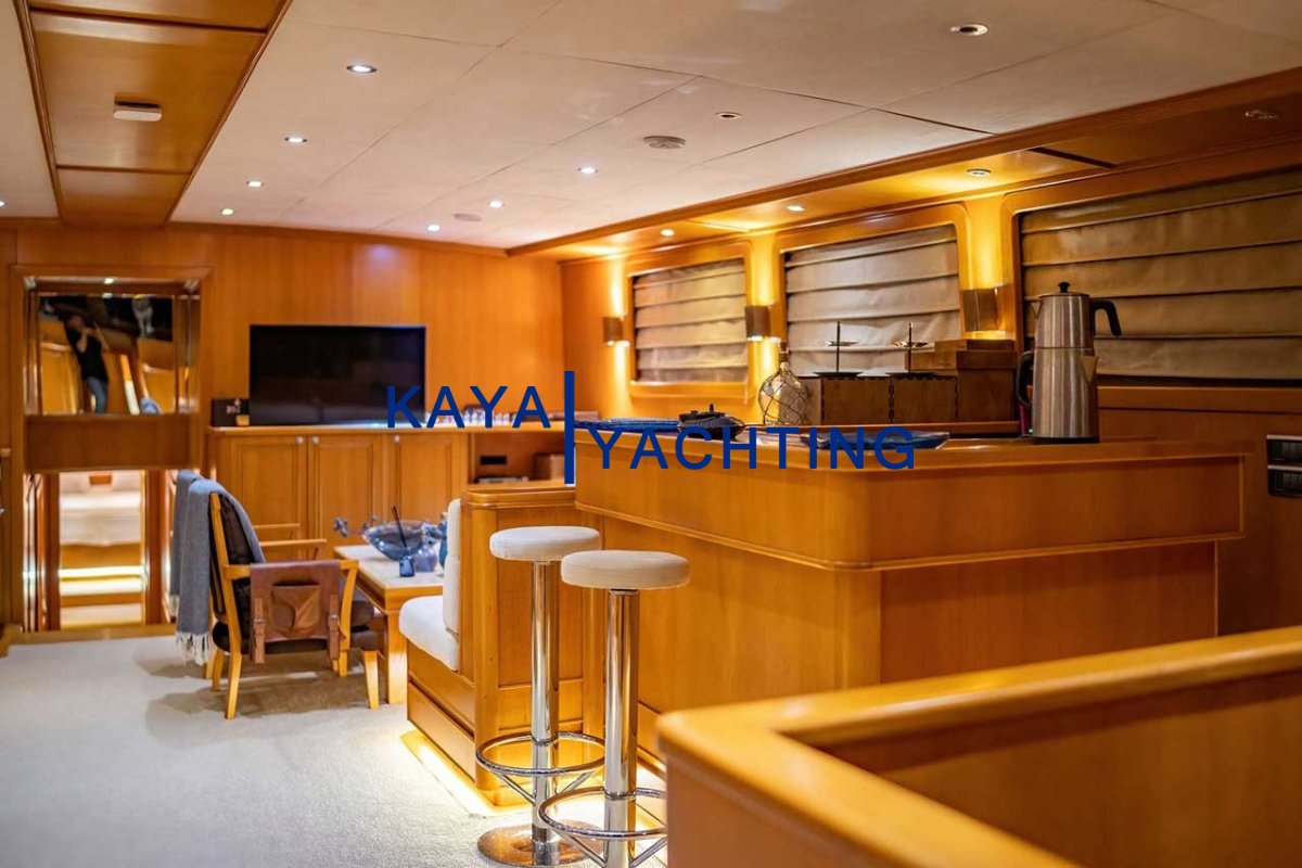 Teknenin salonu, konforlu oturma grupları, LCD TV, DVD oynatıcı ve stereo müzik sistemi ile donatılmış olup, akşamları sevdiklerinizle keyifli vakit geçirmeniz için idealdir. Ancak Babylon'un asıl cazibesi dış güvertelerindedir: