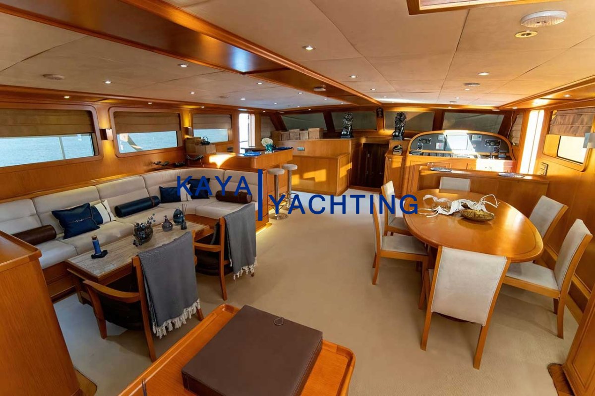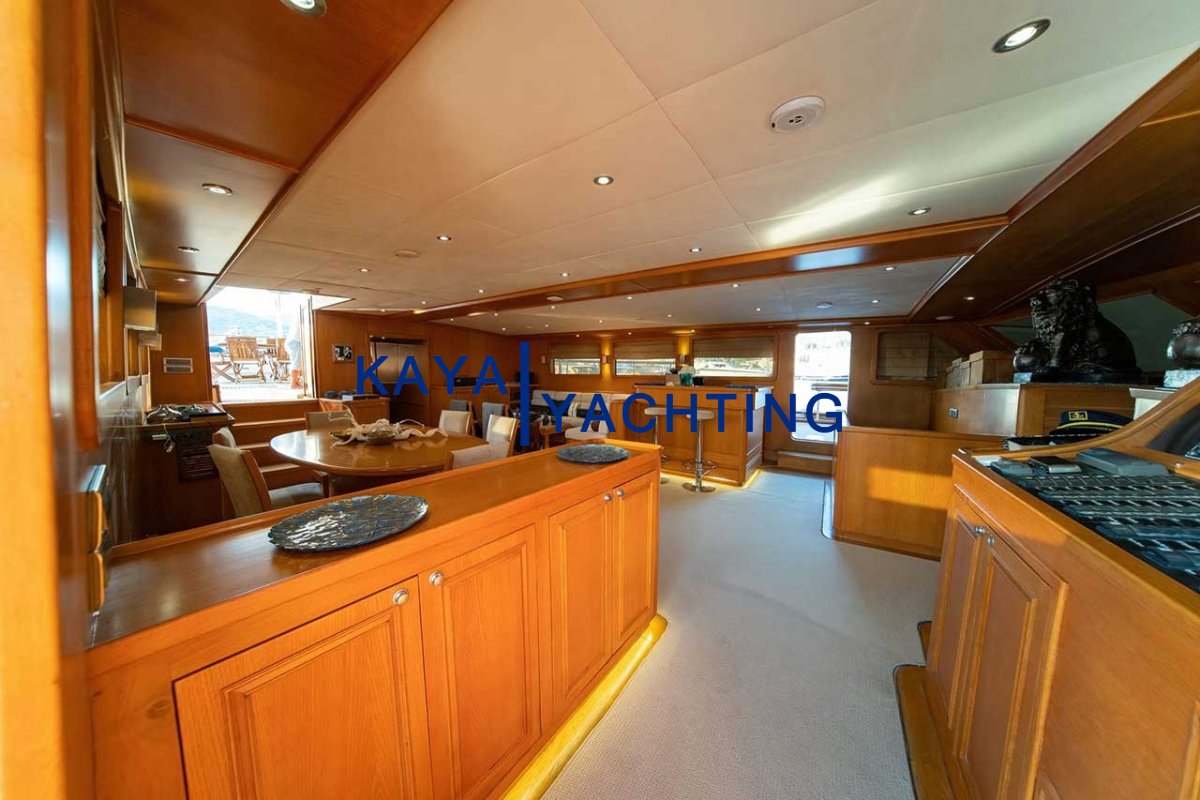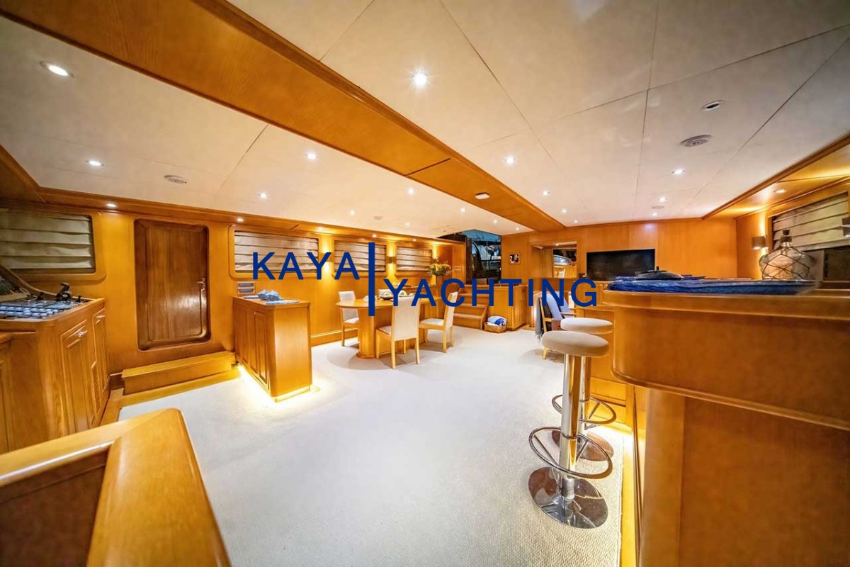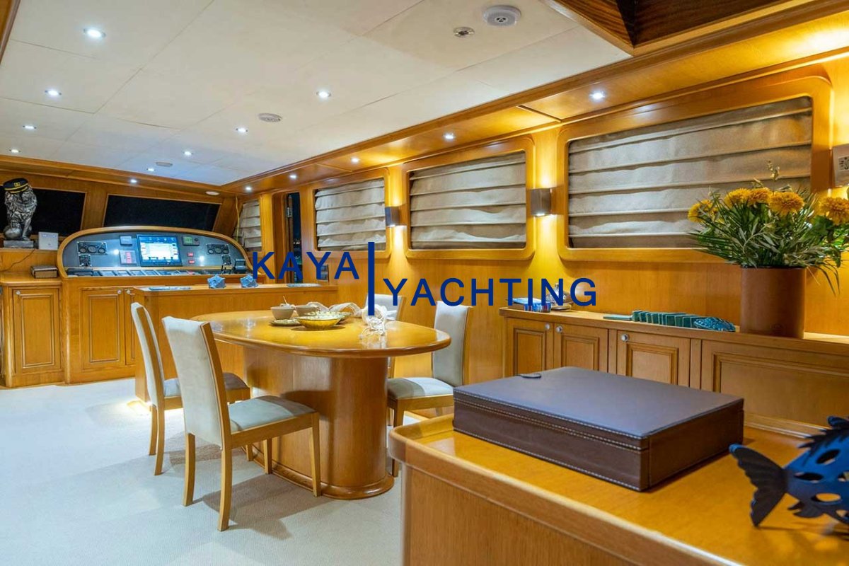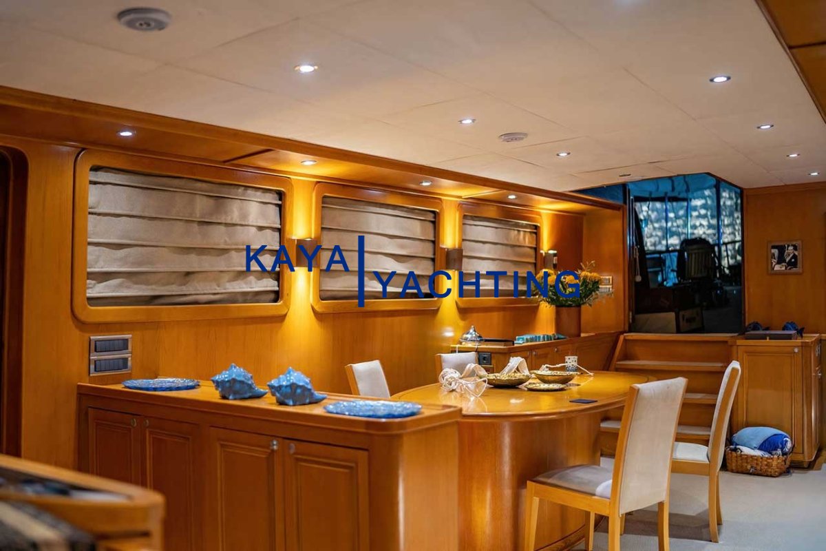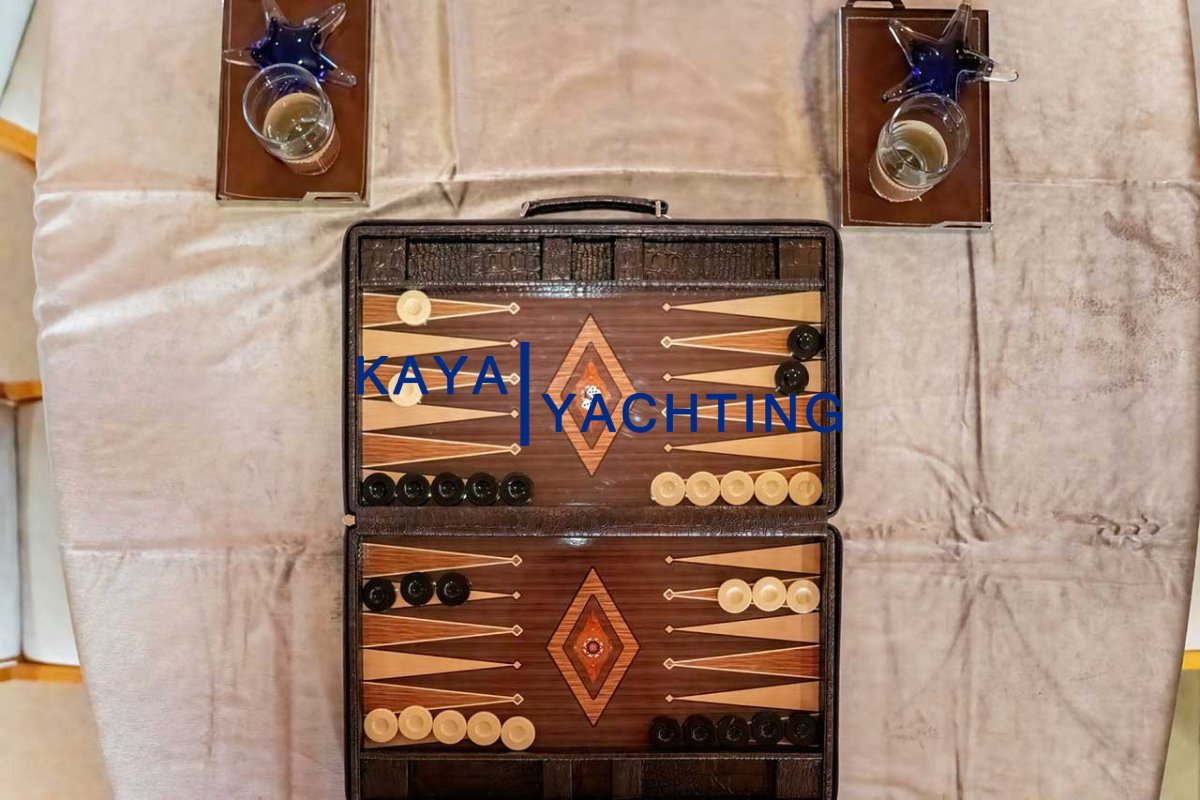 Teknenin salonu, konforlu oturma grupları, LCD TV, DVD oynatıcı ve stereo müzik sistemi ile donatılmış olup, akşamları sevdiklerinizle keyifli vakit geçirmeniz için idealdir. Ancak Babylon'un asıl cazibesi dış güvertelerindedir: