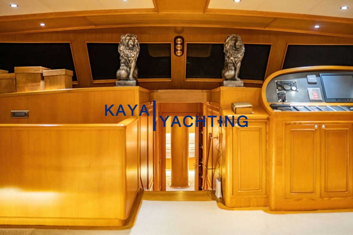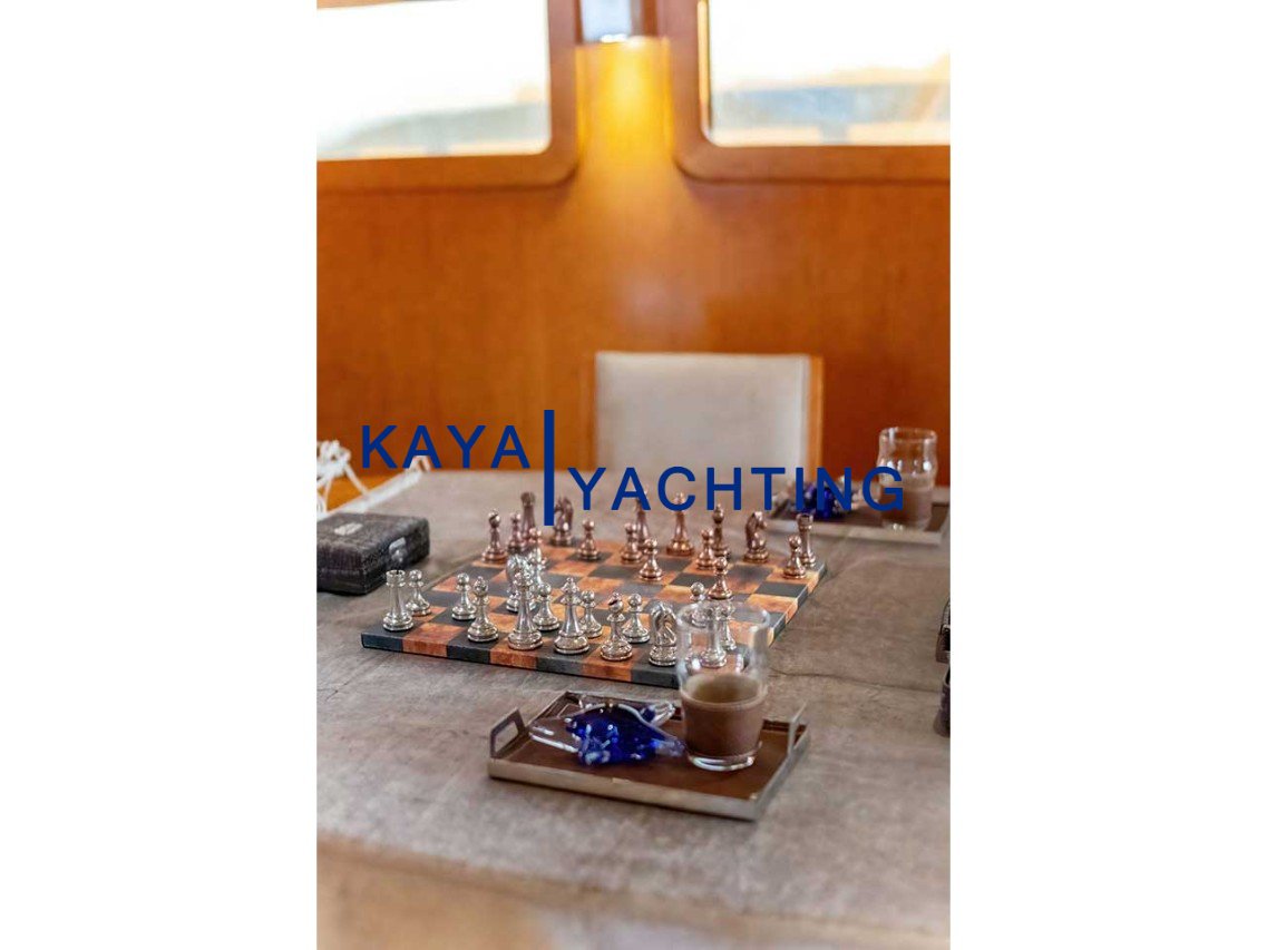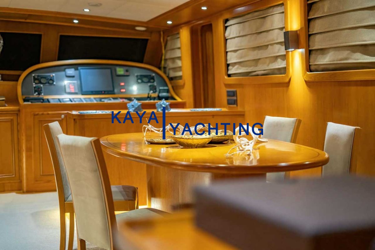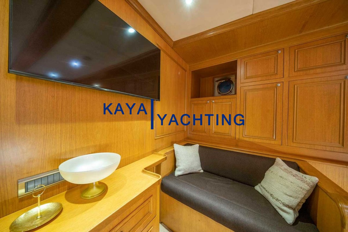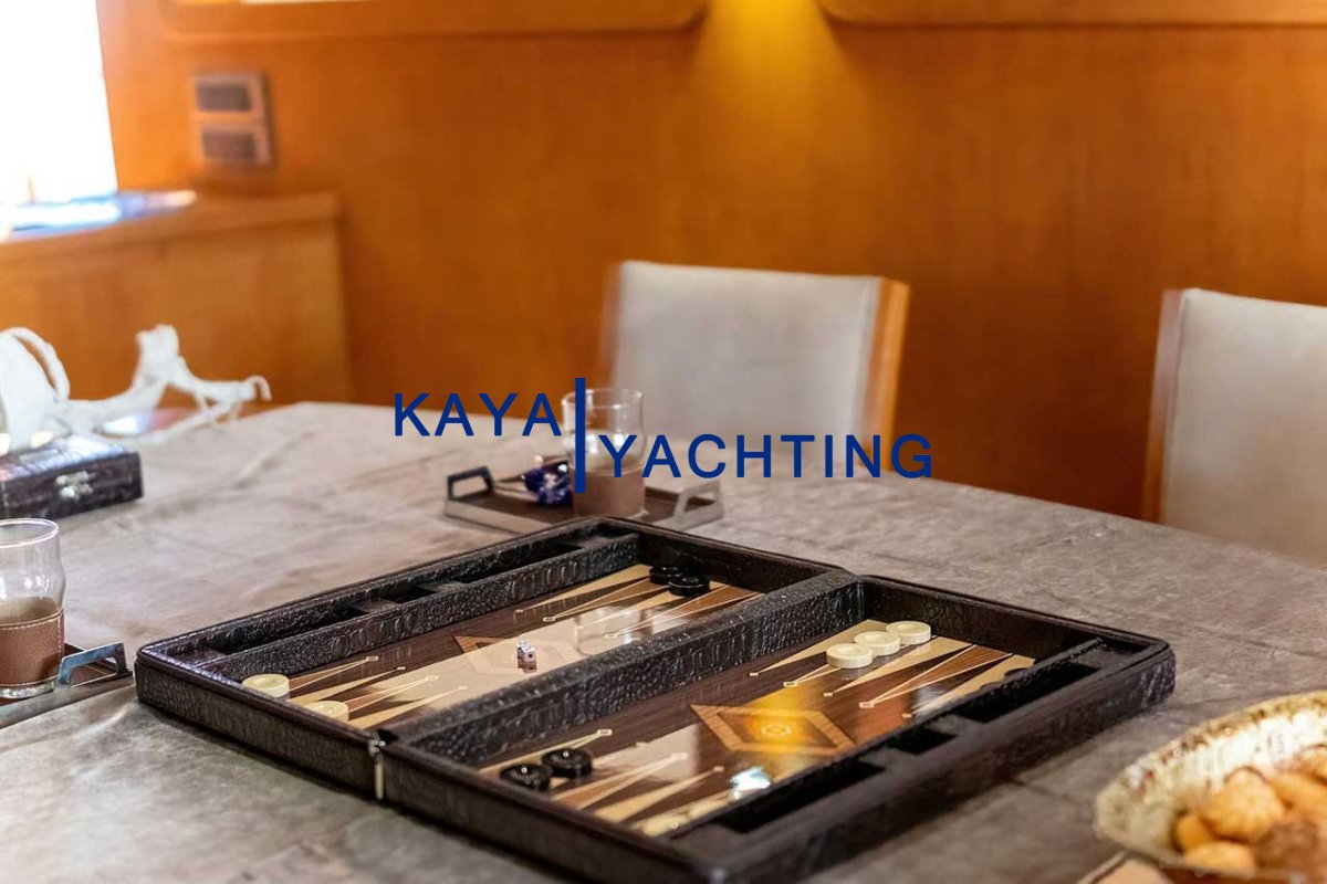 Teknenin salonu, konforlu oturma grupları, LCD TV, DVD oynatıcı ve stereo müzik sistemi ile donatılmış olup, akşamları sevdiklerinizle keyifli vakit geçirmeniz için idealdir. Ancak Babylon'un asıl cazibesi dış güvertelerindedir: