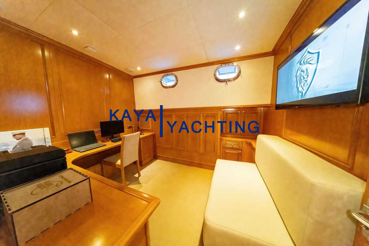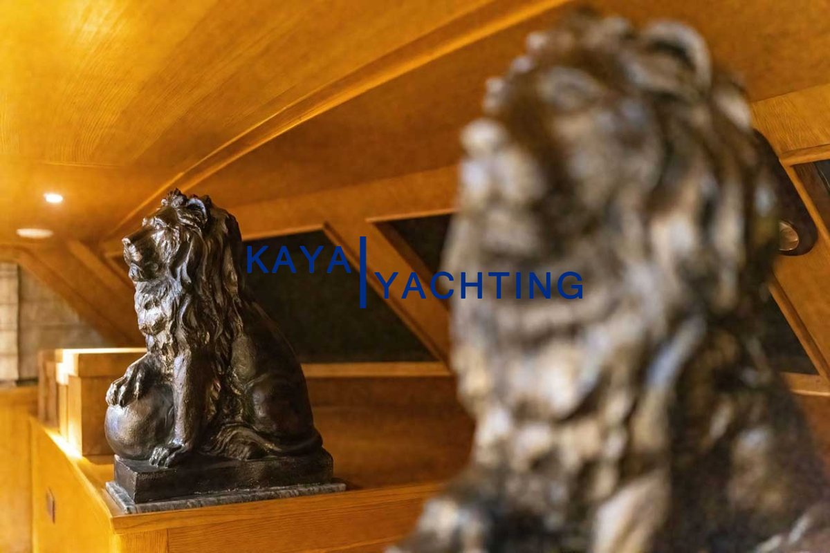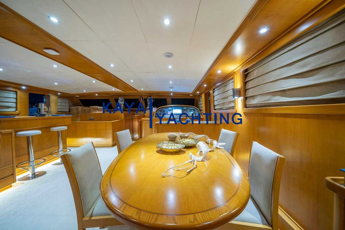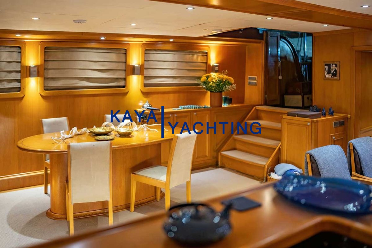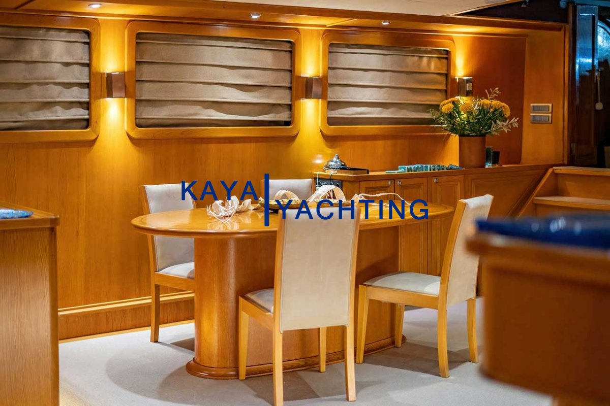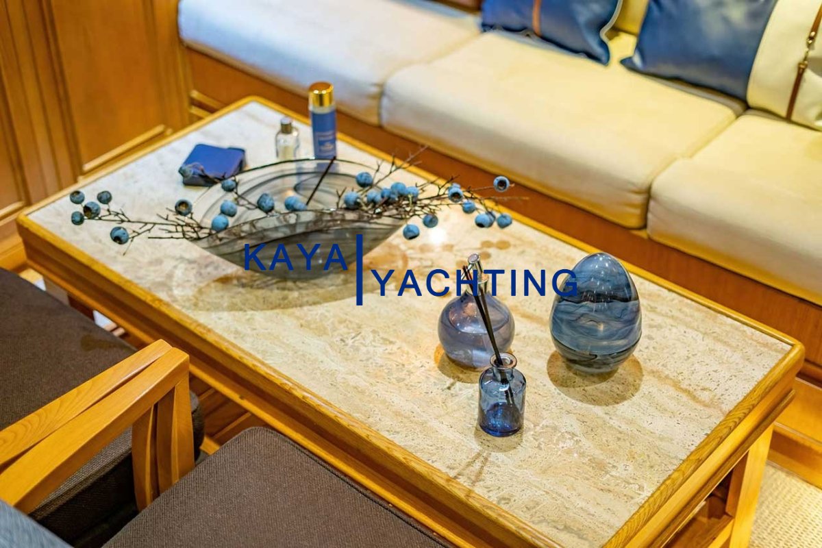 Teknenin salonu, konforlu oturma grupları, LCD TV, DVD oynatıcı ve stereo müzik sistemi ile donatılmış olup, akşamları sevdiklerinizle keyifli vakit geçirmeniz için idealdir. Ancak Babylon'un asıl cazibesi dış güvertelerindedir: