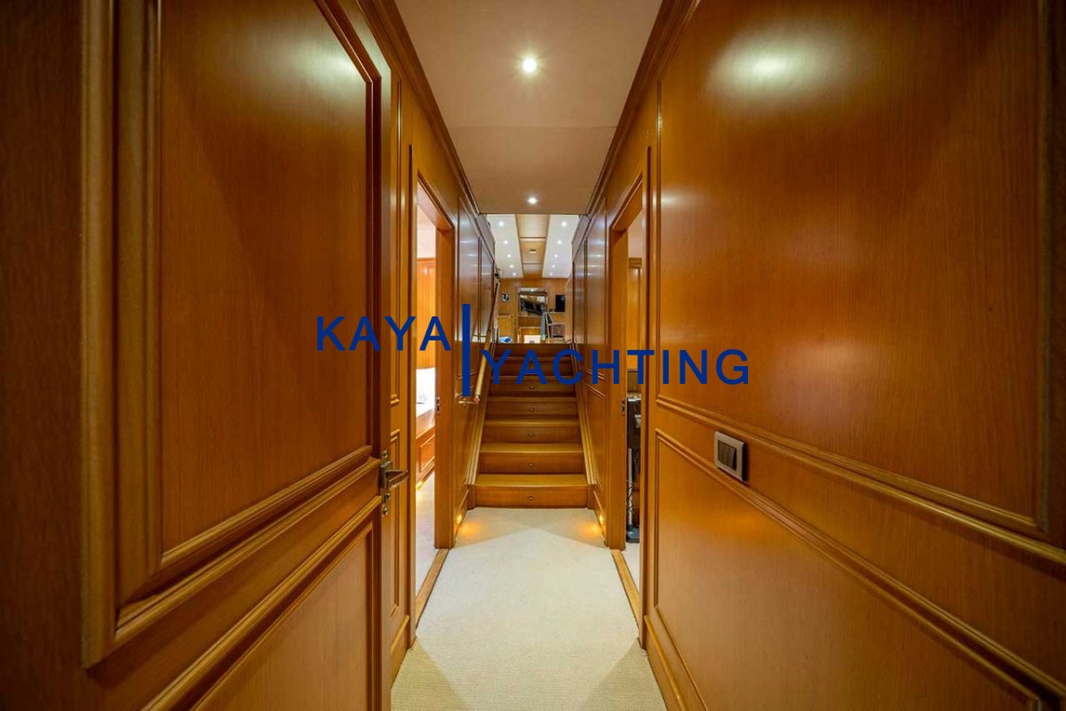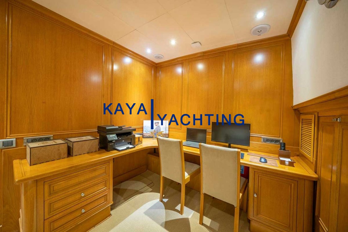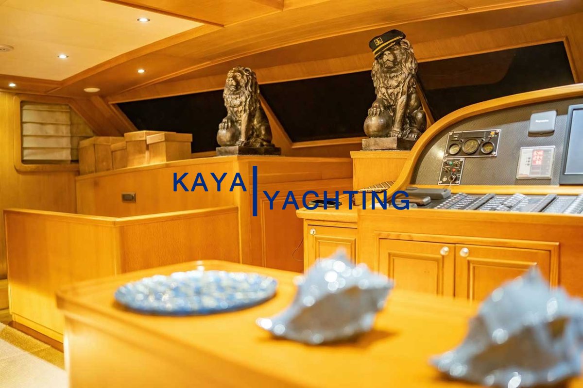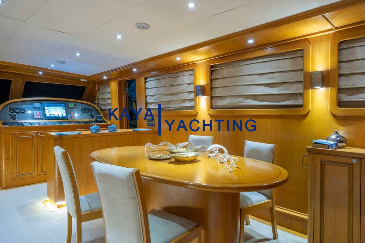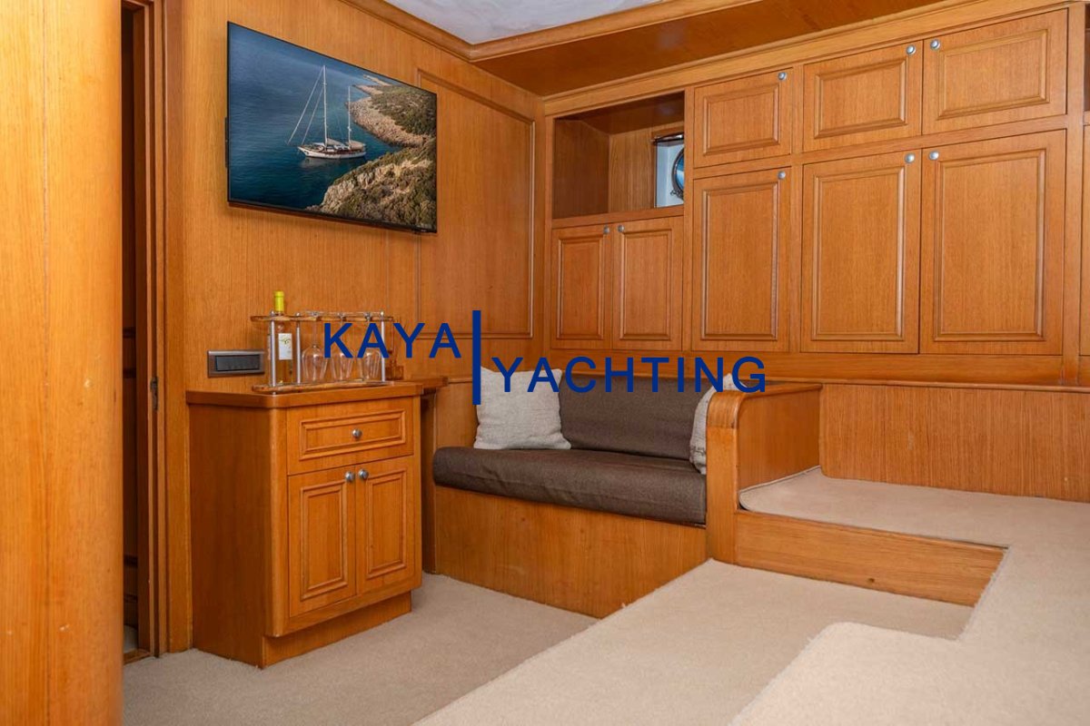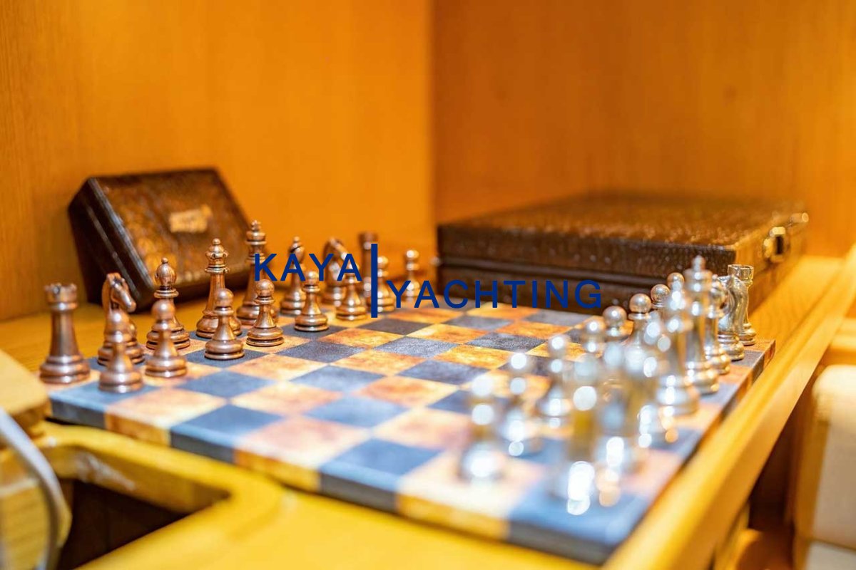Teknenin salonu, konforlu oturma grupları, LCD TV, DVD oynatıcı ve stereo müzik sistemi ile donatılmış olup, akşamları sevdiklerinizle keyifli vakit geçirmeniz için idealdir. Ancak Babylon'un asıl cazibesi dış güvertelerindedir: