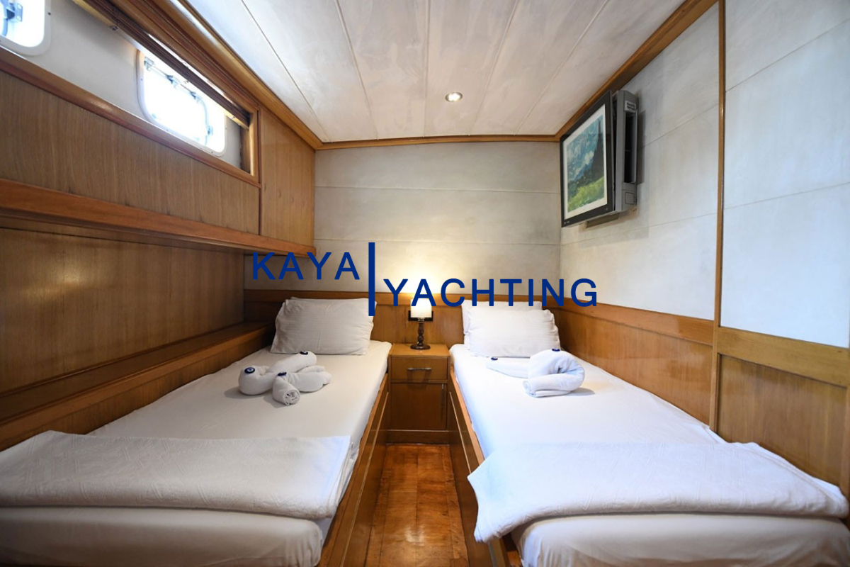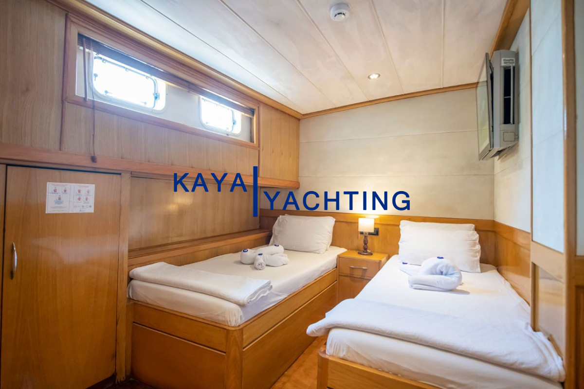 1 Twin Kabin (11 m²): İki ayrı yatağıyla arkadaşlar veya çocuklar için mükemmel bir seçenektir. Bu kabin de diğerleri gibi özel banyo, LED TV ve klima ile donatılmıştır.