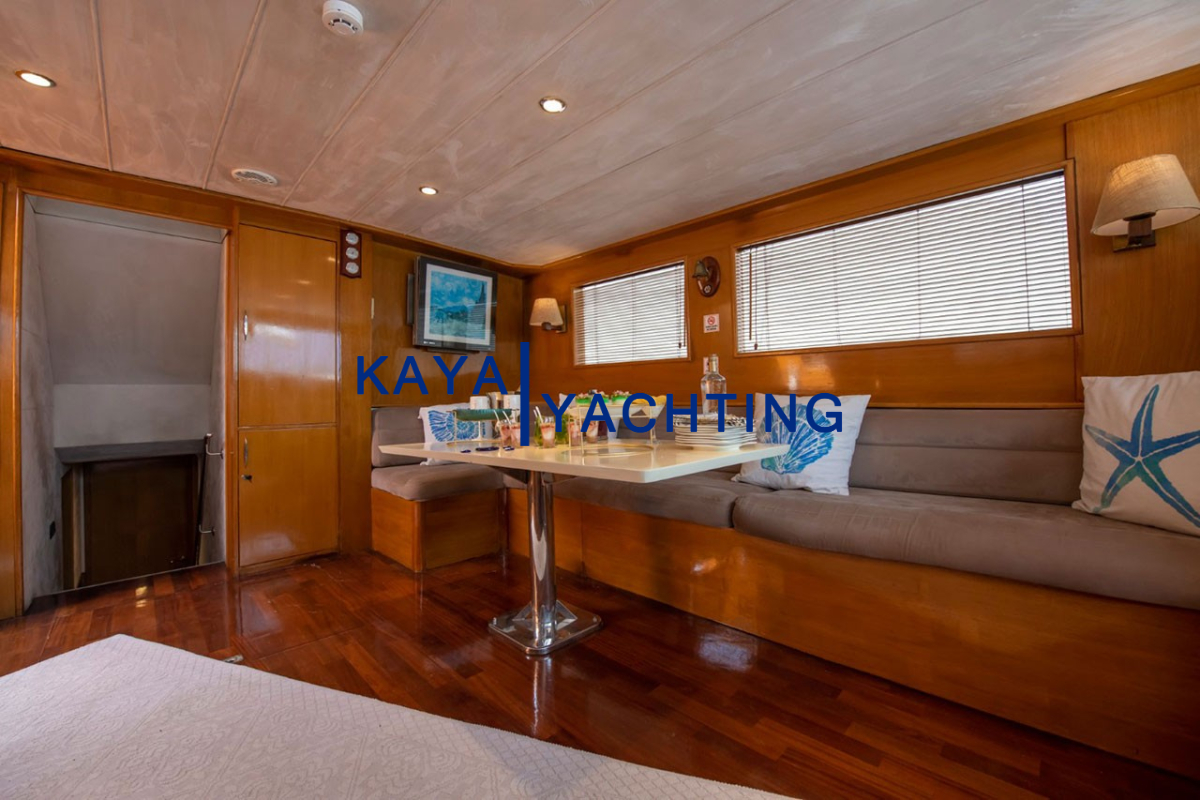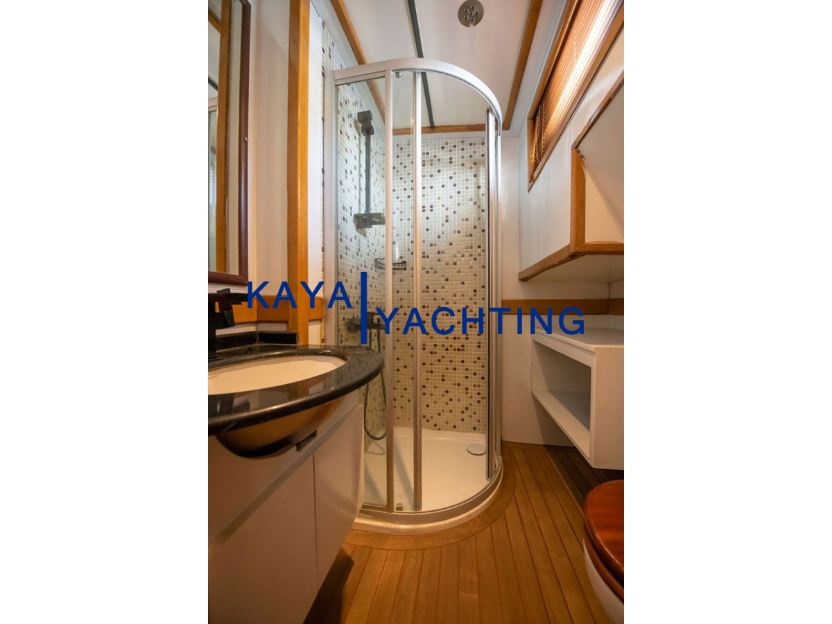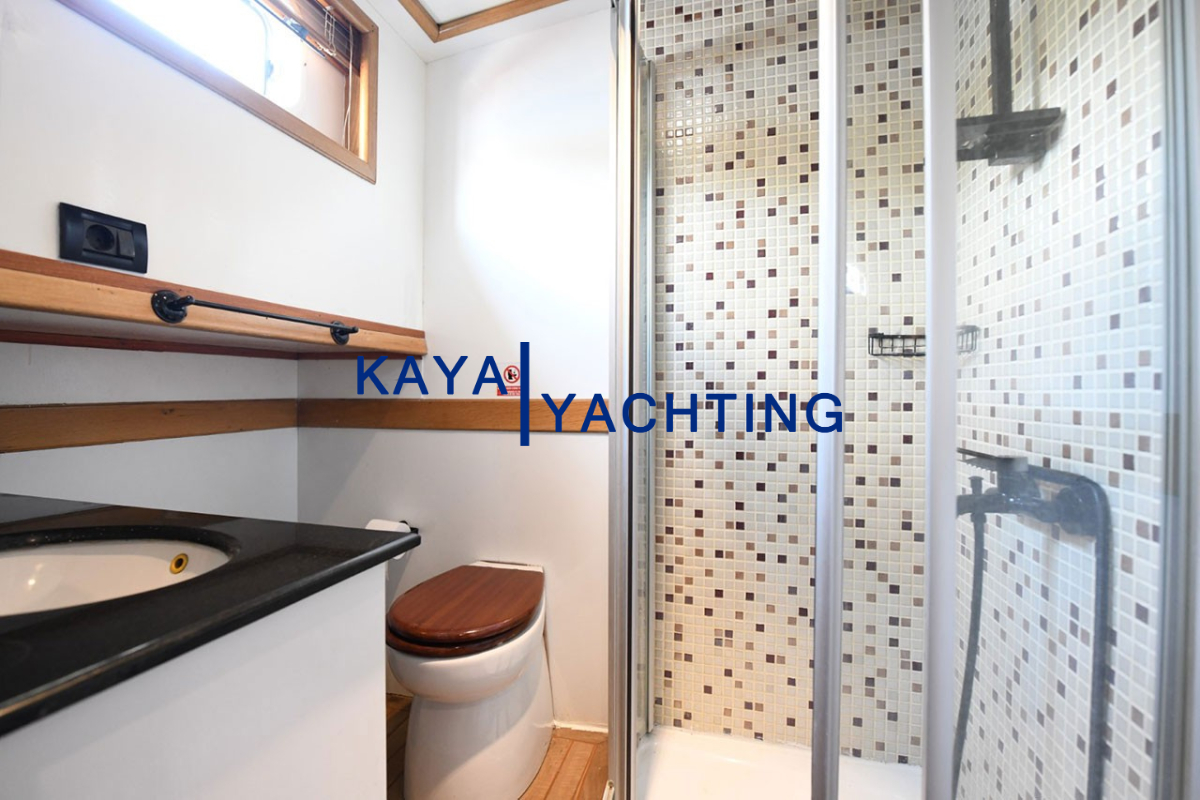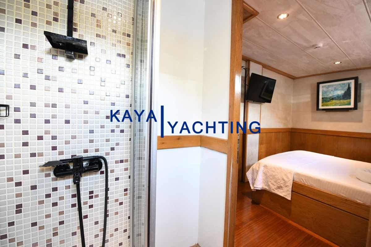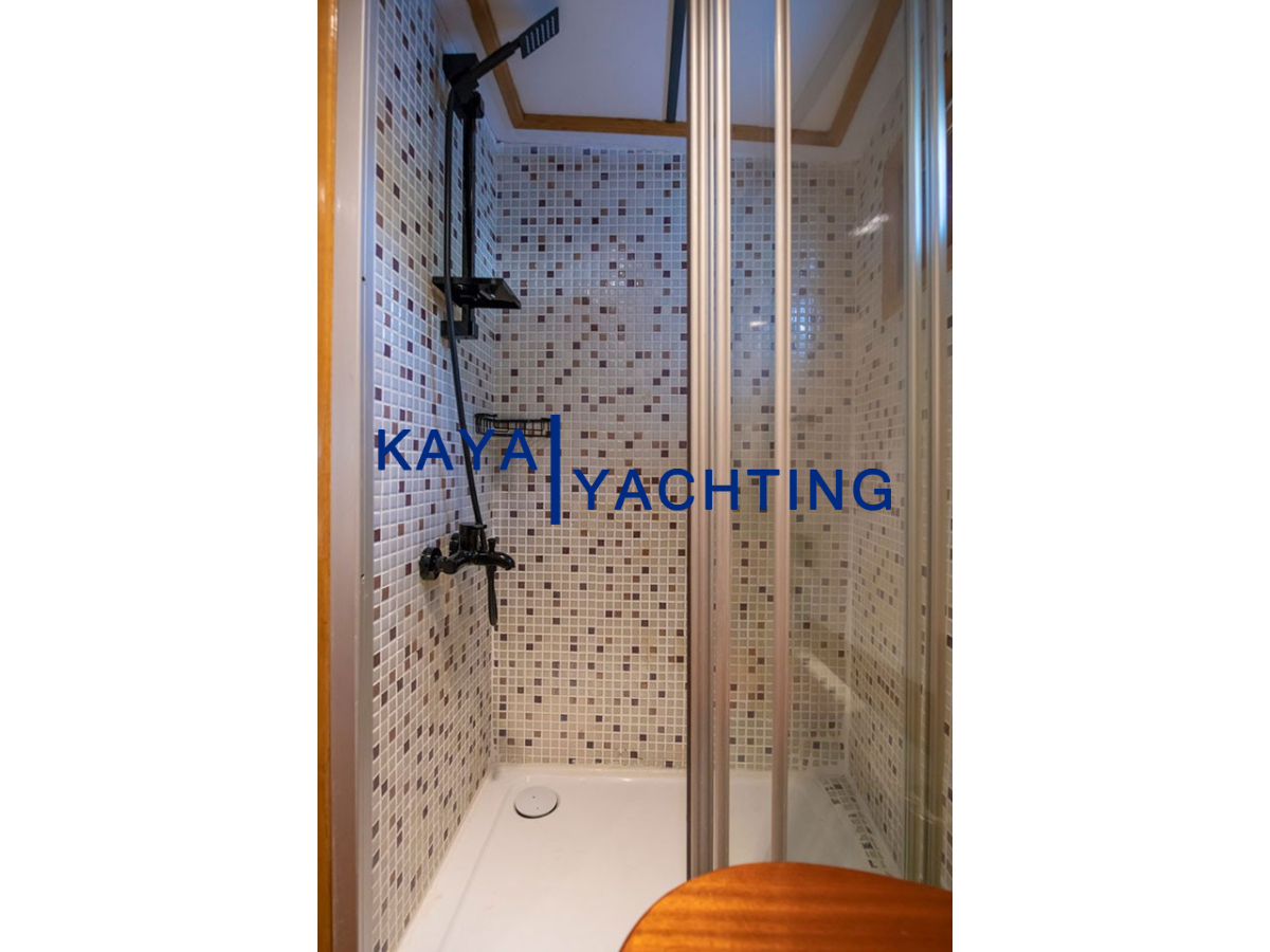 Tüm kabinlerdeki modern duşakabinli banyolar, hijyen ve konforu bir arada sunar. Banyolar hariç tutulan kabin metrekareleri, yaşam alanlarınızın ferahlığını daha iyi anlamanızı sağlar. Özellikle son tadilatla halı kaplanan iç yaşam alanı zemini, teknenin genel atmosferine sıcaklık ve zarafet katmıştır.
