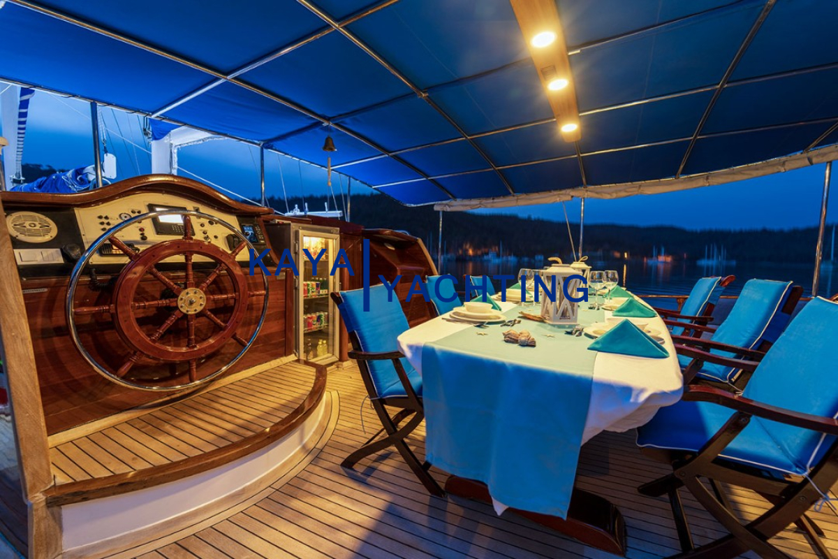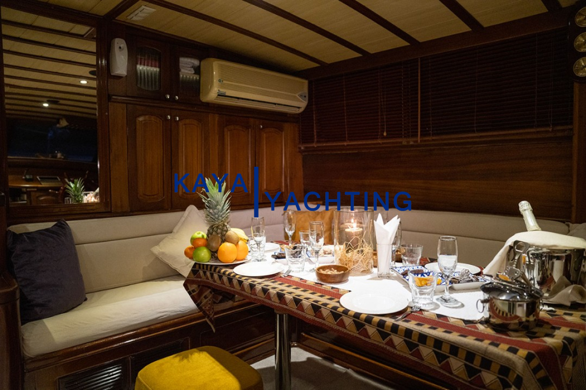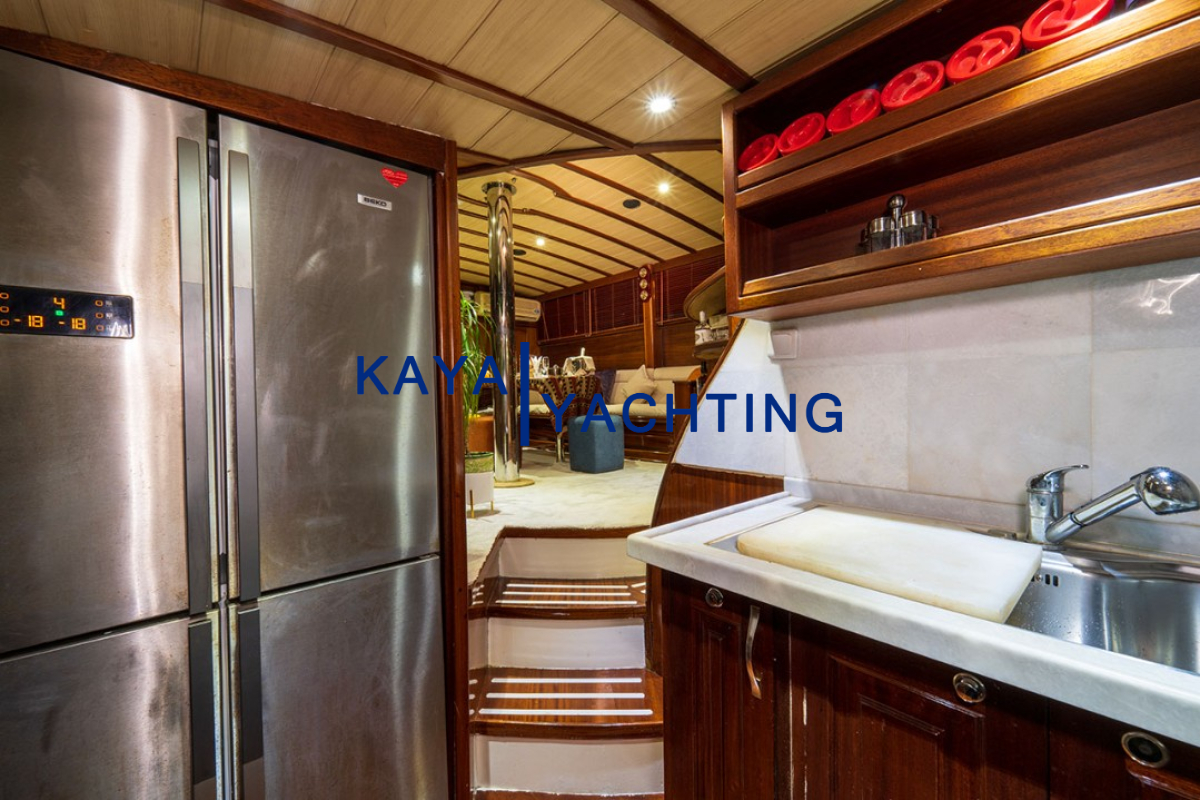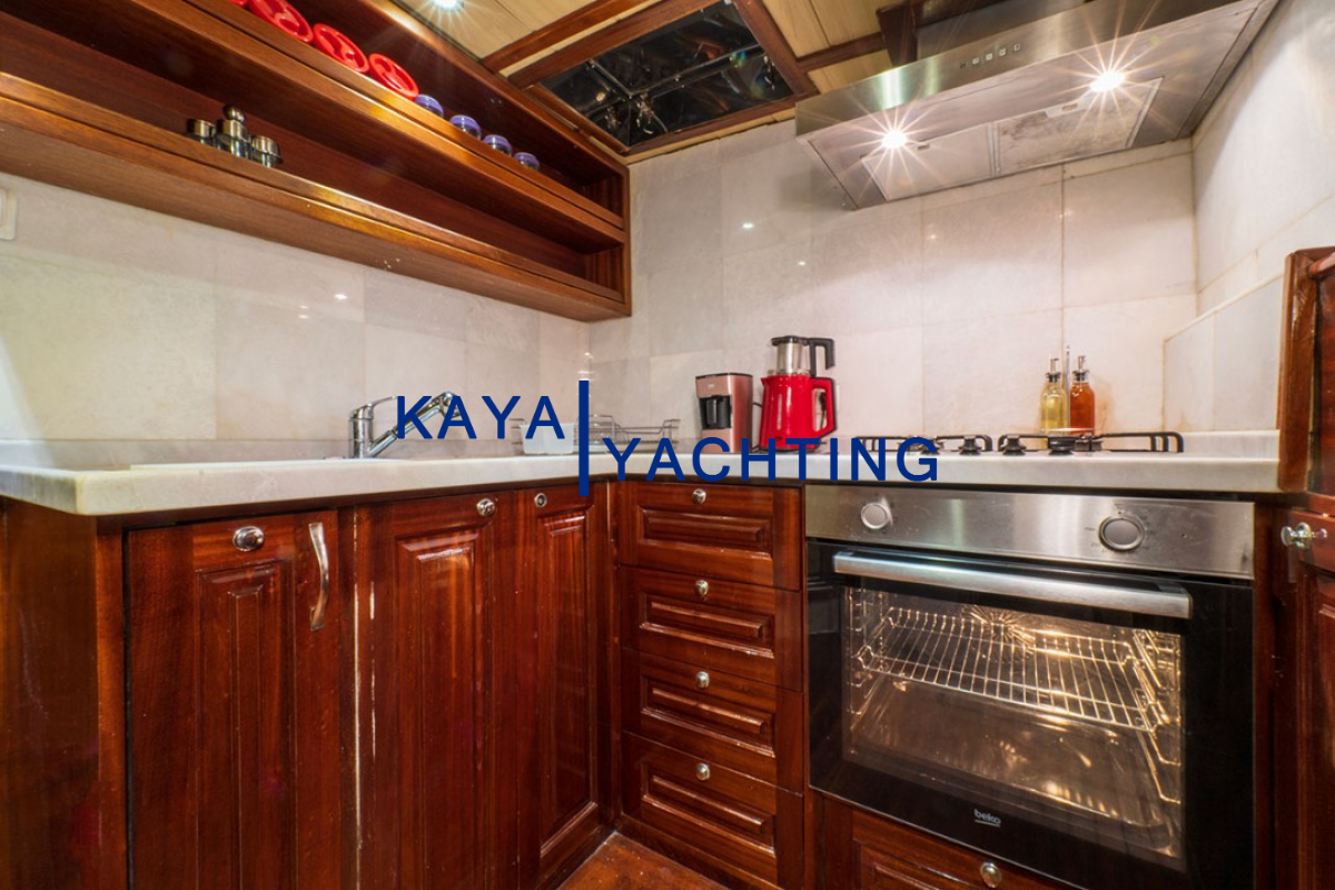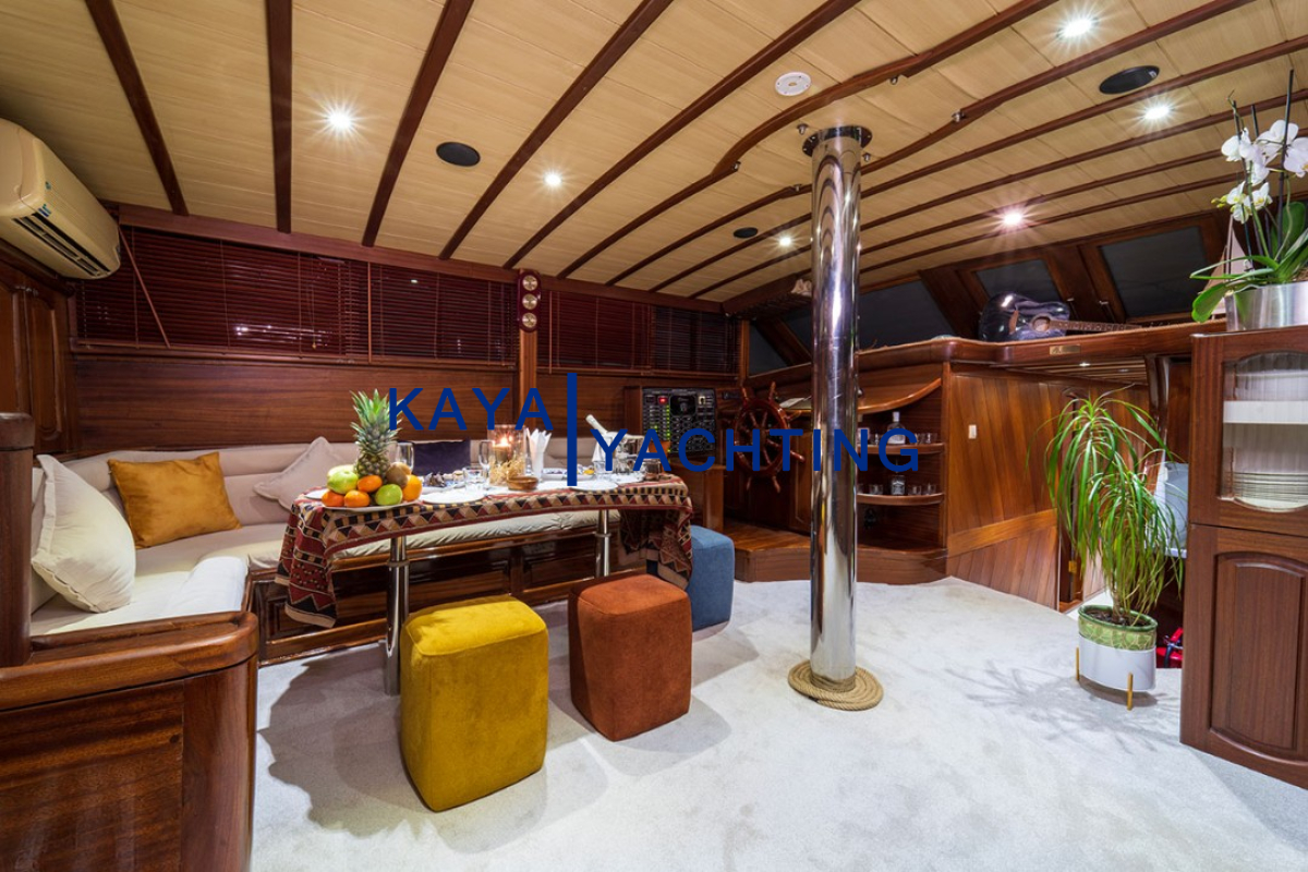 Teknenin iç mekanlarında sıcak ve davetkar bir atmosfer yaratan keyifli salonu, rahat oturma grupları ve özenle seçilmiş dekorasyonuyla dikkat çekiyor. Burada sevdiklerinizle keyifli sohbetler edebilir, kitap okuyabilir veya sadece denizin huzur veren sesini dinleyebilirsiniz. Her türlü ihtiyacınıza cevap verecek donanıma sahip tam teşekküllü mutfak ise, misafirlerin kendi yemeklerini hazırlama veya profesyonel mürettebat tarafından hazırlanan lezzetleri tatma imkanı sunar.
