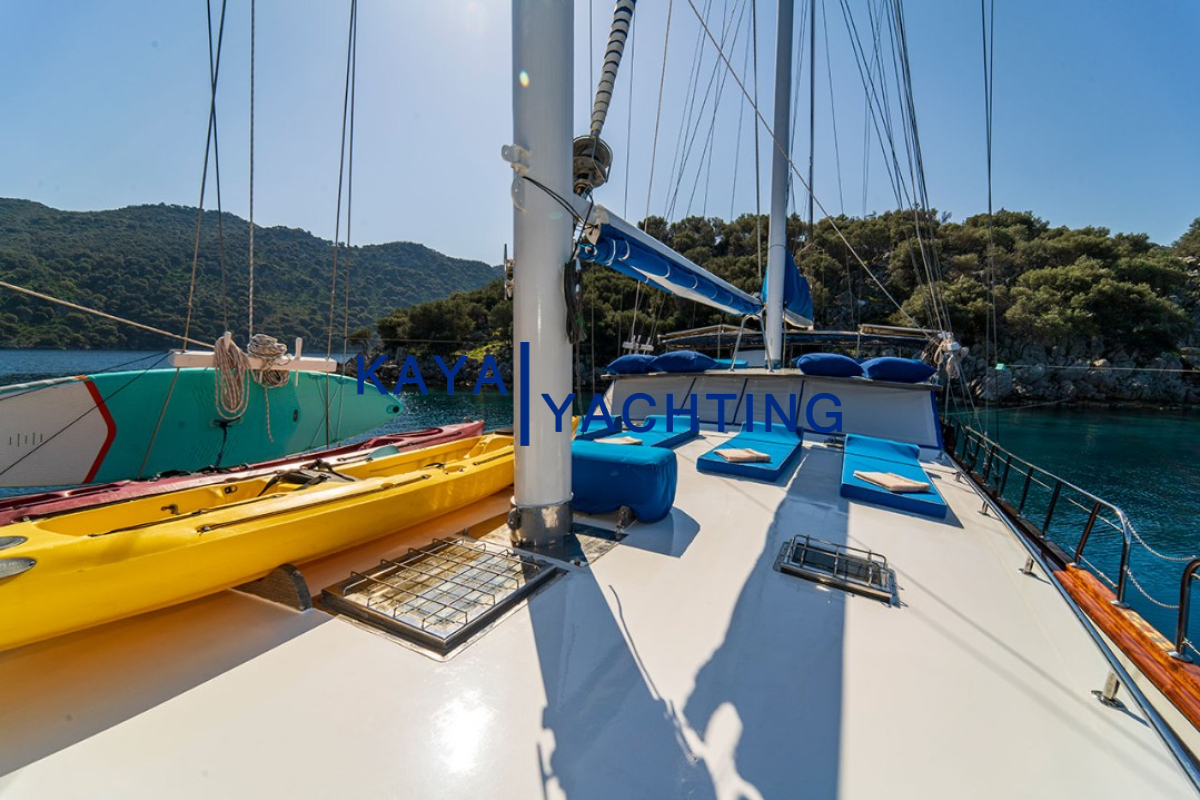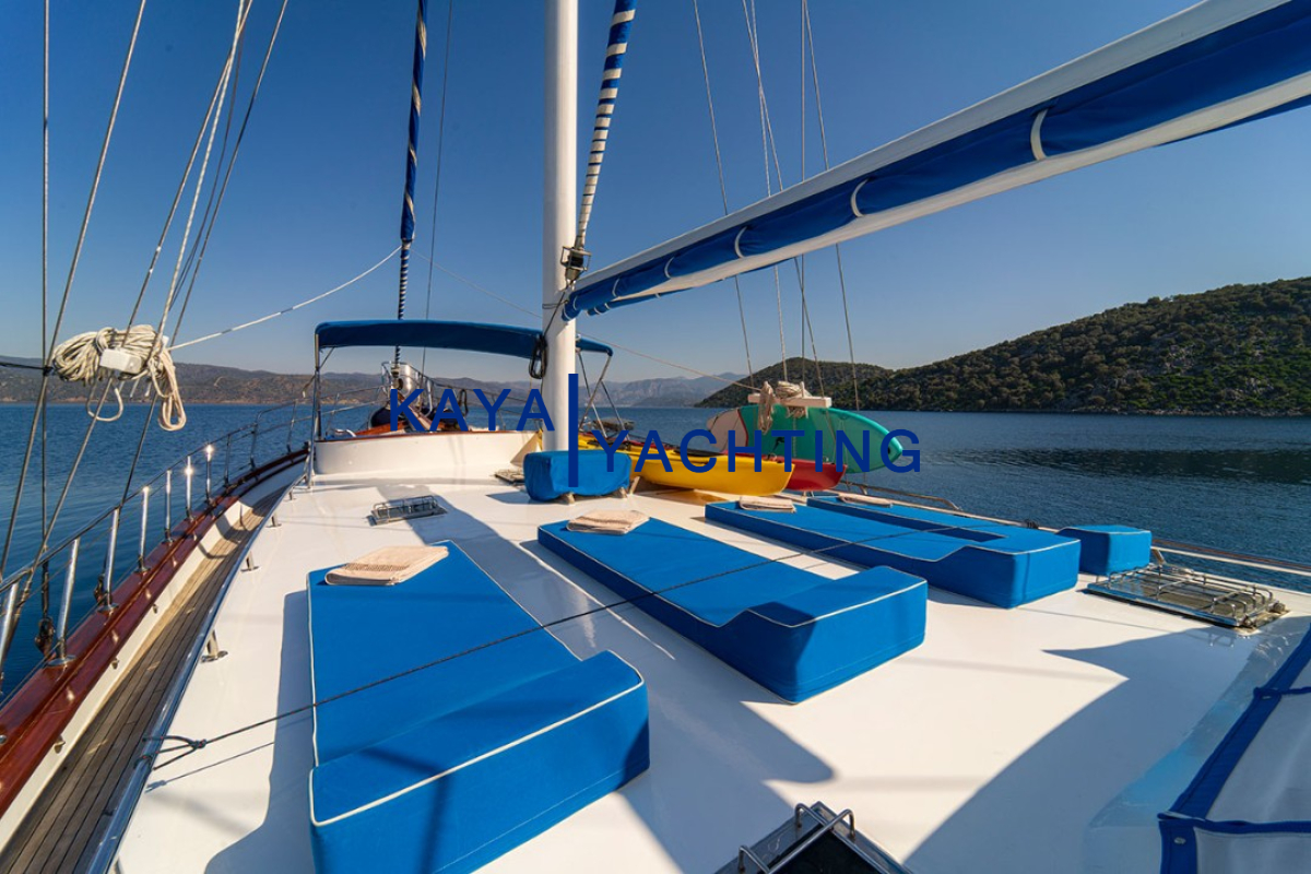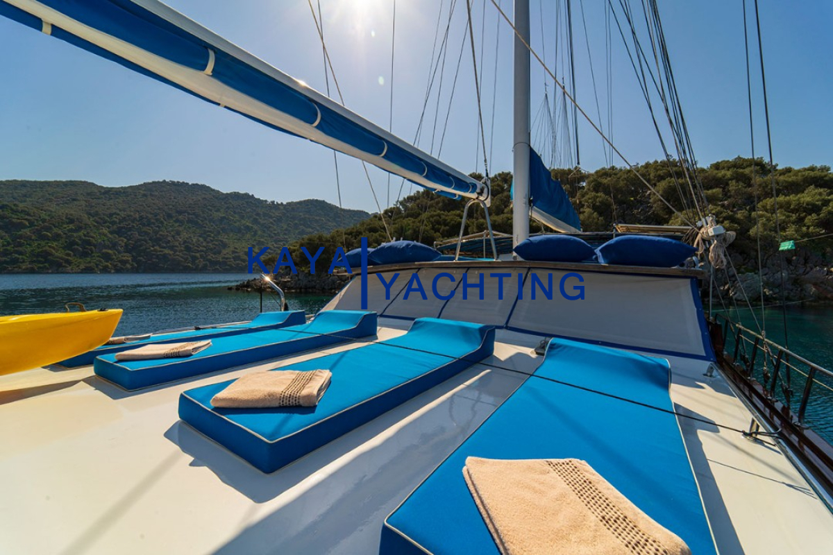 Gulet Elena'nın ön ve arka güvertelerindeki geniş oturma grupları ve güneşlenme alanı, hareket özgürlüğü sunarak tatilinizin her anını keyifle geçirmenizi sağlar. Güneşin sıcaklığını hissederken rahat minderlerde uzanabilir, sevdiklerinizle güvertede sohbet ederek eşsiz manzaraların tadını çıkarabilirsiniz. Özellikle Göcek adalarının büyüleyici atmosferinde, güvertede geçirilen her an unutulmaz bir anıya dönüşecektir.