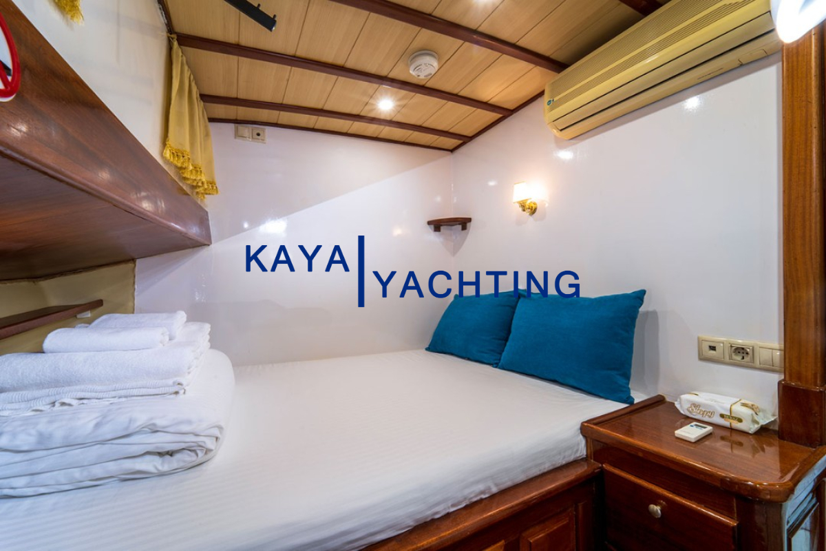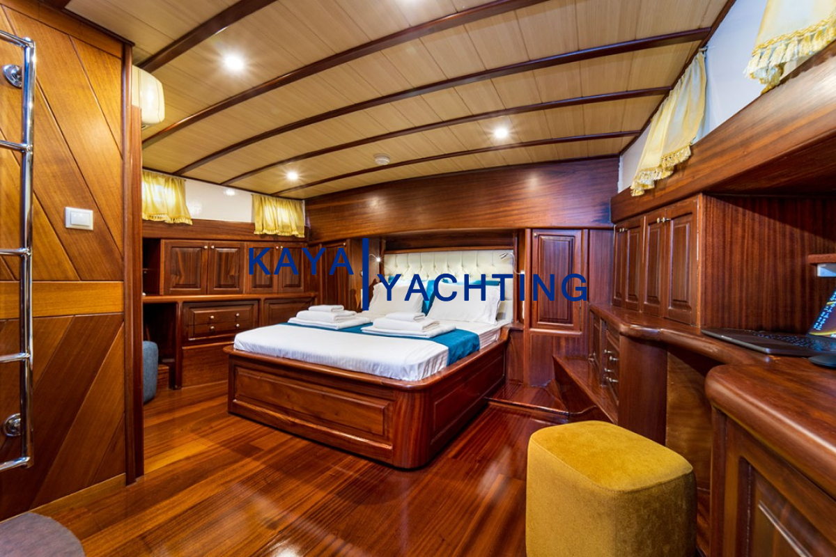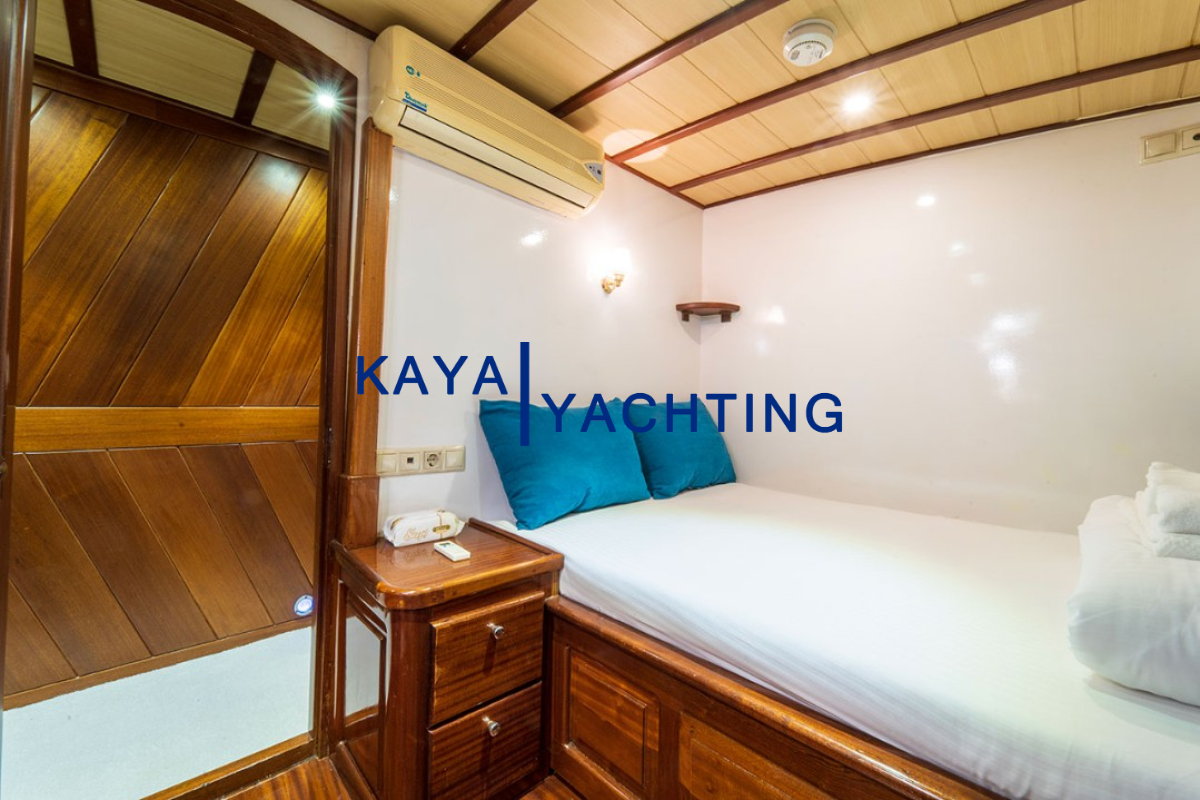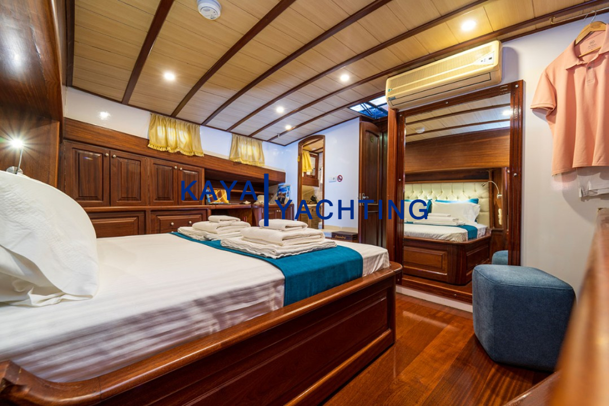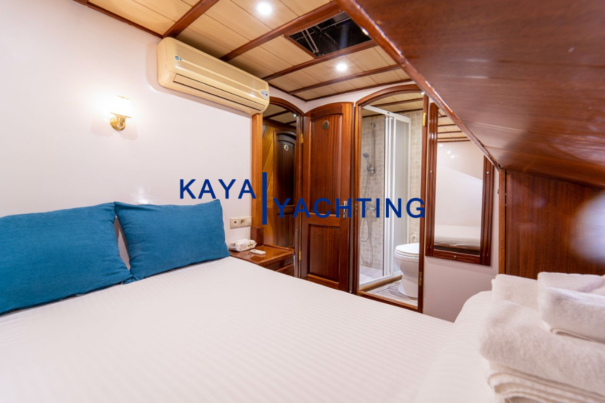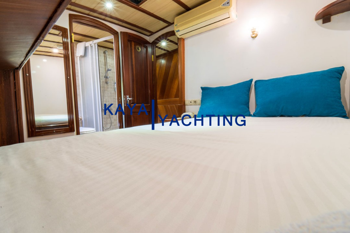Gulet Elena'nın her bir kabini, misafirlerin rahatlığı ve konforu ön planda tutularak özenle tasarlandı. Her kabinde bulunan klima sistemi sayesinde, Akdeniz'in sıcak yaz günlerinde bile serin ve ferah bir ortamda dinlenebilirsiniz. Özel WC ve duş kabinli banyolar, mahremiyetinizi korurken konforunuzdan ödün vermemenizi sağlar. Şık ve klasik mobilyalarla döşenmiş kabinler, mavi yolculuğunuz boyunca size evinizin sıcaklığını ve huzurunu yaşatacak.