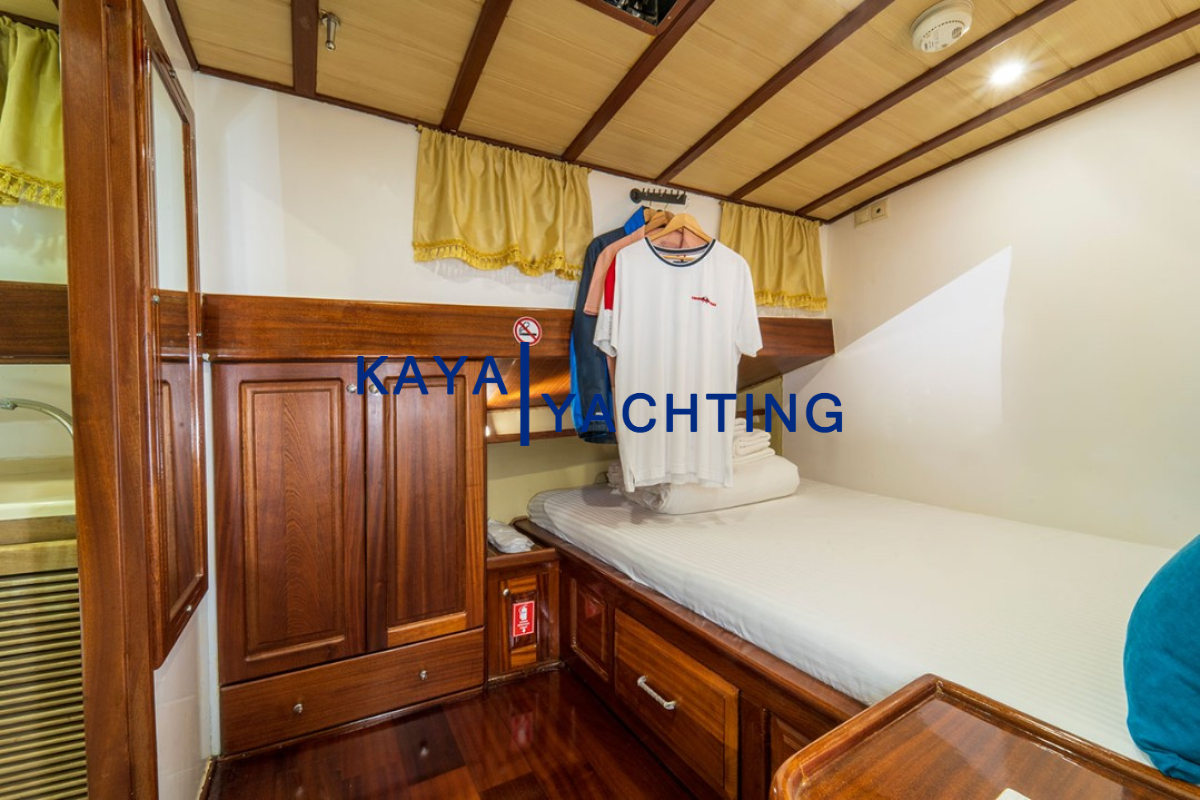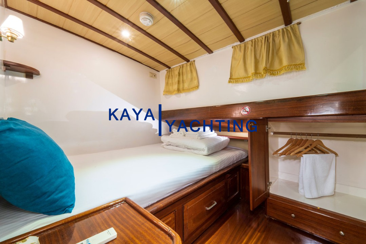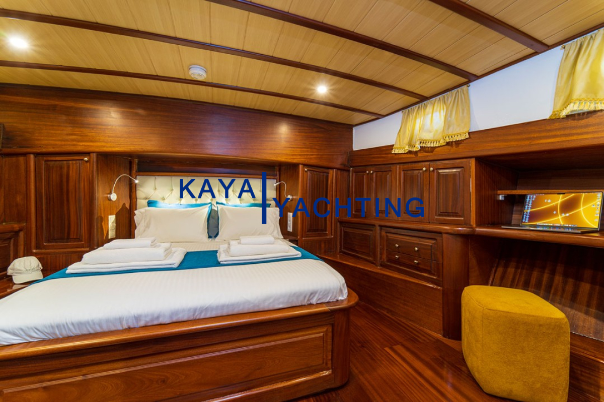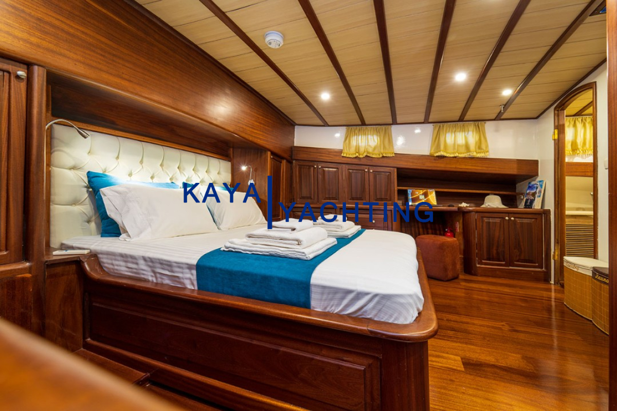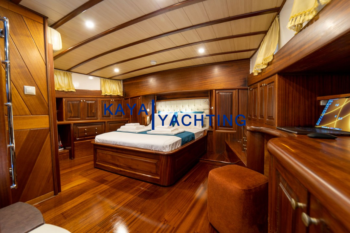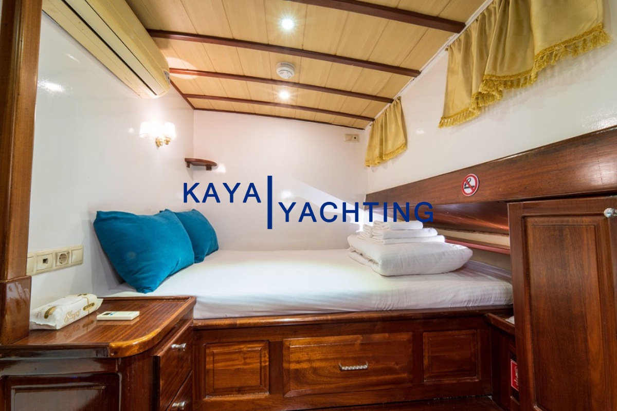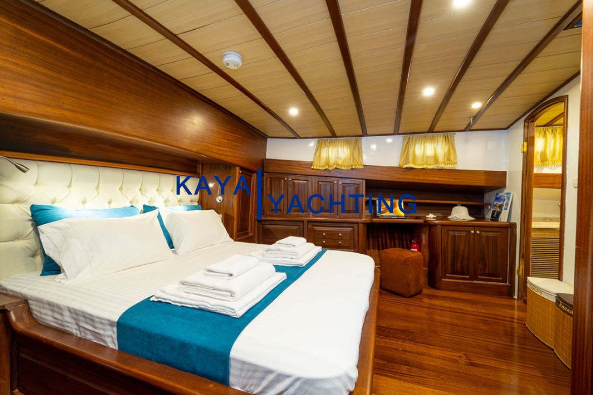 Gulet Elena'nın her bir kabini, misafirlerin rahatlığı ve konforu ön planda tutularak özenle tasarlandı. Her kabinde bulunan klima sistemi sayesinde, Akdeniz'in sıcak yaz günlerinde bile serin ve ferah bir ortamda dinlenebilirsiniz. Özel WC ve duş kabinli banyolar, mahremiyetinizi korurken konforunuzdan ödün vermemenizi sağlar. Şık ve klasik mobilyalarla döşenmiş kabinler, mavi yolculuğunuz boyunca size evinizin sıcaklığını ve huzurunu yaşatacak.