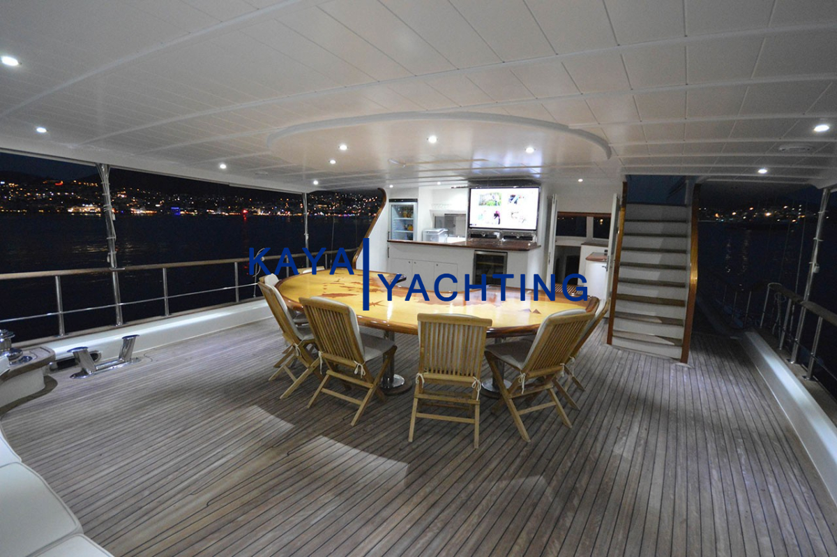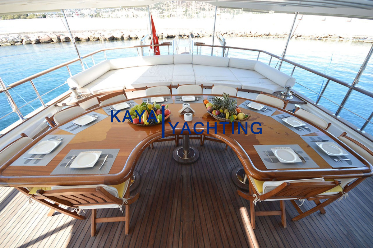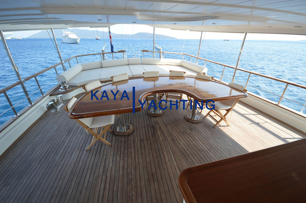 Arka Güverte: Teknenin kalbi olarak kabul edilen arka güverte, sosyal etkileşim ve yemek keyfi için ideal bir ortam sunar. Geniş yemek masası, tüm grubunuzu rahatça ağırlayacak kapasitededir ve açık havada unutulmaz yemekler yemeniz için mükemmel bir zemin oluşturur. Bir bar alanı ise serinletici içecekler ve kokteyller eşliğinde sohbetlerinize eşlik eder. Rahat dinlenme alanları ise yemek sonrası keyifli vakit geçirmeniz için idealdir.