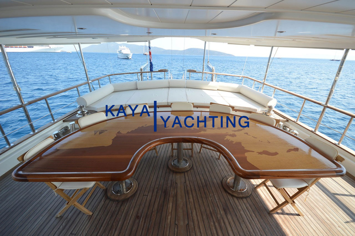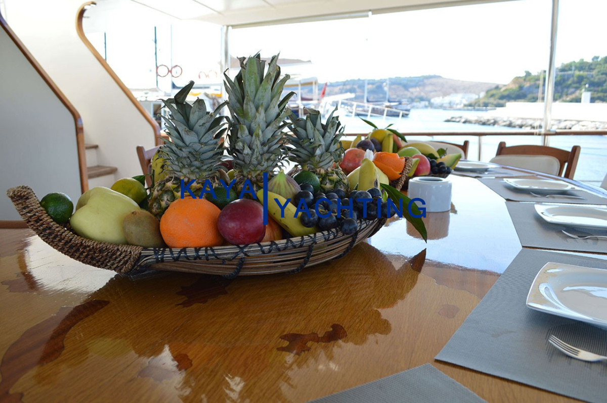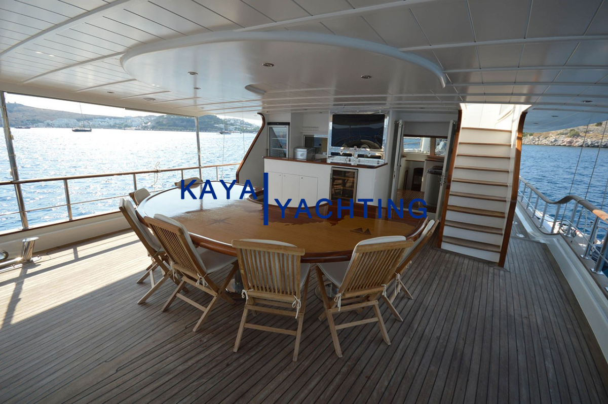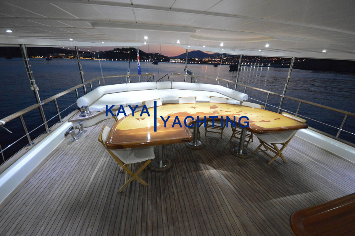 Arka Güverte: Teknenin kalbi olarak kabul edilen arka güverte, sosyal etkileşim ve yemek keyfi için ideal bir ortam sunar. Geniş yemek masası, tüm grubunuzu rahatça ağırlayacak kapasitededir ve açık havada unutulmaz yemekler yemeniz için mükemmel bir zemin oluşturur. Bir bar alanı ise serinletici içecekler ve kokteyller eşliğinde sohbetlerinize eşlik eder. Rahat dinlenme alanları ise yemek sonrası keyifli vakit geçirmeniz için idealdir.