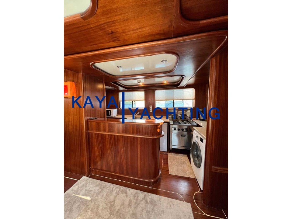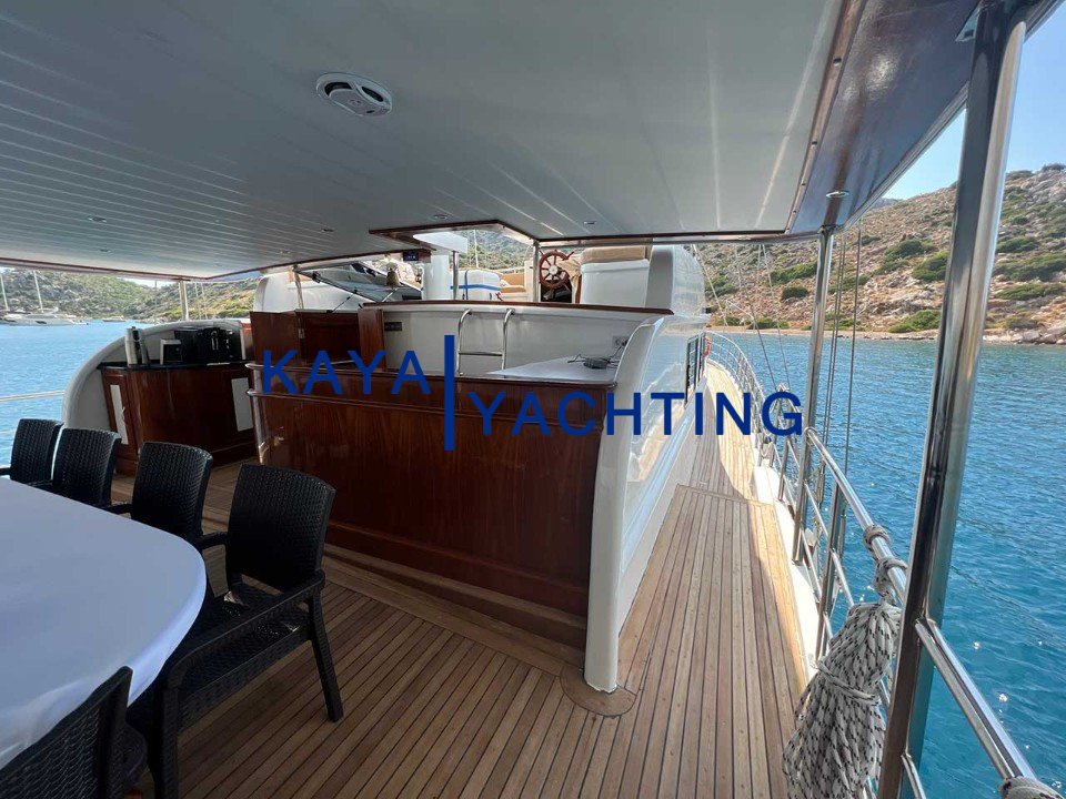 Arka Güverte (Havuzluk): Geniş yemek masası ve konforlu oturma grupları ile donatılmış bu alan, gün batımına karşı yenen uzun akşam yemeklerinin merkezidir.
