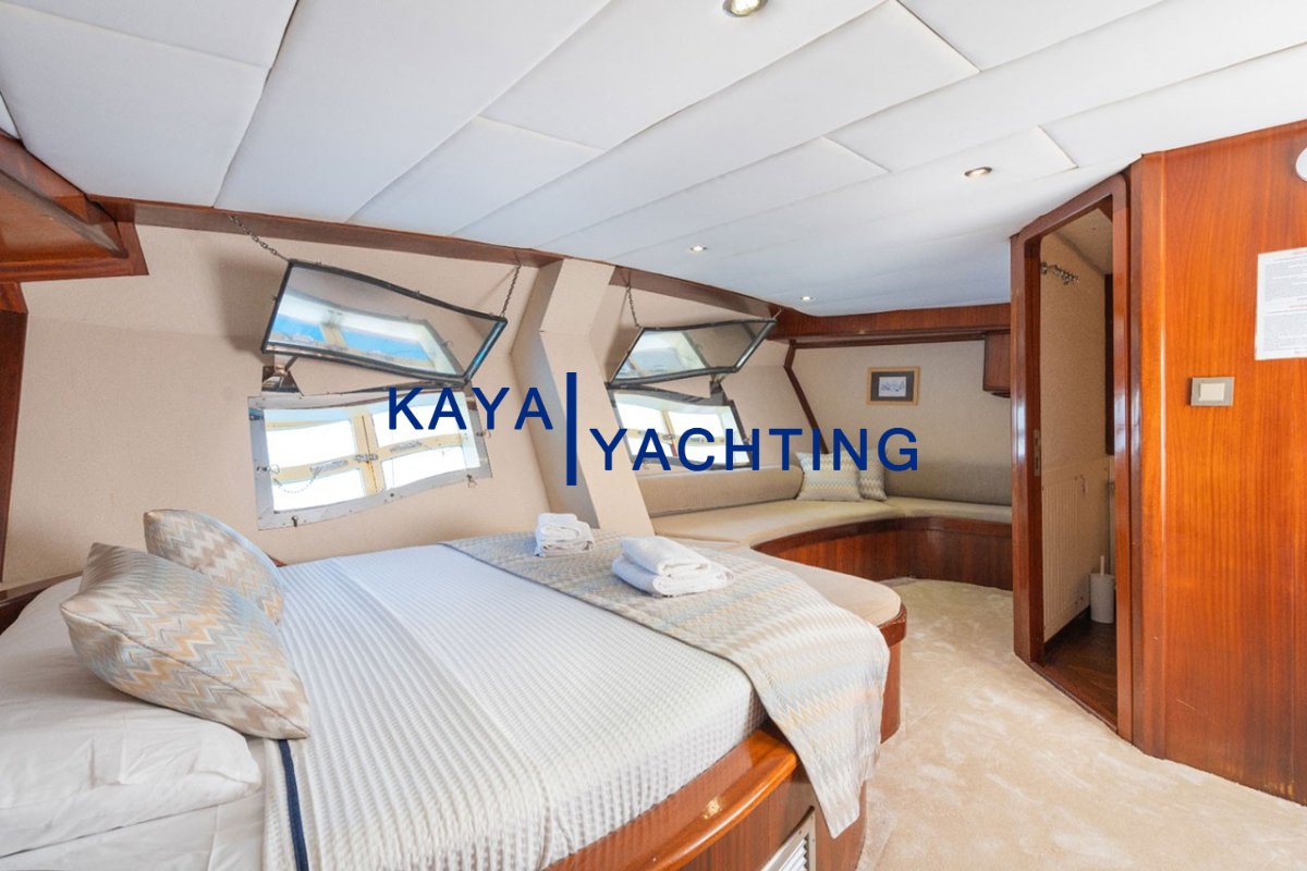 Alt Güverte Master Kabin (17.5 m²): Teknenin alt bölümünde yer alan bu devasa kabin, sessizlik ve geniş alan arayanlar için mükemmel bir sığınaktır.