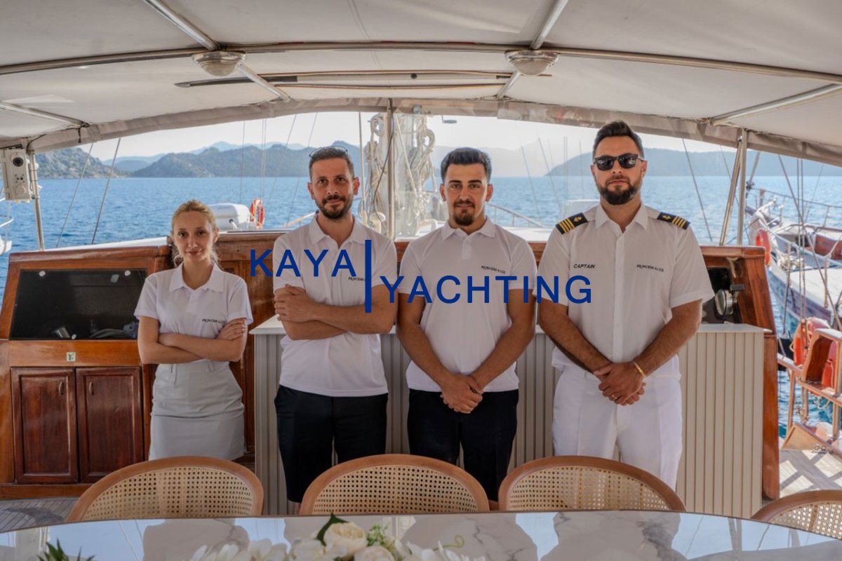 PRINCESS ALİZE’nin deneyimli mürettebatı (Kaptan, Aşçı ve Servis Personeli), yolculuğunuzun her anında kusursuz hizmet sağlar. Mürettebat, misafir memnuniyeti odaklı çalışarak, lezzetli yemeklerin sunumundan güverte düzenine kadar her ayrıntıyı titizlikle yönetir. Bu özenli hizmet, size sadece huzurlu ve size özel bir tatilin keyfini çıkarma sorumluluğunu bırakır.