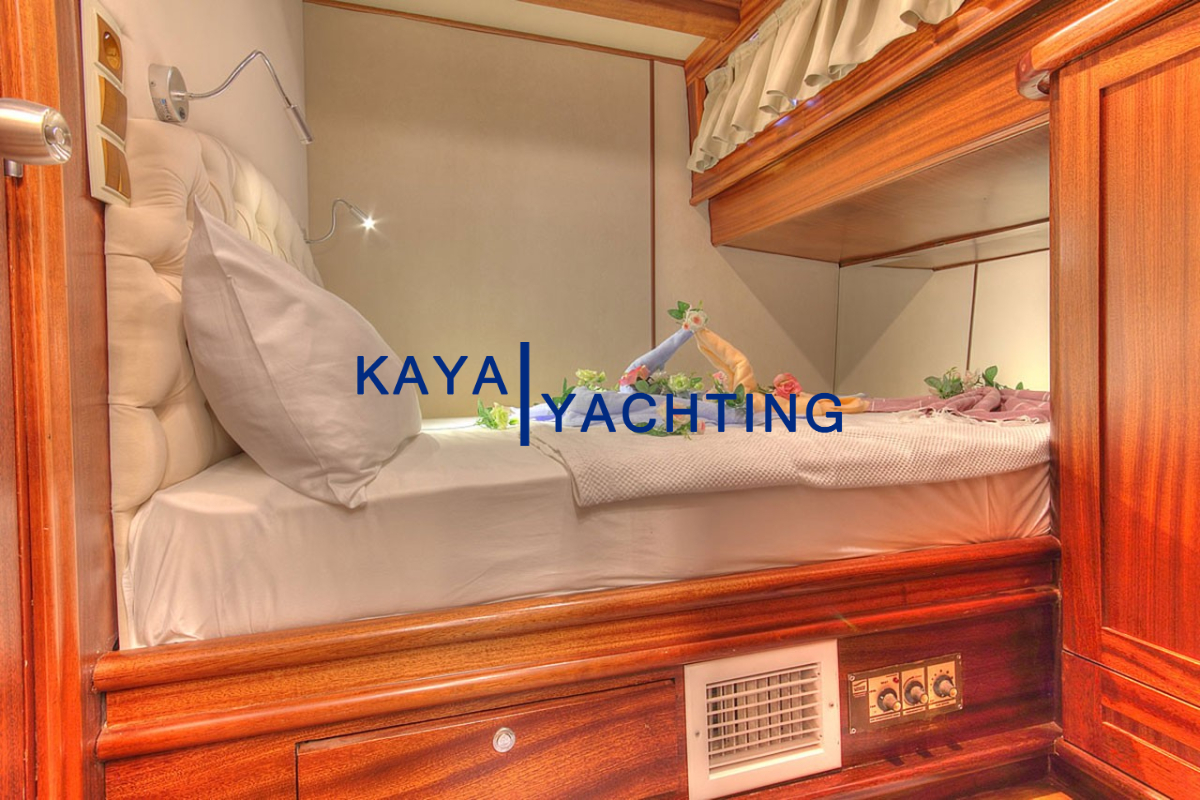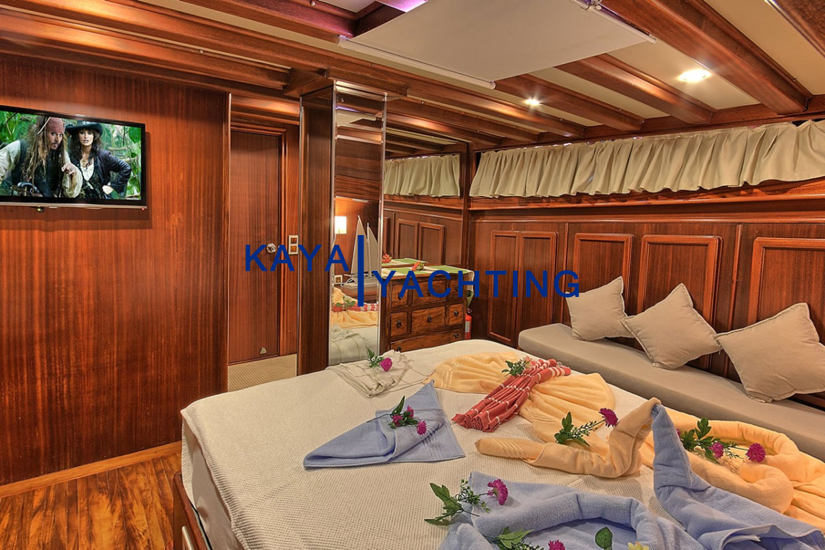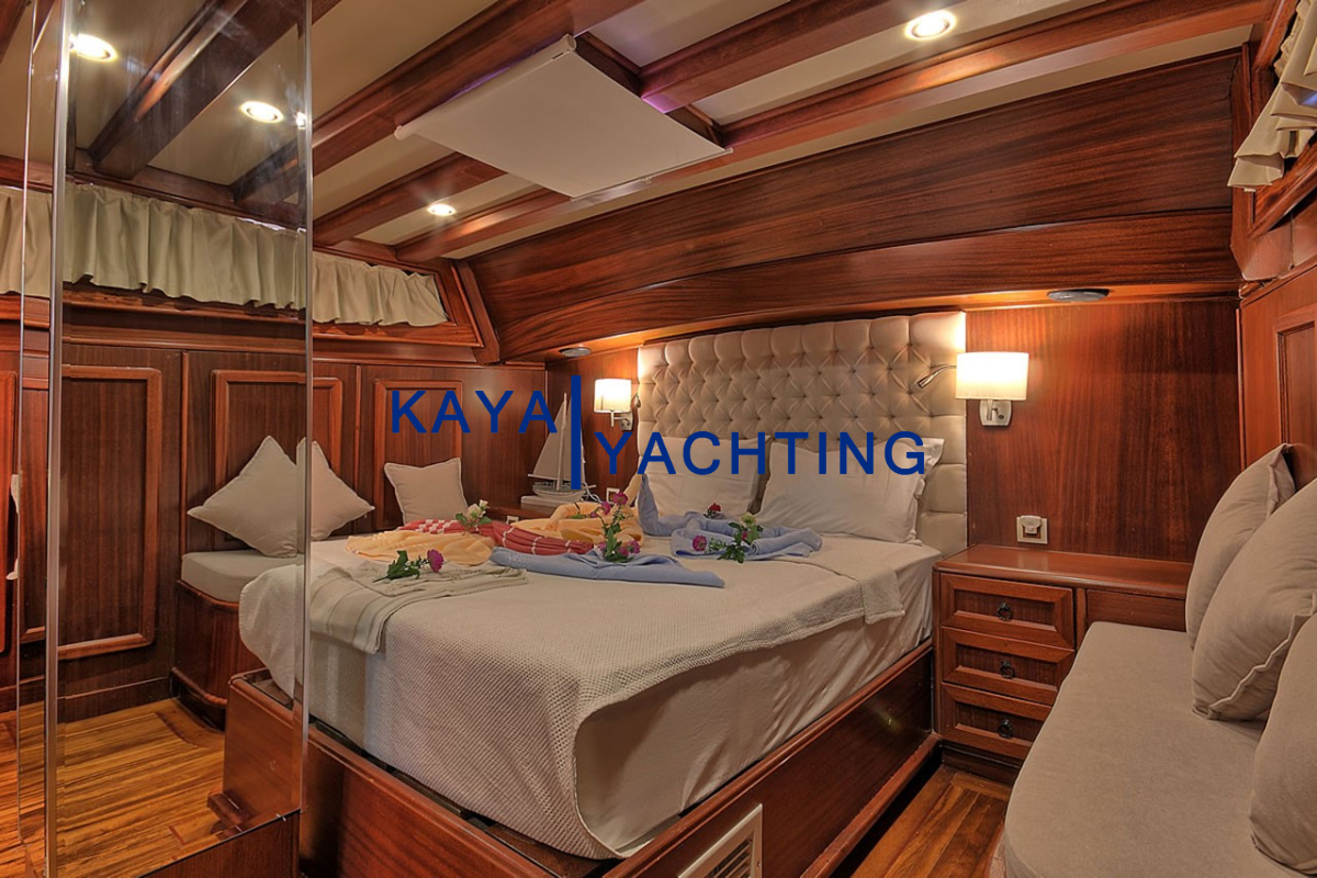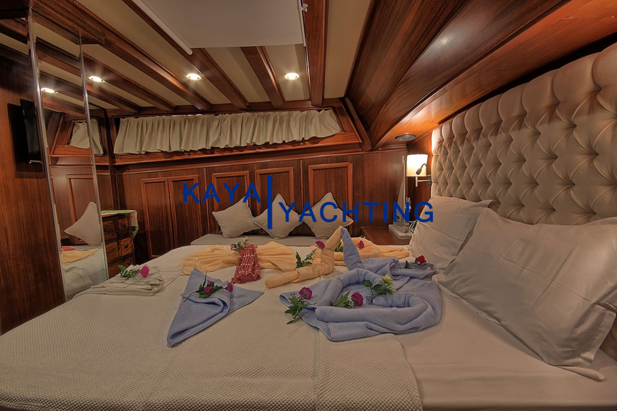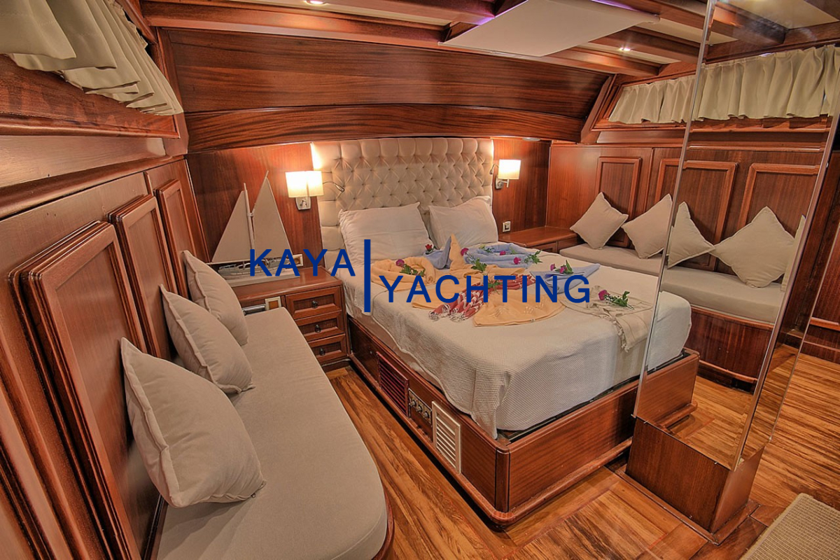 Gulet Romance, misafirlerinin rahatı ve mahremiyeti düşünülerek özel olarak tasarlanmıştır. Teknede bulunan 1 master ve 2 double kabin, toplam 6 kişilik konaklama imkanı sunar. Her bir kabin, uzun mavi yolculuklarda bile konforunuzdan ödün vermemeniz için özenle donatılmıştır. Kabinlerdeki klima sistemi, en sıcak yaz günlerinde dahi serin ve rahat bir uyku deneyimi sunar. Eğlence için her kabinde bulunan televizyonlar sayesinde dilediğiniz zaman keyifli vakit geçirebilirsiniz. Misafir mahremiyetini ve hijyeni ön planda tutan Gulet Romance'de, her kabinde özel ebeveyn banyosu bulunmaktadır. Bu detaylar, tatiliniz boyunca kendinizi özel ve rahat hissetmenizi sağlayacak, otel konforunu denizin ortasına taşıyacaktır. Geniş ve ferah kabinler, kişisel eşyalarınız için yeterli depolama alanı sunarken, şık dekorasyonu ile göz zevkinize de hitap eder.