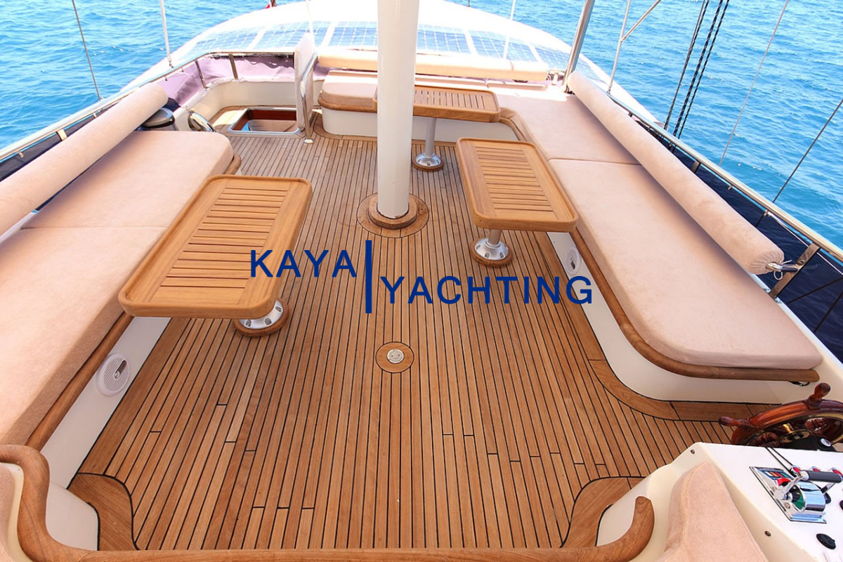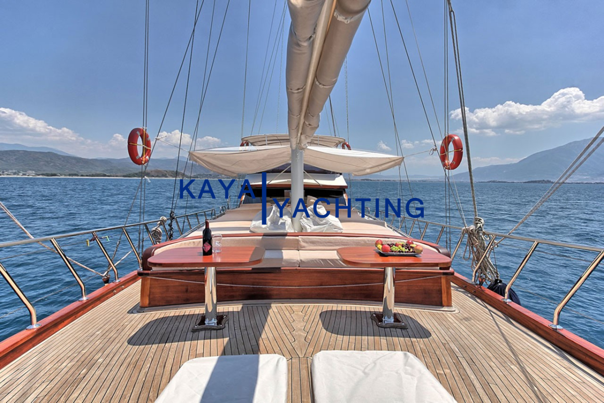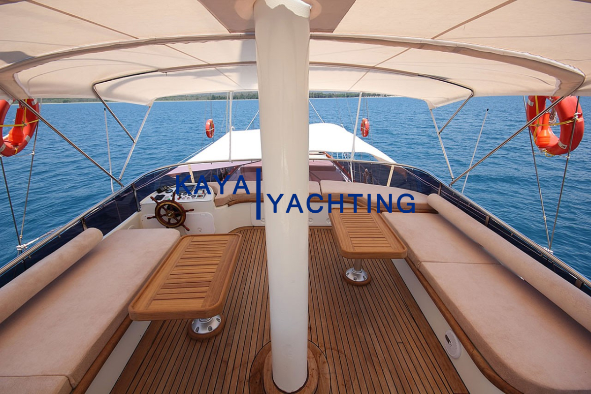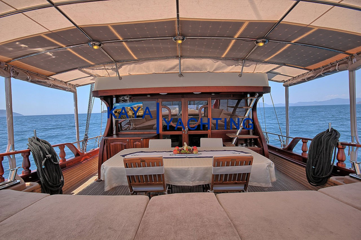 Gulet Romance’in tasarımı, denizde geçen zamanın keyfini en üst düzeye çıkarmak üzere düşünülmüştür. Teknede bulunan geniş yaşam alanları, hem dinlenmek hem de sosyalleşmek için bolca fırsat sunar. Ön güverte, geniş minderli alanlarıyla güneşlenmek, kitap okumak veya yıldızların altında sohbet etmek için idealdir. Burada, Ege’nin ve Akdeniz’in serin meltemini hissederken, sonsuz maviliğin tadını çıkarabilirsiniz. Arka güverte ise, genellikle yemek yeme ve günün yorgunluğunu atma alanı olarak kullanılır. Geniş yemek masası, keyifli sohbetlere ve lezzetli öğünlere ev sahipliği yaparken, konforlu oturma grupları gün içinde dinlenmek için birebirdir.