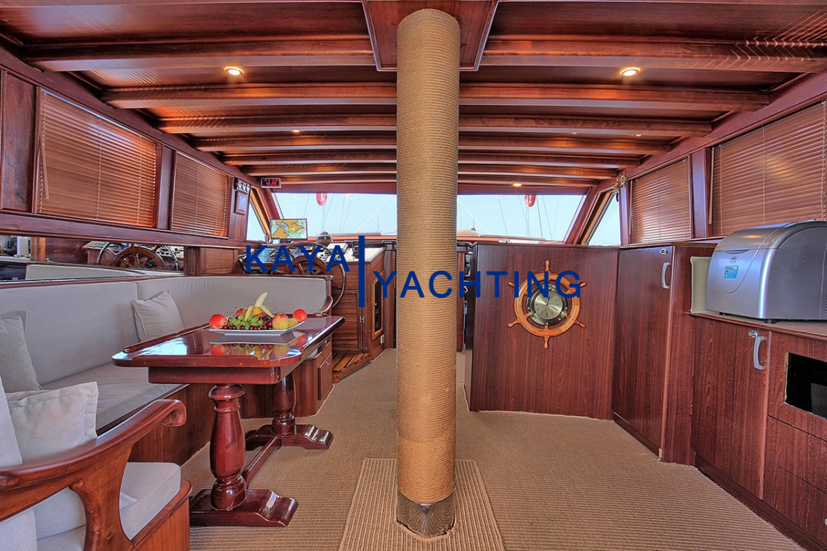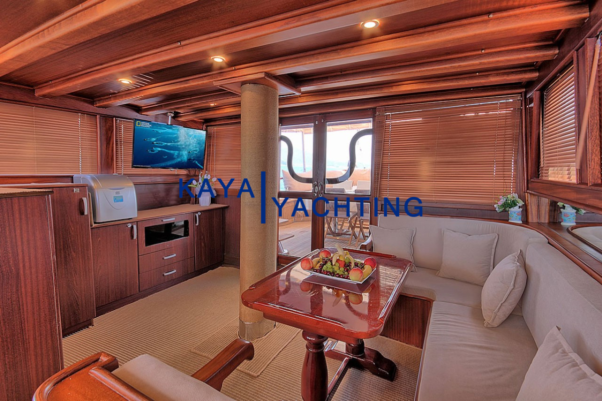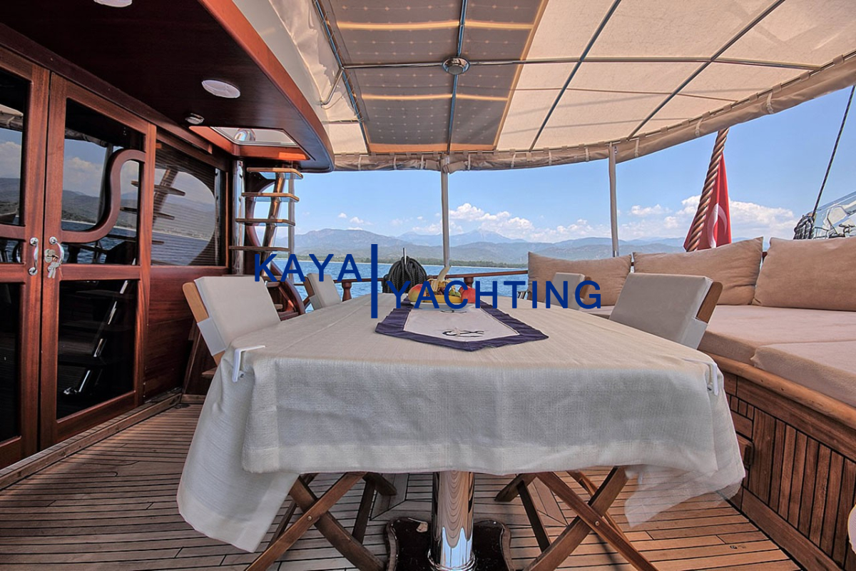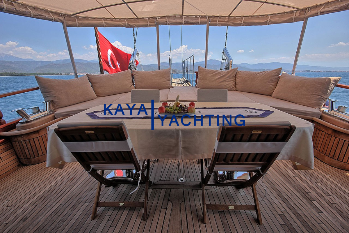 Gulet Romance’in tasarımı, denizde geçen zamanın keyfini en üst düzeye çıkarmak üzere düşünülmüştür. Teknede bulunan geniş yaşam alanları, hem dinlenmek hem de sosyalleşmek için bolca fırsat sunar. Ön güverte, geniş minderli alanlarıyla güneşlenmek, kitap okumak veya yıldızların altında sohbet etmek için idealdir. Burada, Ege’nin ve Akdeniz’in serin meltemini hissederken, sonsuz maviliğin tadını çıkarabilirsiniz. Arka güverte ise, genellikle yemek yeme ve günün yorgunluğunu atma alanı olarak kullanılır. Geniş yemek masası, keyifli sohbetlere ve lezzetli öğünlere ev sahipliği yaparken, konforlu oturma grupları gün içinde dinlenmek için birebirdir.